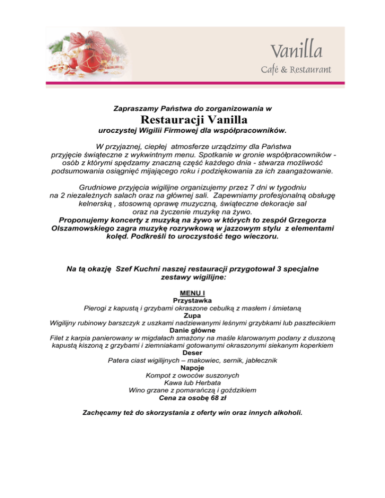 Zapraszamy Państwa do zorganizowania w Restauracji Vanilla uroczystej Wigilii Firmowej dla współpracowników. W przyjaznej, ciepłej atmosferze urządzimy dla Państwa przyjęcie świąteczne z wykwintnym menu. Spotkanie w gronie współpracowników osób z którymi spędzamy znaczną część każdego dnia - stwarza możliwość podsumowania osiągnięć mijającego roku i podziękowania za ich zaangażowanie. Grudniowe przyjęcia wigilijne organizujemy przez 7 dni w tygodniu na 2 niezależnych salach oraz na głównej sali. Zapewniamy profesjonalną obsługę kelnerską , stosowną oprawę muzyczną, świąteczne dekoracje sal oraz na życzenie muzykę na żywo. Proponujemy koncerty z muzyką na żywo w których to zespół Grzegorza Olszamowskiego zagra muzykę rozrywkową w jazzowym stylu z elementami kolęd. Podkreśli to uroczystość tego wieczoru. Na tą okazję Szef Kuchni naszej restauracji przygotował 3 specjalne zestawy wigilijne: MENU I Przystawka Pierogi z kapustą i grzybami okraszone cebulką z masłem i śmietaną Zupa Wigilijny rubinowy barszczyk z uszkami nadziewanymi leśnymi grzybkami lub pasztecikiem Danie główne Filet z karpia panierowany w migdałach smażony na maśle klarowanym podany z duszoną kapustą kiszoną z grzybami i ziemniakami gotowanymi okraszonymi siekanym koperkiem Deser Patera ciast wigilijnych – makowiec, sernik, jabłecznik Napoje Kompot z owoców suszonych Kawa lub Herbata Wino grzane z pomarańczą i goździkiem Cena za osobę 68 zł Zachęcamy też do skorzystania z oferty win oraz innych alkoholi. MENU II Przystawka I Oryginalny matyjas holenderski z cebulą i jabłkiem prażonym Przystawka II Wybór pierogów: ruskie z kapustą i grzybami Zupa Zupa z leśnych grzybów z warzywami Danie główne Pieczony łosoś na sosie porowym podany z ziemniakami pieczonymi i gotowanym brokułem Deser Pieczone jabłko z bakaliami i calvadosem na sosie piernikowym Napoje Kompot z owoców suszonych Kawa lub Herbata Wino grzane z pomarańczą i goździkiem Cena za osobę 78 zł MENU III Przystawka I Bożonarodzeniowy filet z karpia w galarecie Przystawka II Tatar ze śledzia z korniszonem przekładany plastrami ziemniaka z koperkowym vinegreatem Zupa Zupa krem z borowików z prażonymi płatkami migdałów Danie główne /podawane półmiskowo/ Karp panierowany smażony na maśle Łosoś gotowany o aromacie ziołowym Pieczona roladka z dorsza ze szpinakiem Ziemniaki gotowane z koperkiem, Sałatka żydowska Pierogi ruskie, Pierogi z kapustą i grzybami Duszona kapusta z grzybami, Warzywa gotowane o aromacie ziołowym Surówka z kiszonej kapusty z marchewką i koperkiem Sos cytrynowy, Sos śmietanowo-kurkowy Deser Puszyste ciasto korzenne przekładane kremem cynamonowym podane z śnieżną kulą lodową Napoje Kompot z owoców suszonych Kawa lub Herbata Wino grzane z pomarańczą i goździkiem Cena za osobę 108 zł Zachęcamy też do skorzystania z oferty win oraz innych alkoholi. Podane menu wigilijne jest propozycją, możecie Państwo również skomponować posiłek na bazie naszej karty. Możemy przygotować dla Państwa również dania podane półmiskowo, zimną płytę i open bar Restauracja Vanilla Opole .Ozimska 181 budynek Quatrum wjazd od Piotrkowskiej Rezerwacje tel.723 599 255 Organizujemy bankiety firmowe , kolacje wigilijne, szkolenia oraz prywatne imprezy okolicznościowe z salami na wyłączność. www.restauracjavanilla.pl