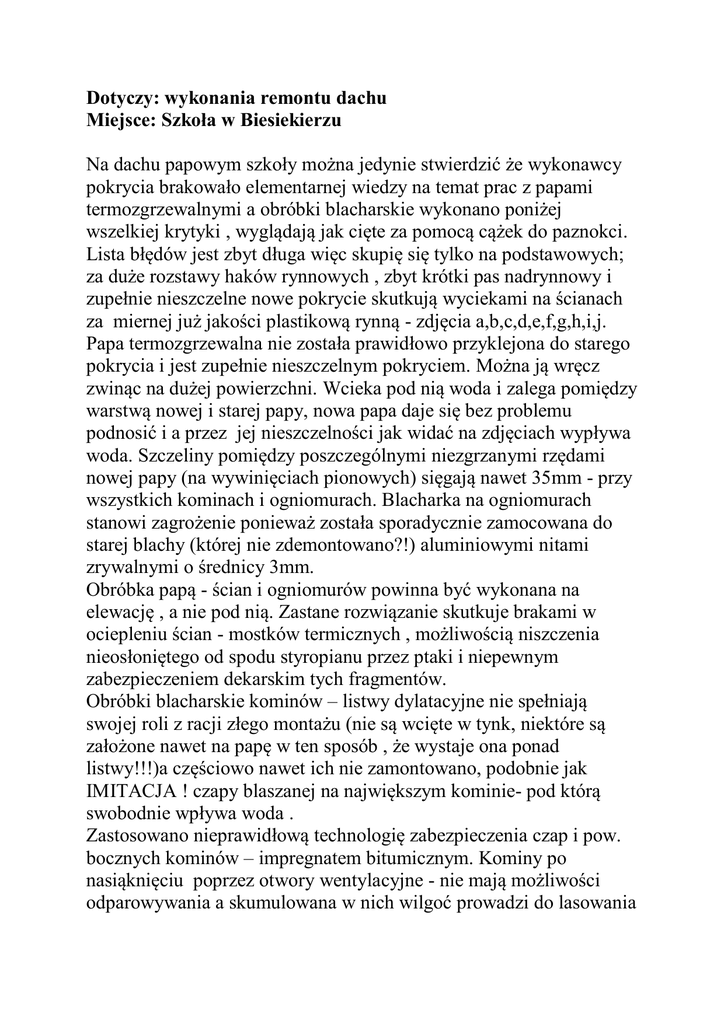Dotyczy: wykonania remontu dachu Miejsce: Szkoła w Biesiekierzu Na dachu papowym szkoły można jedynie stwierdzić że wykonawcy pokrycia brakowało elementarnej wiedzy na temat prac z papami termozgrzewalnymi a obróbki blacharskie wykonano poniżej wszelkiej krytyki , wyglądają jak cięte za pomocą cążek do paznokci. Lista błędów jest zbyt długa więc skupię się tylko na podstawowych; za duże rozstawy haków rynnowych , zbyt krótki pas nadrynnowy i zupełnie nieszczelne nowe pokrycie skutkują wyciekami na ścianach za miernej już jakości plastikową rynną - zdjęcia a,b,c,d,e,f,g,h,i,j. Papa termozgrzewalna nie została prawidłowo przyklejona do starego pokrycia i jest zupełnie nieszczelnym pokryciem. Można ją wręcz zwinąc na dużej powierzchni. Wcieka pod nią woda i zalega pomiędzy warstwą nowej i starej papy, nowa papa daje się bez problemu podnosić i a przez jej nieszczelności jak widać na zdjęciach wypływa woda. Szczeliny pomiędzy poszczególnymi niezgrzanymi rzędami nowej papy (na wywinięciach pionowych) sięgają nawet 35mm - przy wszystkich kominach i ogniomurach. Blacharka na ogniomurach stanowi zagrożenie ponieważ została sporadycznie zamocowana do starej blachy (której nie zdemontowano?!) aluminiowymi nitami zrywalnymi o średnicy 3mm. Obróbka papą - ścian i ogniomurów powinna być wykonana na elewację , a nie pod nią. Zastane rozwiązanie skutkuje brakami w ociepleniu ścian - mostków termicznych , możliwością niszczenia nieosłoniętego od spodu styropianu przez ptaki i niepewnym zabezpieczeniem dekarskim tych fragmentów. Obróbki blacharskie kominów – listwy dylatacyjne nie spełniają swojej roli z racji złego montażu (nie są wcięte w tynk, niektóre są założone nawet na papę w ten sposób , że wystaje ona ponad listwy!!!)a częściowo nawet ich nie zamontowano, podobnie jak IMITACJA ! czapy blaszanej na największym kominie- pod którą swobodnie wpływa woda . Zastosowano nieprawidłową technologię zabezpieczenia czap i pow. bocznych kominów – impregnatem bitumicznym. Kominy po nasiąknięciu poprzez otwory wentylacyjne - nie mają możliwości odparowywania a skumulowana w nich wilgoć prowadzi do lasowania i rozwarstwiania się cegły. Poprzez takie rozwiązanie osiągnięto efekt dokładnie odwrotny do zamierzonego. Wpuszczenie końcówki rynny (na łączniku) w elewację styropianową skutkuje podczas przepełnienia jej (w przypadku zatkania leja, bardzo dużego opadu, lub okresowego zamarzania wody w rynnie) wylewaniem wody za styropian i zawilgoceniem scian . Do zawilgocenia ścian może się też przyczynić fakt , że wiele parapetów na nowej elewacji szkoły jest osadzonych bez wymaganego spadku lub ze spadkiem w stronę okna. Poza tym niektóre parapety nie są dokładnie podklejone a pustka pod nimi spowodowała ich obniżenie i rozszczelnienie na połączeniu z oknami. Znajdują się tam szczeliny, którymi woda z okien wpływa pod elewację styropianową. Należy zauważyć , że zamakająca ściana zamknięta elewacją ze styropianu nie ma praktycznie możliwości wysychania. Podobnie dzieje się z zawilgoconymi sufitami szkoły które nie mają jak odparować poprzez pokrycie papowe i są zagrożone zagrzybieniem. Biorąc pod uwagę stan ,,nowego pokrycia” , niezastosowanie kominków wentylacyjnych podczas prac remontowych dla osuszenia – odgazowania zawilgoconego wcześniej stropodachu , można stwierdzić nie tylko brak elementarnej wiedzy wykonawcy o technice dekarskiej, ale także rażącą niestaranność prowadzącą do kompletnego zmarnowania pieniędzy inwestora. Nowe pokrycie dachowe na głównym budynku szkoły nie spełnia w ogóle swojego zadania. Fakt, że woda wręcz nie leje się do wnętrza szkoły zawdzięczać można jedynie w miarę szczelnemu pokryciu pierwotnemu znajdującemu się pod spodem. Zastanawiające jest to czy prace te zostały faktycznie poddane odbiorowi technicznemu , nie wspominając o jakże ważnym w przypadku wydatków publicznych – przeglądzie gwarancyjnym a jeżeli tak to - na jakiej podstawie uznano w.w. prace za dobrze wykonane. Wniosek taki jest jak najbardziej oczywisty ponieważ tak wyglądającego nowego pokrycia - nie zatwierdziłby nawet laik.