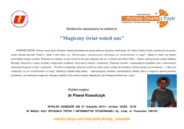Serdecznie zapraszamy na wykład pt. "Magiczny świat wokół nas" STRESZCZENIE: Pewien znany pisarz literatury fantastycznonaukowej (pomysłodawca łączności satelitarnej), Sir Arthur Charles Clarke, postulował trzy prawa, zwane obecnie prawami Clarke’a. Jedno z nich mówi, że: „Wystarczająco zaawansowana technologia jest nieodróżnialna od magii”. Zdanie to stanie się mottem przewodnim mojego wykładu. Postaram się wykazać, że nasz świat jest tak samo magiczny jak ten, w którym żyje Harry Potter – bohater cyklu powieści Joanne Kathleen Rowling. Opowiem o czapce niewidce, magicznych różdżkach, mitycznych istotach i teleportacji. Wspomnę również o samojezdnych pojazdach oraz o dziwacznych maszynach liczących a może i myślących… Powiem o technologii, która jest wokół nas, która często wydaje się normalna, a której niestety nie rozumiemy… a skoro nie rozumiemy, to jest nieodróżnialna od magii. Ilustracją wykładu będą pokazy – zaprezentujemy działanie czarodziejskiej różdżki, która w magiczny sposób przesuwa przedmioty, oraz pokażemy magicznie znikającą szklankę. Rolą widowni będzie odgadnięcie, jak działają przedstawione „czary”. Wykład wygłosi dr Paweł Kowalczyk WYKŁAD ODBĘDZIE SIĘ 27 listopada 2013 r. (środa), GODZ. 10:30 W MAŁEJ AULI WYDZIAŁU FIZYKI I INFORMATYKI STOSOWANEJ UŁ, Łódź, ul. Pomorska 149/153 merlin.phys.uni.lodz.pl/wyklady_otwarte/