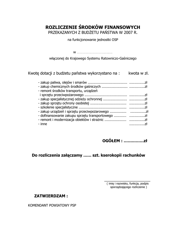 ROZLICZENIE ŚRODKÓW FINANSOWYCH PRZEKAZANYCH Z BUDŻETU PAŃSTWA W 2007 R. na funkcjonowanie jednostki OSP w ………………………………..…..….. włączonej do Krajowego Systemu Ratowniczo-Gaśniczego Kwotę dotacji z budżetu państwa wykorzystano na : - zakup paliwa, olejów i smarów ...................................... - zakup chemicznych środków gaśniczych ......................... - remont środków transportu, urządzeń i sprzętu przeciwpożarowego ......................................... - zakup specjalistycznej odzieży ochronnej ....................... - zakup sprzętu ochrony osobistej ................................... - szkolenie specjalistyczne .............................................. - zakup urządzeń i sprzętu przeciwpożarowego ................ - dofinansowanie zakupu sprzętu transportowego ............ - remont i modernizacja obiektów i strażnic ..................... - inne kwota w zł. ...............zł ...............zł ...............zł ...............zł ...............zł ...............zł ...............zł ...............zł ...............zł ...............zł OGÓŁEM : ……………zł Do rozliczenia załączamy …… szt. kserokopii rachunków _____________________ ( imię i nazwisko, funkcja, podpis sporządzającego rozliczenie ) ZATWIERDZAM : KOMENDANT POWIATOWY PSP