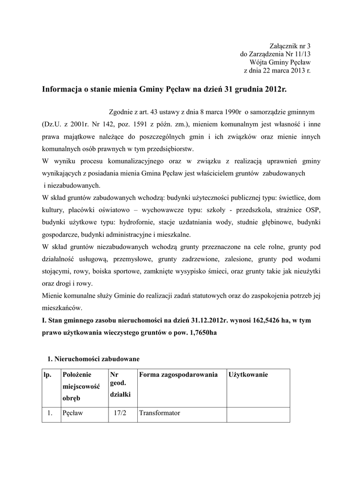 Informacja o stanie mienia Gminy Pęcław na dzień 31 grudnia 2012r.