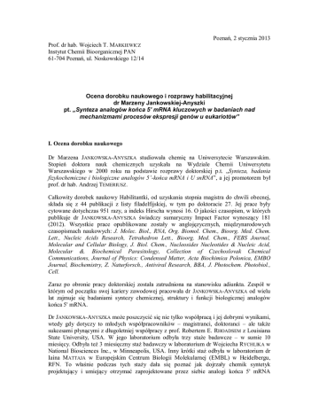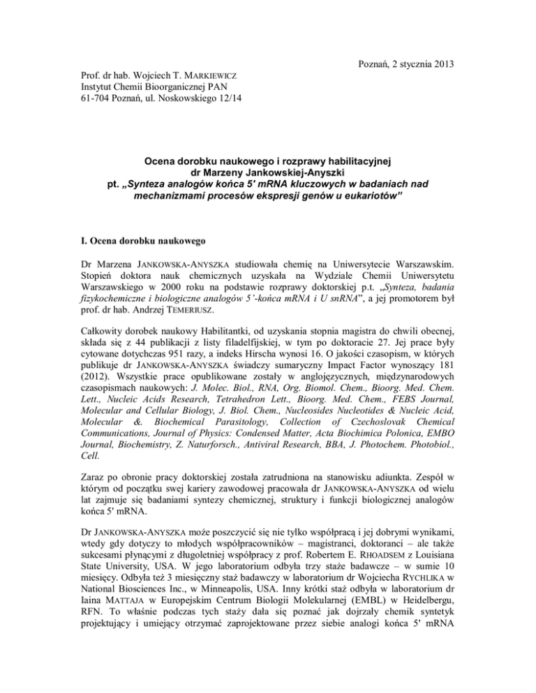 Poznań, 2 stycznia 2013 Prof. dr hab. Wojciech T. MARKIEWICZ Instytut Chemii Bioorganicznej PAN 61-704 Poznań, ul. Noskowskiego 12/14 Ocena dorobku naukowego i rozprawy habilitacyjnej dr Marzeny Jankowskiej-Anyszki pt. „Synteza analogów końca 5' mRNA kluczowych w badaniach nad mechanizmami procesów ekspresji genów u eukariotów” I. Ocena dorobku naukowego Dr Marzena JANKOWSKA-ANYSZKA studiowała chemię na Uniwersytecie Warszawskim. Stopień doktora nauk chemicznych uzyskała na Wydziale Chemii Uniwersytetu Warszawskiego w 2000 roku na podstawie rozprawy doktorskiej p.t. „Synteza, badania fizykochemiczne i biologiczne analogów 5’-końca mRNA i U snRNA”, a jej promotorem był prof. dr hab. Andrzej TEMERIUSZ. Całkowity dorobek naukowy Habilitantki, od uzyskania stopnia magistra do chwili obecnej, składa się z 44 publikacji z listy filadelfijskiej, w tym po doktoracie 27. Jej prace były cytowane dotychczas 951 razy, a indeks Hirscha wynosi 16. O jakości czasopism, w których publikuje dr JANKOWSKA-ANYSZKA świadczy sumaryczny Impact Factor wynoszący 181 (2012). Wszystkie prace opublikowane zostały w anglojęzycznych, międzynarodowych czasopismach naukowych: J. Molec. Biol., RNA, Org. Biomol. Chem., Bioorg. Med. Chem. Lett., Nucleic Acids Research, Tetrahedron Lett., Bioorg. Med. Chem., FEBS Journal, Molecular and Cellular Biology, J. Biol. Chem., Nucleosides Nucleotides & Nucleic Acid, Molecular &. Biochemical Parasitology, Collection of Czechoslovak Chemical Communications, Journal of Physics: Condensed Matter, Acta Biochimica Polonica, EMBO Journal, Biochemistry, Z. Naturforsch., Antiviral Research, BBA, J. Photochem. Photobiol., Cell. Zaraz po obronie pracy doktorskiej została zatrudniona na stanowisku adiunkta. Zespół w którym od początku swej kariery zawodowej pracowała dr JANKOWSKA-ANYSZKA od wielu lat zajmuje się badaniami syntezy chemicznej, struktury i funkcji biologicznej analogów końca 5' mRNA. Dr JANKOWSKA-ANYSZKA może poszczycić się nie tylko współpracą i jej dobrymi wynikami, wtedy gdy dotyczy to młodych współpracowników – magistranci, doktoranci – ale także sukcesami płynącymi z długoletniej współpracy z prof. Robertem E. RHOADSEM z Louisiana State University, USA. W jego laboratorium odbyła trzy staże badawcze – w sumie 10 miesięcy. Odbyła też 3 miesięczny staż badawczy w laboratorium dr Wojciecha RYCHLIKA w National Biosciences Inc., w Minneapolis, USA. Inny krótki staż odbyła w laboratorium dr Iaina MATTAJA w Europejskim Centrum Biologii Molekularnej (EMBL) w Heidelbergu, RFN. To właśnie podczas tych staży dała się poznać jak dojrzały chemik syntetyk projektujący i umiejący otrzymać zaprojektowane przez siebie analogi końca 5' mRNA zawierające różnorodnie podstawione reszty guanylowe. Jej współdziałanie z biochemikami na etapie projektowania było niezwykle istotne. Poświadczają to listy współautorów publikacji opisujące ich i Habilitantki udziały w poszczególnych publikacjach. W takich sytuacjach chemik organik, rozumiejący reaktywność i właściwości chemiczne badanej przez siebie klasy związków może zaprojektować całe spektrum związków, które posłużą następnie do rozwiązania problemu biologicznego – w tym przypadku m.in. określeniu molekularnych mechanizmów rozpoznawania końca mRNA na etapie inicjacji biosyntezy białka i dojrzewania kapu (metylowanie enzymatyczne) u różnych organizmów eukariotycznych. W trakcie staży Habilitantka zapoznała się także w praktyce z zaawansowanymi metodami badania oddziaływań syntetyzowanych przez siebie analogów końca 5’-mRNA z białkami wchodzącymi w skład kompleksów inicjatorowych. Dr Marzena JANKOWSKA-ANYSZKA brała aktywny udział w licznych konferencjach międzynarodowych, krajowych i zagranicznych, przedstawiając referat i bardzo liczne komunikaty – 61 doniesień naukowych. Do rozprawy habilitacyjnej dr Marzena JANKOWSKA-ANYSZKA wybrała 8 z 44 publikacji. Jest to cykl prac poświęconych syntezie analogów końca 5' mRNA i ich wykorzystaniu w badaniach mechanizmów procesów ekspresji genów u eukariontów. W 5 z tych publikacji jest autorem korespondującym. Prace te zostały opublikowane w anglojęzycznych, międzynarodowych czasopismach naukowych: J. Molec. Biol., RNA, Org. Biomol. Chem., Bioorg. Med. Chem. Lett. (2), Nucleic Acids Research, Tetrahedron Lett., Bioorg. Med. Chem. O randze czasopism świadczy sumaryczny IF wynoszący 33. Udział Habilitantki w przygotowaniu współautorskich publikacji był znaczący i został precyzyjnie określony w przedstawionej dokumentacji oraz potwierdzony oświadczeniami współautorów. Współautorzy precyzyjnie określili swoje zaangażowanie w przygotowanie wspólnych publikacji. Dr Marzena JANKOWSKA-ANYSZKA uzyskała w czasie swojej pracy zawodowej dwukrotnie Nagrodę Dydaktyczną Rady Wydziału Chemii Uniwersytetu Warszawskiego (lata 2005 i 2011), uwzględniające jej zaangażowanie m.in. w opracowanie nowych ćwiczeń na zajęciach laboratoryjnych z biochemii. Uzyskała także Nagrodę Dziekana Wydziału Chemii z okazji Dnia Edukacji Narodowej (1996). Dr Marzena JANKOWSKA-ANYSZKA była wykonawcą w kilkunastu projektach badawczych finansowanych zarówno z funduszy krajowych jak i zagranicznych (KBN, MNiSW, PolskoAmerykański Fundusz im. Marii Skłodowskiej-Curie). Nie była kierownikiem żadnego projektu i wynika to najprawdopodobniej z faktu bardzo dobrego finansowania zespołu od lat zdobywającego bardzo skutecznie środki finansowe na badania analogów kapu. Habilitantka prowadzi zajęcia dydaktyczne dla studentów Uniwersytetu Warszawskiego. Zorganizowała laboratoryjne zajęcia kursowe z biochemii dla studentów Wydziału Chemii w ramach przedmiotu „Laboratorium Biochemia”. Przygotowanie obejmowało opracowanie programu zajęć, opracowanie wszystkich ćwiczeń, zorganizowanie warsztatu i wyposażenia laboratorium. Miało więc charakter kompl