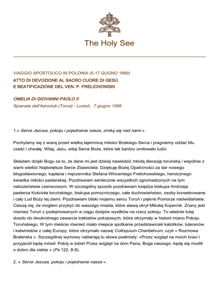 The Holy See VIAGGIO APOSTOLICO IN POLONIA (5-17 GUGNO 1999) ATTO DI DEVOZIONE AL SACRO CUORE DI GESÙ E BEATIFICAZIONE DEL VEN. P. FRELICHOWSKI OMELIA DI GIOVANNI PAOLO II Spianata dell'Aeroclub (Toruń) - Lunedì, 7 giugno 1999 1.« Serce Jezusa, pokoju i pojednanie nasze, zmiłuj się nad nami ». Pochylamy się z wiarą przed wielką tajemnicą miłości Boskiego Serca i pragniemy oddać Mu cześć i chwałę. Witaj, Jezu, witaj Serce Boże, które tak bardzo umiłowało ludzi. Składam dzięki Bogu za to, że dane mi jest dzisiaj nawiedzić młodą diecezję toruńską i wspólnie z wami wielbić Najświętsze Serce Zbawiciela. Dziękuję Bożej Opatrzności za dar nowego błogosławionego, kapłana i męczennika Stefana Wincentego Frelichowskiego, heroicznego świadka miłości pasterskiej. Pozdrawiam serdecznie wszystkich zgromadzonych na tym nabożeństwie czerwcowym. W szczególny sposób pozdrawiam księdza biskupa Andrzeja pasterza Kościoła toruńskiego, biskupa pomocniczego, całe duchowieństwo, osoby konsekrowane i cały Lud Boży tej ziemi. Pozdrawiam bliski mojemu sercu Toruń i piękne Pomorze nadwiślańskie. Cieszę się, że mogłem przybyć do waszego miasta, które sławą okrył Mikołaj Kopernik. Znany jest również Toruń z podejmowanych w ciągu dziejów wysiłków na rzecz pokoju. To właśnie tutaj doszło do dwukrotnego zawarcia traktatów pokojowych, które otrzymały w historii miano Pokoju Toruńskiego. W tym mieście również miało miejsce spotkanie przedstawicieli katolików, luteranów i kalwinistów z całej Europy, które otrzymało nazwę Colloquium Charitativum, czyli « Rozmowa Braterska ». Szczególnej wymowy nabierają tu słowa psalmisty: «Przez wzgląd na moich braci i przyjaciół będę mówił: Pokój w tobie! Przez wzgląd na dom Pana, Boga naszego, będę się modlił o dobro dla ciebie » (Ps 122, 8-9). 2. « Serce Jezusa, pokoju i pojednanie nasze ». 2 Oto Serce Odkupiciela czytelny znak Jego miłości i niewyczerpane źródło prawdziwego pokoju. W Nim « mieszka cała Pełnia: Bóstwo, na sposób ciała » (Kol 2, 9). Pokój, który przynosi na ziemię Chrystus, pochodzi właśnie z tej Pełni i z tej Miłości. Jest darem miłującego Boga, który ukochał człowieka w Sercu swego Jednorodzonego Syna. « On jest naszym pokojem » (Po. Ef 2, 14) woła św. Paweł. Tak, Jezus jest pokojem, jest naszym pojednaniem. To On zburzył wrogość, jaka powstała po grzechu człowieka i pojednał z Ojcem wszystkich ludzi przez śmierć na krzyżu. Na Golgocie zostało przebite włócznią Serce Chrystusa na znak Jego zupełnego daru z siebie, miłości ofiarnej, zbawczej, którą e do końca nas umiłował », budując (Por J 13, 1) fundament pod przyjaźń Boga z ludźmi. Oto dlaczego pokój Chrystusa jest inny niż ten, jaki wyobraża sobie świat. Zwracając się do Apostołów w wieczerniku przed swoją męką i śmiercią, Chrystus powiedział wyraźnie: « Pokój zostawiam wam, pokój mój daję wam. Nie tak jak daje świat, Ja wam daję » (J 14, 27). Podczas gdy ludzie rozumieli pokój przede wszystkim na płaszczyźnie doczesnej i zewnętrznej, Chrystus mówi, że wypływa on z porządku nadprzyrodzonego, że jest wynikiem zjednoczenia z Bogiem w miłości. Kościół nieustannie żyje Ewangelią pokoju. Głosi ją wszystkim ludom i narodom. Niestrudzenie ukazuje drogi pokoju i pojednania. Wprowadza pokój, burząc mury uprzedzeń i wrogości między ludźmi. Czyni to przede wszystkim przez sakrament pokuty i pojednania, niosąc łaskę Bożego miłosierdzia i przebaczenia, dociera do samych korzeni ludzkich niepokojów, leczy zranione grzechem sumienia, tak że człowiek doznaje wewnętrznego ukojenia i staje się nosicielem pokoju. Kościół dzieli się też tym pokojem, którego sam na co dzień doświadcza w Eucharystii. Eucharystia jest szczytem naszego pokoju. W niej dokonuje się ofiara pojednania z Bogiem i braćmi, rozbrzmiewa słowo Boże zwiastujące pokój, płynie nieustanna modlitwa: « Baranku Boży, który gładzisz grzechy świata, obdarz nas pokojem ». W Eucharystii otrzymujemy dar samego Jezusa, który ofiaruje siebie i staje się naszym pokojem. Doświadczamy wówczas ze szczególną wyrazistością, że tego pokoju świat dać nie może, bo go nie zna (Por. tamże). Sławimy dzisiaj pokój naszego Pana Jezusa Chrystusa; pokój, jakiego On udzielił tym wszystkim, którzy z Nim zetknęli się w czasie Jego ziemskiego życia. Pokój, którym radośnie pozdrowił uczniów po swoim zmartwychwstaniu (Mt 5, 9). 3. «Błogosławieni, którzy wprowadzają pokój, albowiem oni będą nazwani synami Bożymi ». Tak mówi do nas Chrystus w Kazaniu na Górze. Z głębi swego Serca miłującego wypowiada pragnienie naszego szczęścia. Chrystus wie, że największym szczęściem człowieka jest takie zjednoczenie z Bogiem, które człowieka czyni synem Bożym. Pośród różnych dróg prowadzących do pełni szczęścia, wskazuje i tę, która prowadzi poprzez czynienie pokoju i dzielenie się nim z innymi. Ludzie pokoju godni są imienia synów Bożych. Takich Chrystus nazywa szczęśliwymi. 3 « Błogosławieni, którzy wprowadzają pokój ». Godność tego imienia « błogosławiony » przysługuje wyniesionemu dziś do chwały ołtarzy ks. Stefanowi Wincentemu Frelichowskiemu. Całe jego życie jest bowiem jakby zwierciadłem, w którym odbija się blask owej Chrystusowej filozofii, wedle której prawdziwe szczęście osiąga ten, kto w zjednoczeniu z Bogiem staje się człowiekiem pokoju, czyni pokój i niesie pokój innym. Ten toruński kapłan, który pełnił pasterską posługę przez niespełna osiem lat, dał czytelne świadectwo swego oddania Bogu i ludziom. Żyjąc Bogiem, od pierwszych lat kapłaństwa szedł z bogactwem swojego kapłańskiego charyzmatu wszędzie tam, gdzie trzeba było nieść łaskę zbawienia. Uczył się tajników ludzkiej duszy i dostosowywał metody duszpasterskie do potrzeb każd