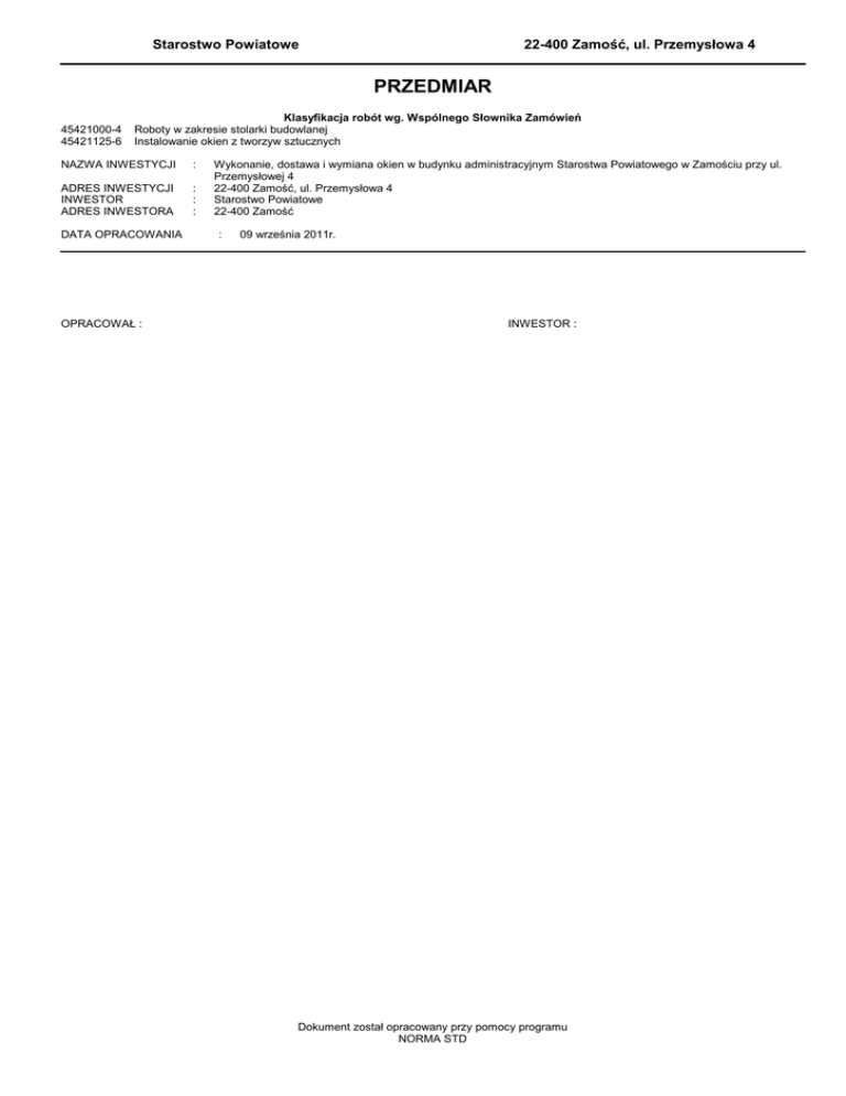 Starostwo Powiatowe 22-400 Zamość, ul. Przemysłowa 4 PRZEDMIAR 45421000-4 45421125-6 Klasyfikacja robót wg. Wspólnego Słownika Zamówień Roboty w zakresie stolarki budowlanej Instalowanie okien z tworzyw sztucznych NAZWA INWESTYCJI : ADRES INWESTYCJI INWESTOR ADRES INWESTORA : : : DATA OPRACOWANIA OPRACOWAŁ : Wykonanie, dostawa i wymiana okien w budynku administracyjnym Starostwa Powiatowego w Zamościu przy ul. Przemysłowej 4 22-400 Zamość, ul. Przemysłowa 4 Starostwo Powiatowe 22-400 Zamość : 09 września 2011r. INWESTOR : Dokument został opracowany przy pomocy programu NORMA STD OGÓLNA CHARAKTERYSTYKA OBIEKTU I ROBÓT zgodnie z Rozporządzeniem Ministra Infrastruktury z dnia 18 maja 2004 r w sprawie określenia metod i podstaw sporządzania kosztorysu inwestorskiego, obliczania planowanych kosztów prac projektowych oraz planowanych kosztów robót budowlanych określonych w programie funkcjonalno uŜytkowym (Dz. U. z dnia 8 czerwca 2004r., Nr 130, poz. 1389) Kosztorys obejmuje wycenę robót budowlanych związanych z wymianą drewnianej stolarki okiennej na na okna PCV z obróbką ościeŜy wewnętrznych i zewnętrznych wraz z malowaniem i wymianą istniejacych parapetów zewnetrznych z blachy ocynkowanej na blachę powlekaną. Zdremontowana stolarka okienna przechodzi na włąsność wykonawcy i podlega utylizacji. Wymagania techniczne dla stolarki okiennej PCV - profile PCV minimum 4. komorowe w kolorze białym z uszczelkami fabrycznie wprowadzonymi do profili, - okna dwuszybowe 4x16x4 o współczynniku przenikania ciepła nie większym niŜ 1,1 W/m2K, współczynnikprzenikania ciepła dla profilu ościeŜnicy i skrzydła nie większy niŜ 1,4 W/m2/K, - okna powinny posiadać współczynnik infiltracji powietrza a=0,5-1,0 m3/mhdaPa 2/3, - okucia obwiedniowe umoŜliwiające dwukierunkowe otwieranie rozwieralne i uchylne oraz mikrowentylację przynajmniej w jednym skrzydle. -2- Norma STD Wersja 4.14a Starostwo Zamość-okna Lp. Nazwa TABELA ELEMENTÓW SCALONYCH Robocizna Materiały Kosztorys Kp Z 0.00 Słownie: zero i 00/100 zł -3- Norma STD Wersja 4.14a Sprzęt 0.00 RAZEM 0.00 Starostwo Zamość-okna PRZEDMIAR Lp. Podstawa Opis i wyliczenia j.m. Poszcz Razem Wykonanie, dostawa i wymiana okien w budynku administracyjnym Starostwa Powiatowego w Zamościu przy ul. Przemysłowej 4 1 WYMIANA STOLARKI OKIENNEJ W BUDYNKU ADMINISTRACYJNYM STAROSTWA POWIATOWEGO W ZAMOŚCIU 1 KNR 0-19 Wymiana okien zespolonych na okna rozwierane i uchylno-rozwierane jednodzielne m2 d.1 0929-06 z PCV o pow. do 1.5 m2 - okna PCV RU o wymiarach 0,84x1,73m 92*0.84*1.73 m2 133.694 RAZEM 133.694 2 KNR 0-19 Wymiana okien zespolonych na okna uchylne jednodzielne z PCV o pow. do 0.6 m2 m2 d.1 0929-02 - okna PCV U o wymiarach 0,84x0,53m 20*0.54*0.53 m2 5.724 RAZEM 5.724 3 KNR 0-19 Wymiana okien zespolonych na okna rozwierane i uchylno-rozwierane dwudzielne z m2 d.1 0929-11 PCV o pow. ponad 2.5 m2 4*1.48*1.73 m2 10.242 RAZEM 10.242 4 KNR 4-01 Dwukrotne malowanie farbami emulsyjnymi starych tynków wewnętrznych ścian m2 d.1 1204-02 ościeŜa wewnętrzne w kolorzer białym. 92*[0.84+2*1.73]*0.18 m2 71.208 20*[0.54+2*0.53]*0.18 m2 5.760 4*[1.48+2*1.73]*0.18 m2 3.557 RAZEM 80.525 5 KNR 4-01 Dwukrotne malowanie farbami emulsyjnymi elewacji - tynki gładkie - ościeŜa zem2 d.1 1204-03 wnętrzne kolor Ŝółty 92*[0.84+2*1.73]*0.12 m2 47.472 20*[0.54+2*0.53]*0.12 m2 3.840 4*[1.48+2*1.73]*0.12 m2 2.371 RAZEM 53.683 6 KNR 4-01 Rozebranie obróbek blacharskich murów ogniowych, okapów, kołnierzy, gzymsów m2 d.1 0535-08 itp. z blachy nie nadającej się do uŜytku - parapety zewnętrzne 92*0.84*0.16 m2 12.365 20*0.54*0.16 m2 1.728 4*1.48*0.16 m2 0.947 RAZEM 15.040 7 NNRNKB 202 (z.VI) Obróbki blacharskie z blachy powlekanej o szer.w rozwinięciu do 25 cm - para- m2 d.1 0541-01 pety zewnętrzne poz.6 m2 15.040 RAZEM 15.040 8 Usunięcie z budynku zdemontowanej stolarki okiennej, wywiezienie i utylizacja. kpl d.1 wycena indywidualna 1 kpl 1.000 RAZEM 1.000 -4- Norma STD Wersja 4.14a