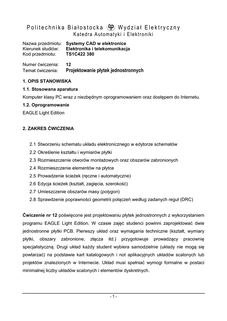 Politechnika Białostocka Wydział Elektryczny K at e dr a A ut om a t y k i i E l ek t r o n i k i Nazwa przedmiotu: Systemy CAD w elektronice Kierunek studiów: Elektronika i telekomunikacja Kod przedmiotu: TS1C422 380 Numer ćwiczenia: Temat ćwiczenia: 12 Projektowanie płytek jednostronnych 1. OPIS STANOWISKA 1.1. Stosowana aparatura Komputer klasy PC wraz z niezbędnym oprogramowaniem oraz dostępem do Internetu. 1.2. Oprogramowanie EAGLE Light Edition 2. ZAKRES ĆWICZENIA 2.1 Stworzeniu schematu układu elektronicznego w edytorze schematów 2.2 Określenie kształtu i wymiarów płytki 2.3 Rozmieszczenie otworów montażowych oraz obszarów zabronionych 2.4 Rozmieszczenie elementów na płytce 2.5 Prowadzenie ścieżek (ręczne i automatyczne) 2.6 Edycja ścieżek (kształt, zagięcia, szerokość) 2.7 Umieszczenie obszarów masy (polygon) 2.8 Sprawdzenie poprawności geometrii połączeń według zadanych reguł (DRC) Ćwiczenie nr 12 poświęcone jest projektowaniu płytek jednostronnych z wykorzystaniem programu EAGLE Light Edition. W czasie zajęć studenci powinni zaprojektować dwie jednostronne płytki PCB. Pierwszy układ oraz wymagania techniczne (kształt, wymiary płytki, obszary zabronione, złącza itd.) przygotowuje prowadzący pracownię specjalistyczną. Drugi układ każdy student wybiera samodzielnie (układy nie mogą się powtarzać) na podstawie kart katalogowych i not aplikacyjnych układów scalonych lub projektów znalezionych w Internecie. Układ musi spełniać wymogi formalne w postaci minimalnej liczby układów scalonych i elementów dyskretnych. -1- 3. OCENA Umiejętności nabyte w czasie ćwiczeń nr 12 będą oceniane w trakcie praktycznego sprawdzianu zaliczeniowego z projektowania płytek PCB. 4. LITERATURA [1] Wieczorek H.: Eagle: pierwsze kroki, BTC, Warszawa, 2007 5. ZAGADNIENIA NA ZALICZENIE Projektowanie i edycja jednostronnej płytki PCB na podstawie schematu układu elektronicznego. Umiejętność wykorzystania modułu DRC oraz korygowania błędów. Autor instrukcji: dr inż. Andrzej Karpiuk Data opracowania: 31.01.2014r. Materiały dydaktyczne przeznaczone dla studentów Wydziału Elektrycznego Politechniki Białostockiej. Do użytku wewnętrznego. -2-