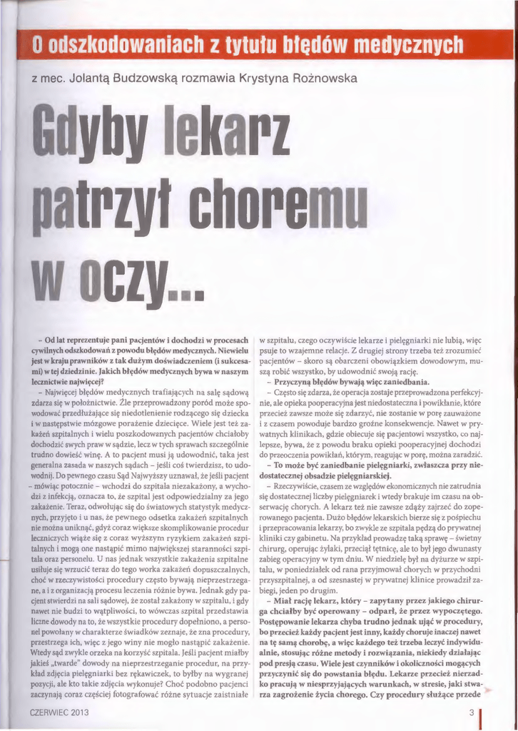 z mec. Jolantą Budzowską rozmawia Krystyna Rożnowska y lekarz trzyl c remu - Od łat reprezentuje pani pacjentów i dochodzi w procesach cywilnych odszkodowań z powodu błędów medycznych. Niewielu jest w kraju prawników z tak dużym do 'wiadczeniem (i sukce ami) w tej dziedzinie. Jakich błędów medycznych byw·a w naszym lecznictwie najwięcej? - Najwięcej błędów medycznych trafiających na salę sądową zdarza ;ię w położnictwie. Źle przeprowadzony poród może powodować przedłużające się niedotlenienie rodzącego się dziecka 1 w następstwie mózgowe porażenie dziecięce. Wiele jestteż zakażen szpitalnych i wiel u poszkodowanych pacjentów chciałoby dochodzić swych praw w sądzie, lecz w tych sprawach szczególnie trudno d01~ieść winę. A to pacjent mu i ją udowodnić, taka jest generalna zasada w naszych ądach -jeśli coś twierdzisz, to udowodnij. Do pewnego cza u Sąd aj wyższy uznawał, że je ' l i pacjent - mowiąc potocznic-wchodzi do szpitala niczakażony, a wychodzi z infekcją, oznacza to, że szpital jest odpowiedzialny za jego zakazcnie. Teraz, odwołując się do światowych statystyk medycznych, przyjęto i u nas, że pewnego od etka zakażeń zpitalnych nie można uniknąć, gdyż coraz większe skomplikowanie procedur leczniczych wiąże się z coraz wyższym ryzykiem zakażcli szpi talnych i mogt) one nastąpić mimo największej staranności szpi tala oraz personelu. U nas jednak wszystkie zakażenia szpitalne usiluje się wrzucić teraz do tego worka zakaże11 dopu zczalnych, choć w rzeczywisto ' ci procedury często bywają nicprzcstrzcgane, a i z organizacją procesu leczenia różnic bywa. jednak gdy pacjent stwierdzi na sali ądowej, że został zakażony w szpitalu, i gdy 11.1wct nic budzi to wątpliwości, to wów zas szpital przed. tawia liczne dowody na to, że wszystkie procedury dopełniono, a perso nd powolany w charakterze świadków zeznaje, że zna procedury, przcstnega 1ch, więc z jego winy nie mogło nastąpić zakażenie. \\'tedy sąd zwykle orzeka na korzyść szpitala. jeśli pacjent miałby jaklcs "twarde" dowody na nieprze trzeganie procedur, na przykład zdjęcia pielęgniarki bez rękawiczek, to byłby na wygranej pozycji, ale kto takie zdjęcia wykonuje? hoć podobno pacjenci zaczynają coraz czę ' ci ej fotografować różne ytuacje zaistniałe CZERWIEC 2013 w szpitalu, czego oczywiście lekarze i pielęgniarki nie lubią, więc psuje to wzajemne relacje. Z drugiej strony trzeba też zrozumieć pacjentów - koro są obarczeni obowiązkiem dowodowym, muSZ<) robić wszystko, by udowodnić swoją rację. - Przyczyną błędów bywają więc zaniedbania. - Często się zdarza, że operacja zostaje przeprowadzona perfekcyjnie, ale opieka pooperacyjna jest niedostateczna i powikłanie, które przecież zawsze może się zdarzyć, nie zostanie w porę zauważone i z czasem powoduje bardzo groźne konsekwencje. Nawet w prywatnych klinikach, gdzie obiecuje się pacjentowi wszystko, co najlepsze, bywa, że z powodu braku opieki pooperacyjnej dochodzi do przeoczenia powikłań, którym, reagując w porę, można zaradzić. -To może być zaniedbanie pielęgniarki, zwłaszcza przy niedostatecznej obsadzie pielęgniarskiej. - Rzeczywiście, czasem ze względów ekonomicznych nie zatrudnia się dostatecznej liczby pielęgniarek i wtedy brakuje im czasu na obserwację chorych. A lekarz też nie zawsze zdąży zajrzeć do zoperowanego pacjenta. Dużo błędów lekarskich bierze się z pośpiechu i przepracowania lekarzy, bo zwykle ze szpitala pędzą do prywatnej kliniki czy gabinetu. Na przykład prowadzę taką sprawę- świetny chirurg, operując żylaki, przeciął tętnicę, ale to był jego dwunasty zabieg operacyjny w tym dniu. W niedzielę był na dyżurze w szpitalu, w poniedziałek od rana przyjmowal chorych w przychodni przyszpitalnej, a od szesnastej w prywatnej klinice prowadził zabiegi, jeden po drugim. - Miał rację lekarz, który- zapytany przez jakiego chirurga chciałby być operowany - odparł, że przez wypoczętego. Postępowanie lekarza chyba trudno jednak ująć w procedury, bo przecież każdy pacjent jest inny, każdy choruje inaczej nawet na tę samą chorobę, a więc każdego też trzeba leczyć indywidualnie, stosując różne metody i rozwiązania, niekiedy działając pod presją czasu. Wiele jest czynników i okoliczności mogących przyczynić się do powstania błędu. Lekarze przecież nierzadko pracują w niesprzyjających warunkach, w stresie, jaki stwarza zagrożenie życia chorego. Czy procedury służące przede Mec. Jolanta Budzowska- radca prawny, partner w kancelarii Budzowska, Fiutowski i Partnerzy, od piętnastu lat zajmuje się sprawami cywilnymi w zakresie praw pacjentów i dochodzeniem roszcze11 od zkodowawczych z tytułu błędów medycznych. Jest z ramienia Polski członkiem zarządu między narodowej organizacji prawników specjalizujących się w sprawach uszkodzeń ciała lub rozstroju zdrowia PEOPIL (Pan European Organisation of Persona! Injury Lawyers) z siedzibą w Birmingham. Jest autorką wielu komentarzy prawniczych oraz współautorką monograficznej publikacji w języku angielskim. Jest też członkiem małopolskiej Komisji do Spraw Orzekania o Zdarzeniach Medycznych. Jako pełnomocnik poszkodowanych pacjentów prowadzi około stu pięćdziesiesięciu procesów cywilnych, a etki ma już za sobą. pogorszył, nie można już było wprowadzić do leczenia innego, refundowanego leku, właśnie dlatego że była leczona interferonem. Starania o zastosowanie chemioterapii niestandardowej, pokrycie wysokich kosztów tego leczenia, odszkodowania za wydatki, które poniosła z własnej kieszeni, przerwała jej śmierć. - W podobnej sytuacji jak ona znalazły się wtedy setki pacjentów z tego typu nowotworem nerki, którym rutynowo podano interferon, w praktyce zamykając im możliwość dalszego leczenia refundowanym, ale droższym lekiem, także stosowanym w tej ch