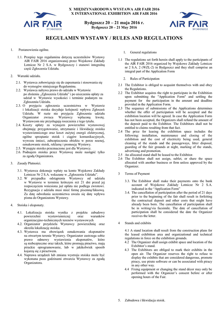 X MIĘDZYNARODOWA WYSTAWA AIR FAIR 2016 X INTERNATIONAL EXHIBITION AIR FAIR 2016 Bydgoszcz 20 – 21 maja 2016 r. Bydgoszcz 20 – 21 May 2016 REGULAMIN WYSTAWY / RULES AND REGULATIONS 1. Postanowienia ogólne. 1.1. Przepisy tego regulaminu dotyczą uczestników Wystawy AIR FAIR 2016 organizowanej przez Wojskowe Zakłady Lotnicze Nr 2 S.A. w Bydgoszczy i stanowi integralną część Zgłoszenia Udziału. 2. Zasady Płatności. 3.1. Wystawca dokonuje wpłaty na konto Wojskowe Zakłady Lotnicze Nr 2 S.A. wskazane w „Zgłoszeniu Udziału”. 3.2. W przypadku odstąpienia Wystawcy od udziału w Wystawie w terminie krótszym niż 21 dni przed jej rozpoczęciem wniesiona już opłata nie podlega zwrotowi. Rezygnacja z udziału musi mieć formę pisemną/faksową. Za datę odwołania uczestnictwa uważa się datę wpływu pisma do Organizatora Wystawy. 4. 2. Rules of Participation 2.1 The Exhibitor is obliged to acquaint themselves with and obey the Regulations. 2.2 The Exhibitor acquires the right to participate in the Exhibition upon submitting the "Application Form" and settling the payment for the participation in the amount and deadline provided in the Application Form. 2.3 The sequence of submissions of the Applications determines whether the offer of participation will be accepted and the exhibition location will be agreed. In case the Application Form has not been accepted, the Organizers shall refund the amount of the deposit paid to the Exhibitor. The Exhibitors shall not be entitled to claims resulting from that fact. 2.4 The price for leasing the exhibition space includes the following: installation, maintenance and closing of the exhibition and the cost of electricity being used, general cleaning of the stands and the passageways, litter disposal, guarding of the fair grounds at night, marking of the stands, advertising and promotion. 2.5 An allocated stand shall be leased to the Exhibitor. 2.6 The Exhibitor shall not assign, sublet, or share the space allocated with another business or firm unless approved by the Organizer. 3 Terms of Payment 3.3. The Exhibitor shall make their payments onto the bank account of Wojskowe Zakłady Lotnicze Nr 2 S.A. indicated in the “Application Form” 3.4. The cancellation of participation after the period of 21 days prior to the beginning of the fair shall result in forfeiting the contractual deposit and other costs that might have already been born. The cancellation of participation shall be in writing/via facsimile. The date of cancellation of participation shall be considered the date the Organizer receives the letter. Stoiska i eksponaty. Lokalizacja stoiska wynika z projektu zabudowy powierzchni wystawienniczej oraz warunków organizacyjno-technicznych terenów wystawowych 4.2. Organizator przydziela Wystawcy powierzchnię oraz określa lokalizację stoiska. 4.3. Wystawca ma obowiązek oznakowania eksponatów na otwartym terenie Wystawy. Organizator zastrzega sobie prawo odmowy wystawienia eksponatów, które są niebezpieczne oraz takich, które promują piractwo, mają pirackie oprogramowanie, lub w jakikolwiek sposób kojarzą się z piractwem. 4.4. Naprawa urządzeń lub zmiana wystroju stoiska może być wykonana poza godzinami otwarcia Wystawcy za zgodą Organizatora. General regulations 1.1 The regulations set forth herein shall apply to the participants of the AIR FAIR 2016 organized by Wojskowe Zakłady Lotnicze nr 2 S.A. 2 (WZL-2) in Bydgoszcz and they shall comprise an integral part of the Application Form Warunki udziału. 2.1. Wystawca zobowiązuje się do zapoznania i stosowania się do wymogów niniejszego Regulaminu. 2.2. Wystawca nabywa prawo do udziału w Wystawie po złożeniu „Zgłoszenia Udziału” i po uiszczeniu opłaty za udział w Wystawie wysokości i terminie podanym na Zgłoszeniu Udziału. 2.3. O przyjęciu zgłoszenia uczestnictwa w Wystawie i lokalizacji stoiska decyduje kolejność wpływu Zgłoszeń Udziału. W razie nie przyjęcia Zgłoszenia udziału Organizator zwraca Wystawcy wpłaconą kwotę. Wystawcom nie przysługują roszczenia z tego tytułu. 2.4. Koszty opłaty za wynajem powierzchni wystawowej obejmują: przygotowanie, utrzymanie i likwidację stoiska wystawienniczego oraz koszt zużytej energii elektrycznej, ogólne sprzątanie stoisk i ciągów komunikacyjnych, wywozu śmieci, zabezpieczenia obiektu w porze nocnej, oznakowanie stoisk, reklamę i promocję Wystawy. 2.5. Wynajęte stoisko przeznaczone jest dla Wystawcy. 2.6. Podnajem stoiska przez Wystawcę może nastąpić tylko za zgodą Organizatora. 3. 1. 4.1. 4 Stands and exhibits 4.1 A stand location shall result from the construction plans for the leased exhibition area and organizational and technical regulations in force on the exhibition grounds. 4.2 The Organizer shall assign exhibit space and location of the Exhibitor’s stand. 4.3 The Exhibitors are obliged to mark their exhibits in the open air. The Organizer reserves the right to refuse to display the exhibits that are considered dangerous, promote piracy, use pirate software or can be associated with piracy in any other way. 4.4 Fixing equipment or changing the stand décor may only be performed with the Organizer’s consent before or after opening hours of the Fair. 5. Zabudowa i likwidacja stoisk. 5.1 W przypadku wyboru stoiska zabudowanego Organizator zapewnia standardową zabudowę stoiska, tzn. ściany typu OCTA 2,5m/1 m wraz z wyposażeniem standardowym określonym przez Wystawcę w Zgłoszeniu Udziału w Wystawie. 5.2. Wystrój plastyczny stoisk Wystawca wykonuje we własnym zakresie. 5.3. Wystawca może zlecić Organizatorowi odpłatne wykonanie wystroju plastycznego stoiska. 5.4. Wykonanie stoiska z elementów Wystawcy oraz likwidacja odbywa się na koszt i ryzyko Wystawcy. 5.5. Wystawca ponosi całkowitą odpowiedzialność za szkody wynikłe z funkcjonowania jego urządzeń na jego stoisku w trakcie przygotowania, trwania i likwidacji Wystawy. 5.6. Organizator z