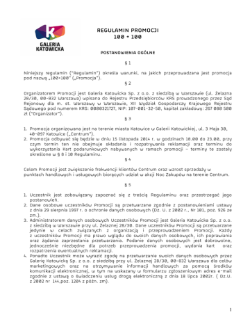 REGULAMIN PROMOCJI 100 + 100 POSTANOWIENIA OGÓLNE §1 Niniejszy regulamin (“Regulamin”) określa warunki, na jakich przeprowadzana jest promocja pod nazwą „100+100” („Promocja”). §2 Organizatorem Promocji jest Galeria Katowicka Sp. z o.o. z siedzibą w Warszawie (ul. Żelazna 28/30, 00-832 Warszawa) wpisana do Rejestru Przedsiębiorców KRS prowadzonego przez Sąd Rejonowy dla m. st. Warszawy w Warszawie, XII Wydział Gospodarczy Krajowego Rejestru Sądowego pod numerem KRS: 0000321727, NIP: 107-001-32-50, kapitał zakładowy: 267 080 500 zł (“Organizator”). §3 1. Promocja organizowana jest na terenie miasta Katowice w Galerii Katowickiej, ul. 3 Maja 30, 40-097 Katowice („Centrum”). 2. Promocja odbywać się będzie w dniu 15 listopada 2014 r. w godzinach 18.00 do 23.00, przy czym termin ten nie obejmuje składania i rozpatrywania reklamacji oraz terminu do wykorzystania Kart podarunkowych nabywanych w ramach promocji – terminy te zostały określone w § 8 i 10 Regulaminu. §4 Celem Promocji jest zwiększenie frekwencji klientów Centrum oraz wzrost sprzedaży w punktach handlowych i usługowych biorących udział w akcji Noc Zakupów na terenie Centrum. §5 1. Uczestnik jest zobowiązany zapoznać się z treścią Regulaminu oraz przestrzegać jego postanowień. 2. Dane osobowe uczestników Promocji są przetwarzane zgodnie z postanowieniami ustawy z dnia 29 sierpnia 1997 r. o ochronie danych osobowych (Dz. U. z 2002 r., Nr 101, poz. 926 ze zm.). 3. Administratorem danych osobowych Uczestników Promocji jest Galeria Katowicka Sp. z o.o. z siedzibą w Warszawie przy ul. Żelaznej 28/30. Dane uczestników Promocji są przetwarzane jedynie w celach związanych z organizacją i przeprowadzeniem Promocji. Każdy z uczestników Promocji ma prawo wglądu do swoich danych osobowych, ich poprawiania oraz żądania zaprzestania przetwarzania. Podanie danych osobowych jest dobrowolne, jednocześnie niezbędne dla potrzeb przeprowadzenia promocji, wydania kart oraz rozpatrzenia ewentualnych reklamacji. 4. Ponadto Uczestnik może wyrazić zgodę na przetwarzanie swoich danych osobowych przez Galerię Katowicką Sp. z o.o. z siedzibą przy ul. Żelaznej 28/30, 00-832 Warszawa dla celów marketingowych oraz na otrzymywanie informacji handlowych za pomocą środków komunikacji elektronicznej, w tym na wskazany w formularzu zgłoszeniowym adres e-mail zgodnie z ustawą o świadczeniu usług drogą elektroniczną z dnia 18 lipca 2002r. ( Dz.U. z 2002 nr 144,poz. 1204 z późn. zm). 1 §6 W ramach Promocji, Uczestnicy będą mogli nabyć na zasadach określonych w niniejszym Regulaminie łącznie 1000 sztuk Kart Podarunkowych Galerii Katowickiej, za kwotę 100,00 zł brutto każda (słownie: sto złotych), które w ramach promocji będą zasilone kwotą 200,00 zł (słownie: dwieście złotych). Łączna wartość zasilenia Kart biorących udział w Promocji wynosi 200.000,00 zł (słownie: dwieście tysięcy złotych). §7 UCZESTNICY PROMOCJI I JEJ PRZEBIEG 1. Zakupami objętymi Promocją są zakupy wszystkich i usług dostępnych we wszystkich punktach handlowych i usługowych na terenie Centrum, z zastrzeżeniem pkt 2 i 3 niniejszego paragrafu. 2. Z uwagi na brzmienie przepisów ustawy z dnia 26 października 1982 r. o wychowaniu w trzeźwości i przeciwdziałaniu alkoholizmowi (t. jedn. Dz. U. z 2002 r. Nr 147, poz. 1231 z poźn. zm.) w Promocji nie można uczestniczyć na podstawie zakupu napojów alkoholowych (w tym piwa). 3. Z udziału w Promocji wyłączone są następujące produkty, towary i punkty handlowe i usługowe dostępne na terenie centrum: supermarket spożywczy Stokrotka, apteki i punkty apteczne, wyroby tytoniowe, e-papierosy, karty podarunkowe, bony i talony podarunkowe, karty do telefonu typu pre-paid, bilety, usługi sprzedaży zakładów na gry liczbowe, losów loterii pieniężnych, produktów i usług w zakładach bukmacherskich, kantoru wymiany walut, transakcje zapłaty za jakiekolwiek rachunki za usługi komunalne, media, telefon, gaz. 4. W przypadku dowodów zakupów, na których widnieją zakupy produktów wyłącznych z Promocji, podstawą do wydania kart promocyjnych będzie kwota wskazana na dowodzie zakupu, pomniejszona o wartość zakupu produktów wyłączonych od udziału w Promocji. 5. Sprzedaż towarów i usług uprawniająca do udziału w Promocji prowadzona będzie w dniu 15 listopada 2014 roku w godzinach od 18:00 do 23:00. 6. Dowodem zakupu uprawiającym do przystąpienia do Promocji jest paragon fiskalny lub ręcznie wypełniony dokument potwierdzający dokonanie zakupu (wystawiany w niektórych punktach handlowych). W Promocji nie można uczestniczyć na podstawie faktury VAT. 7. Uczestnikiem Promocji (zwanym dalej “Uczestnikiem”), na warunkach określonych w niniejszym Regulaminie, może być wyłącznie pełnoletnia osoba fizyczna, będąca konsumentem w rozumieniu art. 22¹ kodeksu cywilnego, która w terminie określonym w § 3 pkt 2 Regulaminu: a. Dokona w punktach handlowych i usługowych objętych Promocją znajdujących się na terenie Centrum transakcji zakupu/zakupów towarów/usług za kwotę nie mniejszą niż 500,00 zł (słownie: pięćset złotych) brutto, („Zakup promocyjny“). Wartości z różnych dowodów zakupu sumują się. Zakup promocyjny może być udokumentowany na jednym lub kilku (maksymalnie 3) dowodach zakupu z terminu Promocji. b. Zgłosi się do info punktu znajdującego się na terenie Centrum w celu nabycia za cenę w wysokości 100,00 zł (słownie: sto złotych) brutto Karty podarunkowej zasilonej kwotą 200,00 zł (słownie: dwieście złotych) brutto przeznaczonej na zakupy w Centrum. c. Zarejestruje zakupioną Kartę okazując dokument tożsamości i podając swoje dane osobowe w zakresie: imię, nazwisko, nr PESEL, adres e-mail (jeśli posiada), nr telefonu (jeśli posiada) oraz nr otrzymanej karty (numer karty znajduje się na kopercie, w której znajduje się karta). 8. W Promocji ni