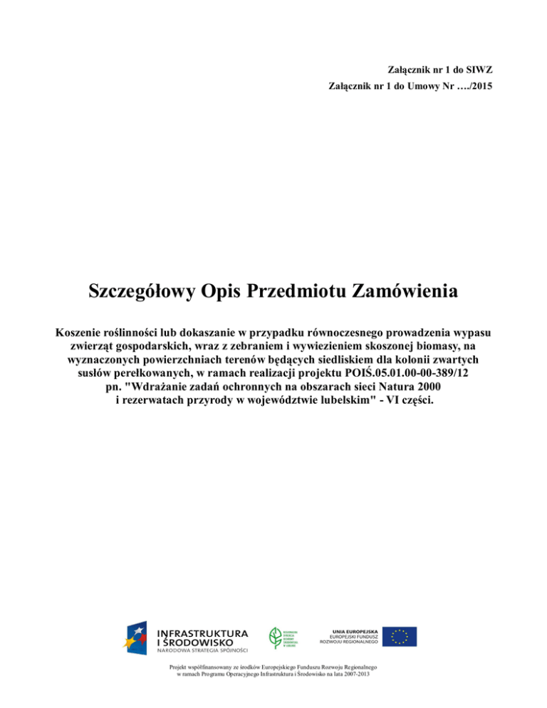 Załącznik nr 1 do SIWZ Załącznik nr 1 do Umowy Nr …./2015 Szczegółowy Opis Przedmiotu Zamówienia Koszenie roślinności lub dokaszanie w przypadku równoczesnego prowadzenia wypasu zwierząt gospodarskich, wraz z zebraniem i wywiezieniem skoszonej biomasy, na wyznaczonych powierzchniach terenów będących siedliskiem dla kolonii zwartych susłów perełkowanych, w ramach realizacji projektu POIŚ.05.01.00-00-389/12 pn. "Wdrażanie zadań ochronnych na obszarach sieci Natura 2000 i rezerwatach przyrody w województwie lubelskim" - VI części. Projekt współfinansowany ze środków Europejskiego Funduszu Rozwoju Regionalnego w ramach Programu Operacyjnego Infrastruktura i Środowisko na lata 2007-2013 Część I Prace związane z poprawą warunków siedliskowych na stanowisku susła perełkowanego w miejscowości Gliniska na powierzchni 8 ha (na części obszaru Natura 2000 PLH060006 Gliniska - część rezerwatu Gliniska) . Zakres usługi: dwukrotne koszenie roślinności lub dokaszanie w przypadku równoczesnego prowadzenia wypasu zwierząt gospodarskich, z zebraniem i wywiezieniem poza obręb obiektu skoszonej biomasy. Usługę należy wykonać na części obszaru Natura 2000 Gliniska PLH060006 – część rezerwatu Gliniska. Termin wykonania usługi: o pierwsze koszenie roślinności z zebraniem i wywiezieniem biomasy – ustala się w terminie ………….dni (między 4 a 16 dni) od daty zawarcia umowy, tj. od dnia …………………. do dnia ……………….…… o drugie koszenie roślinności z zebraniem i wywiezieniem biomasy – ustala się w terminie …….……dni (między 4 a 16 dni - w okresie 01.07.2015 r. - 16.07.2015 r.), tj. od dnia ……….….. do dnia ……...….. Powierzchnia: 8 ha (powierzchnia do wykonania usługi zostanie wyznaczona przez zamawiającego). Ww. prace powinny być wykonane standardowym sprzętem używanym przy tego typu zabiegach tj. przy użyciu rotacyjnych kosiarek ciągnikowych – na dużych powierzchniach, kosiarek wózkowych trawnikowych - w miejscach trudnodostępnych typu zagłębienia, wyniesienia, rowy, kurhany - spalinowych kos motorowych w miejscach o bardzo dużym nachyleniu. Powierzchnia, na której mają być wykonane prace zostanie wyznaczona przez osobę upoważnioną przez zamawiającego. Przy wykonywaniu koszeń należy zachować odpowiednią wysokość murawy, niedopuszczalne jest jej niszczenie poprzez zbyt niskie ustawienie kosiarek lub pozostawienie trawy zbyt wysokiej. Jej wysokość po skoszeniu ma być zbliżona do wysokości trawy po wypasie krów na danym terenie (ok. 5 cm). Zebraną skoszoną i przesuszoną biomasę należy wywieść poza teren obiektu i zużyć gospodarczo lub w jakikolwiek inny dopuszczony przez prawo sposób. Niedopuszczalne jest pozostawienie pozyskanej biomasy lub jej palenie na terenie obiektu. Przewracanie i grabienie skoszonej biomasy należy prowadzić bardzo dokładnie standardową zgrabiarką do siana. W przypadku, gdy warunki pogodowe (deszcze) nie pozwolą na wysuszenie skoszonej trawy należy ją zgrabić w stanie niedosuszonym i wywieść poza teren obiektu. Projekt współfinansowany ze środków Europejskiego Funduszu Rozwoju Regionalnego w ramach Programu Operacyjnego Infrastruktura i Środowisko na lata 2007-2013 Część II Prace związane z poprawą warunków siedliskowych na stanowisku susła perełkowanego w miejscowości Mokre na powierzchni 20 ha (na części obszaru Natura 2000 PLH060008 Hubale - część rezerwatu „Hubale”) Zakres usługi: dwukrotne koszenie roślinności lub dokaszanie w przypadku równoczesnego prowadzenia wypasu zwierząt gospodarskich, z zebraniem i wywiezieniem poza obręb obiektu skoszonej biomasy. Usługę należy wykonać na części obszaru Natura 2000 Hubale PLH060008 – część rezerwatu Hubale. Termin wykonania usługi: o pierwsze koszenie roślinności z zebraniem i wywiezieniem biomasy – ustala się w terminie ………….dni (między 6 a 16 dni) od daty zawarcia umowy., tj. od dnia …………………. do dnia ……………….…… o drugie koszenie roślinności z zebraniem i wywiezieniem biomasy – ustala się w terminie …….……dni (między 4 a 16 dni - w okresie 01.07.2015 r. - 16.07.2015 r.), tj. od dnia ……….….. do dnia ……...….. Powierzchnia: 20 ha (powierzchnia do wykonania usługi zostanie wyznaczona przez Zamawiającego). Ww. prace powinny być wykonane standardowym sprzętem używanym przy tego typu zabiegach tj. przy użyciu rotacyjnych kosiarek ciągnikowych – na dużych powierzchniach, kosiarek wózkowych trawnikowych - w miejscach trudnodostępnych typu zagłębienia, wyniesienia, rowy, kurhany - spalinowych kos motorowych w miejscach o bardzo dużym nachyleniu. Powierzchnia, na której mają być wykonane prace zostanie wyznaczona przez osobę upoważnioną przez zamawiającego. Przy wykonywaniu koszeń należy zachować odpowiednią wysokość murawy, niedopuszczalne jest jej niszczenie poprzez zbyt niskie ustawienie kosiarek lub pozostawienie trawy zbyt wysokiej. Jej wysokość po skoszeniu ma być zbliżona do wysokości trawy po wypasie krów na danym terenie (ok. 5 cm). Zebraną skoszoną i przesuszoną biomasę należy wywieść poza teren obiektu i zużyć gospodarczo lub w jakikolwiek inny dopuszczony przez prawo sposób. Niedopuszczalne jest pozostawienie pozyskanej biomasy lub jej palenie na terenie obiektu. Przewracanie i grabienie skoszonej biomasy należy prowadzić bardzo dokładnie standardową zgrabiarką do siana. W przypadku, gdy warunki pogodowe (deszcze) nie pozwolą na wysuszenie skoszonej trawy należy ją zgrabić w stanie niedosuszonym i wywieść poza teren obiektu. Projekt współfinansowany ze środków Europejskiego Funduszu Rozwoju Regionalnego w ramach Programu Operacyjnego Infrastruktura i Środowisko na lata 2007-2013 Część III Prace związane z poprawą warunków siedliskowych na stanowisku susła perełkowanego w miejscowości Tyszowce