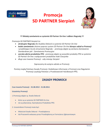 Promocja SD PARTNER Sierpień !!! Składaj zamówienia w systemie SD Partner On-line i odbierz Nagrodę !!! Promocja SD PARTNER Sierpień to: atrakcyjne Nagrody dla Studiów Dekoral w systemie SD Partner On-line każde zamówienie złożone poprzez system SD Partner On-line biorące udział w Promocji i przybliżające Cię do otrzymania Nagrody - promocją objęte są zarówno Zamówienia Standardowe jak i Zamówienia Promocyjne szeroka oferta produktów PPG - promocją objęte są wszystkie produkty PPG w systemie SD Partner On-line z wyłączeniem produktów maki Cieszynka długi czas trwania Promocji - cały miesiąc Sierpień Zapraszamy do wzięcia udziału w Promocji. Poniżej znajdą Państwo Zasady Promocji. Dodatkowe informacje o Promocji oraz Regulamin Promocji uzyskają Państwo u Przedstawicieli Handlowych PPG. ZASADY PROMOCJI Czas trwania Promocji : 01.08.2012 - 31.08.2012. Uczestnicy Promocji 1.Promocją objęte są Studia Dekoral: które są w systemie SD PARTNER On-line nie są własnością Dystrybutora Produktów PPG 2. Uczestnikiem Promocji może być: Właściciel Studio Dekoral - Przedsiębiorca lub Pracownik wskazany przez Przedsiębiorcę w Formularzu Zgłoszeniowym Promocja SD PARTNER SIERPIEŃ Strona 1 Produkty w Promocji Promocją objęte są wszystkie produkty marek Dekoral, Dekoral Fashion, Dekoral Gold, Dekoral Color System, Drewnochron i Domalux które można zamawiać w systemie SD Partner Nie są brane pod uwagę zamówienia na produkty marki Cieszynka Przystąpienie do Promocji W celu przystąpienia do Promocji prosimy do 20 sierpnia o wypełnienie Formularza Zgłoszeniowego (nie dotyczy uczestników Promocji SD PARTNER Lipiec gdy dane Uczestnika nie uległy zmianie) Dla sklepów, które przystąpią do Promocji wartość złożonych i zrealizowanych zamówień liczy się w całym okresie trwania Promocji to jest od 1 do 31 sierpnia Nagrody W ramach Promocji przewidziane są Nagrody za: - dokonanie zamówień na Produkty PPG w systemie SD Partner - realizację zakupu Produktów PPG u Dystrybutora PPG dla złożonych zamówień Nagrody przysługują wg. poniższych zasad: Wartość złożonych zamówień w systemie SD Partner dotyczy wszystkich zamówień złożonych jako Zamówienia Standardowe oraz jako Zamówienia Promocyjne w systemie SD Partner W celu otrzymania nagrody Uczestnik zobowiązany jest do przekazania po zakończeniu Promocji Zestawienia Faktur dokumentujących zakup produktów na które zostały złożone zamówienia w systemie SD Partner Wartość zamówień na Produkty na które zostało złożone zamówienie w systemie SD Partner Online, ale nie została dokonana realizacja ich zakupów u Dystrybutora Produktów PPG nie będzie brana pod uwagę przy przyznaniu Nagrody Wartość zrealizowanych zakupów Produktów PPG na fakturach zakupowych u Dystrybutorów Produktów PPG na które nie było wystawionych Zamówień poprzez system SD Partner także nie będzie brana pod uwagę przy przyznawaniu Nagrody Nagrody będą przekazane Uczestnikom Promocji przez PPG po potwierdzeniu zrealizowanych zakupów Uczestnika u Dystrybutorów Produktów PPG na podstawie Zestawienia Faktur Zakupowych Uczestnika oraz danych dotyczących złożonych zamówień w systemie SD Partner Promocja SD PARTNER SIERPIEŃ Strona 2 Promocja SD PARTNER SIERPIEŃ Strona 3