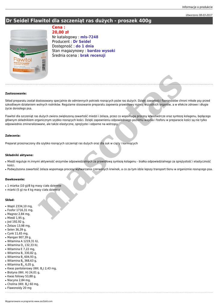 Informacje o produkcie Utworzono 08-03-2017 Dr Seidel Flawitol dla szczeniąt ras dużych - proszek 400g Cena : 20,00 zł s Nr katalogowy : mls-7248 Producent : Dr Seidel Dostępność : do 1 dnia Stan magazynowy : bardzo wysoki Średnia ocena : brak recenzji Zastosowanie: co ta Skład preparatu został dostosowany specjalnie do odmiennych potrzeb rosnących psów ras dużych. Dzięki zawartości flawonoidów chroni młode psy przed szkodliwym działaniem wolnych rodników. Regularne stosowanie preparatu zapewnia prawidłowy rozwój wszystkich organów, a w efekcie zdrowe i długie życie dorosłego psa. Flawitol dla szczeniąt ras dużych zwiera zwiększoną zawartość miedzi i żelaza, przez co wspomaga procesy krwiotwórcze oraz syntezę kolagenu, będącego głównym składnikiem organicznym szybko rosnących kości. Dzięki zapewnieniu odpowiedniego poziomu wapnia i fosforu w preparacie kości są nie tylko odpowiednio zmineralizowane, ale także elastyczne, sprężyste i odporne na wstrząsy. Zalecenia: Preparat przeznaczony dla szybko rosnących szczeniąt ras dużych oraz dla suk w ciąży i karmiących Składniki aktywne: ● Miedź reguluje m.innymi aktywność enzymów odpowiedzialnych za prawidłową syntezę kolagenu - białka odpowiedzialnego za sprężystość i elastyczność kości. Podwyższona zawartość żelaza wspomaga procesy wytwarzania czerwonych krwinek, a co za tym idzie lepszy transport tlenu w organizmie rosnącego psa. m as ● Dawkowanie: ● ● 1 miarka (10 g)/8 kg masy ciała dziennie miarki (5 g) na 4 kg masy ciała dziennie Skład: ● ● ● ● ● ● ● ● ● ● ● ● ● ● ● ● ● ● ● ● ● ● Wapń 2334,10 mg, Fosfor 1716,31 mg, Magnez 2,84 mg, Miedź 1,95 g, Jod 192,92 g, Żelazo 13,98 mg, Selen 36,39 g, Cynk 11,65 mg, Mangan 907,39 g, Witamina A 1219,31 IU, Witamina D3 132,33 IU, Witamina E 7,22 mg, Witamina B1 330,82 g, Witamina B2 604,93 g, Witamina B6 368,63 g, Witamina B12 6,05 g, Kwas pantotenowy (Wit. B5) 2,43 mg, Biotyna (Wit. H) 24,01 g, Kwas foliowy 53,88 g, Niacyna 2,84 mg, Cholina (Wit. B4) 60 mg, Flawonoidy 20 mg Wygenerowano w programie www.oscGold.com
