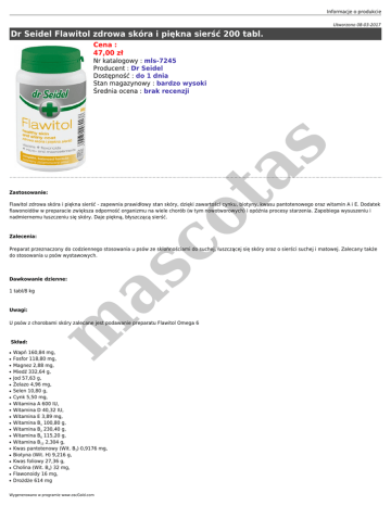 Informacje o produkcie Utworzono 08-03-2017 Dr Seidel Flawitol zdrowa skóra i piękna sierść 200 tabl. Cena : 47,00 zł Zastosowanie: co ta s Nr katalogowy : mls-7245 Producent : Dr Seidel Dostępność : do 1 dnia Stan magazynowy : bardzo wysoki Średnia ocena : brak recenzji Flawitol zdrowa skóra i piękna sierść - zapewnia prawidłowy stan skóry, dzięki zawartości cynku, biotyny, kwasu pantotenowego oraz witamin A i E. Dodatek flawonoidów w preparacie zwiększa odporność organizmu na wiele chorób (w tym nowotworowych) i opóźnia procesy starzenia. Zapobiega wysuszeniu i nadmiernemu łuszczeniu się skóry. Daje piękną, błyszczącą sierść. Zalecenia: m as Preparat przeznaczony do codziennego stosowania u psów ze skłonnościami do suchej, łuszczącej się skóry oraz o sierści suchej i matowej. Zalecany także do stosowania u psów wystawowych. Dawkowanie dzienne: 1 tabl/8 kg Uwagi: U psów z chorobami skóry zalecane jest podawanie preparatu Flawitol Omega 6 Skład: ● ● ● ● ● ● ● ● ● ● ● ● ● ● ● ● ● ● ● ● ● Wapń 160,84 mg, Fosfor 118,80 mg, Magnez 2,88 mg, Miedź 332,64 g, Jod 57,63 g, Żelazo 4,96 mg, Selen 10,80 g, Cynk 5,50 mg, Witamina A 600 IU, Witamina D 40,32 IU, Witamina E 3,89 mg, Witamina B1 100,80 g, Witamina B2 230,40 g, Witamina B6 115,20 g, Witamina B12 2,304 g, Kwas pantotenowy (Wit. B5) 0,9176 mg, Biotyna (Wit. H) 9,216 g, Kwas foliowy 27,36 g, Cholina (Wit. B4) 32 mg, Flawonoidy 16 mg, Drożdże 614 mg Wygenerowano w programie www.oscGold.com s co ta m as