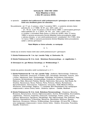 Uchwała Nr XXII/195/ 2004 Rady Miejskiej w Ustce z dnia 30 czerwca 2004r. w sprawie: ustalenia sieci publicznych szkół podstawowych i gimnazjum na terenie miasta Ustki oraz określenia granic ich obwodów. Na podstawie:- art 17 ust. 4 ustawy z dnia 7 września 1991r. o systemie oświaty (tekst jednolity:Dz. U. Z 1996r. Nr 67, poz. 329 z późn. zm.); - art. 18 ust. 2 pkt 15 ustawy z dnia 8 marca 1990r. o samorządzie gminnym (tekst jednolity Dz. U. Z 2001r. Nr 142 , poz. 1591 z późn. zm.) ; w związku z uchwałami Rady Gminy w Ustce Nr I/6/99 z dnia 12 marca 1999r.w sprawie powierzenia Gminie Miejskiej Ustka prowadzenia zadań z zakresu oświaty, w tym szkół podstawowych i przedszkoli i Nr I/7/99 z dnia 12 marca 1999r.w sprawie powierzenia Gminie Miejskiej Ustka prowadzenia zadań z zakresu gimnazjum Rada Miejska w Ustce uchwala, co następuje: § 1. Ustala się na terenie miasta Ustki sieci szkół podstawowych i gimnazjum: 1) Szkoła Podstawowa Nr 1 im. kpt. Leonida Teligi, ul. Darłowska 18, 2) Szkoła Podstawowa Nr 2 im. kmdr. Bolesława Romanowskiego , ul. Jagiellońska 1, 3) Gimnazjum im. gen Mariusz Zaruskiego, ul. Wróblewskiego 7. § 2. Ustala się granice obwodów szkół wymienionych w § 1 : 1) Szkoła Podstawowa Nr 1 im. kpt. Leonida Teligi : Azaliowa, Beniowskiego, Chabrowa, Chopina, Darłowska, Dworcowa, P.Findera, Gen. Zaruskiego, Harcerska, Irysowa, Jana z Kolna, Jaśminowa, Kard. Wyszyńskiego, Kilińskiego, Konwaliowa, Kosynierów, Kwiatowa, M.Kościelniaka, Kowalewskiego, Krokusowa, Liliowa, Limanowskiego, Makowa, Mała, Marynarki Polskiej, Morska, Nadmorska, Narcyzowa, Nad Słupią, Na Wydmie, Narutowicza, Nowa, Perłowa, Polna, Portowa, Różana, Rumiankowa, Sprzymierzeńców, Storczykowa, Tulipanowa, Uroczysko, Walki Młodych,Wilcza, Wrzosowa, Zubrzyckiego, Żeglarzy, 11 Listopada, Boh.Westerplatte oraz następujące miejscowości z terenu Gminy Ustka : Wodnica, Lędowo – Osiedle, Modlinek ; 2) Szkoła Podstawowa Nr 2 im. kmdr. Bolesława Romanowskiego : Akacjowa, Banacha, Brzozowa, Bursztynowa, Cisowa, Dąbrowszczaków, Dunina, M.Fornalskiej, Grunwaldzka, Jagiellońska , Klonowa, Kopernika, Kościuszki, Krasickiego, Krótka, Leśna, Lipowa, Łąkowa, Mickiewicza, Ogrodowa, Piłsudskiego, Plac Dąbrowskiego, Plac Wolności, Reja, Rybacka, Rzemieślnicza, H.Sawickiej, Słoneczna, Słowiańska, Sosnowa, Słupska, Sportowa, Wczasowa, Willowa, Wróblewskiego, Żeromskiego, XX-lecia PRL, 9 Marca oraz następujące miejscowości z terenu Gminy Ustka : Grabno, Zimowiska, Przewłoka, Zapadłe, Orzechowo ; 3) Gimnazjum im. Gen. Mariusza Zaruskiego, ul. Wróblewskiego 7 obejmujące obwód szkolny – ulice w granicach administracyjnych Gminy Miejskiej Ustka oraz następujące miejscowości z terenu Gminy Ustka : Wodnica, Lędowo, Lędowo-Osiedle, Grabno, Zimowiska, Przewłoka, Zapadłe, Orzechowo, Modlinek, Niestkowo, Charnowo, Pęplino, Modła, Możdżanowo, Krężołki, Duninowo, Duninówko, Zaleskie, Zabłocie, Starkowo, Golęcino. Tracą moc: § 3. 1) § 2 i załącznik do uchwały Nr II/14/99 Rady Miejskiej w Ustce z dnia 25 lutego 1999r. w sprawie przekształcenia Szkoły Podstawowej Nr 1 im. kpt. Leonida Teligi w Ustce oraz określenia granic jej obwodu, 2) § 2 i załącznik do uchwały Nr II/15/99 Rady Miejskiej w Ustce z dnia 25 lutego 1999r. w sprawie przekształcenia Szkoły Podstawowej Nr 4 im. kmdr. Bolesława Romanowskiego w Ustce oraz określenia granic jej obwodu, 3) uchwała Nr III/26/99 Rady Miejskiej w Ustce z dnia 11 marca 1999r. w sprawie ustalenia sieci szkół podstawowych i gimnazjum na terenie miasta Ustki. § 4. Wykonanie uchwały powierza się Burmistrzowi Miasta Ustki. § 5. Uchwała wchodzi w życie z dniem 1 września 2004r. i podlega ogłoszeniu w Dzienniku Urzędowym Województwa Pomorskiego. Przewodniczący Rady / - / Jan Olech