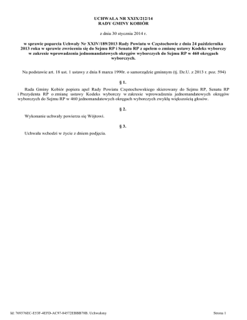 UCHWAŁA NR XXIX/212/14 RADY GMINY KOBIÓR z dnia 30 stycznia 2014 r. w sprawie poparcia Uchwały Nr XXIV/189/2013 Rady Powiatu w Częstochowie z dnia 24 października 2013 roku w sprawie zwrócenia się do Sejmu RP i Senatu RP z apelem o zmianę ustawy Kodeks wyborczy w zakresie wprowadzenia jednomandatowych okręgów wyborczych do Sejmu RP w 460 okręgach wyborczych. Na podstawie art. 18 ust. 1 ustawy z dnia 8 marca 1990r. o samorządzie gminnym (tj. Dz.U. z 2013 r. poz. 594) § 1. Rada Gminy Kobiór popiera apel Rady Powiatu Częstochowskiego skierowany do Sejmu RP, Senatu RP i Prezydenta RP o zmianę ustawy Kodeks wyborczy w zakresie wprowadzenia jednomandatowych okręgów wyborczych do Sejmu RP w 460 jednomandatowych okręgach wyborczych zwykłą większością głosów. § 2. Wykonanie uchwały powierza się Wójtowi. § 3. Uchwała wchodzi w życie z dniem podjęcia. Id: 769376EC-E53F-4EFD-AC97-84572EBBB78B. Uchwalony Strona 1