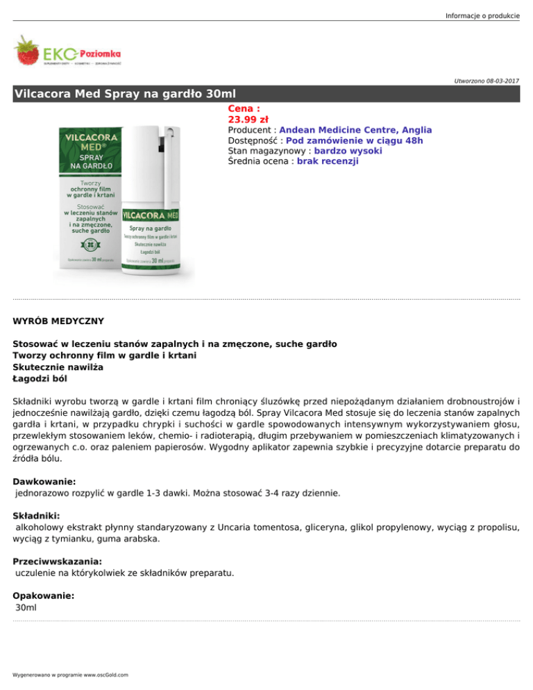 Informacje o produkcie Utworzono 08-03-2017 Vilcacora Med Spray na gardło 30ml Cena : 23.99 zł Producent : Andean Medicine Centre, Anglia Dostępność : Pod zamówienie w ciągu 48h Stan magazynowy : bardzo wysoki Średnia ocena : brak recenzji WYRÓB MEDYCZNY Stosować w leczeniu stanów zapalnych i na zmęczone, suche gardło Tworzy ochronny film w gardle i krtani Skutecznie nawilża Łagodzi ból Składniki wyrobu tworzą w gardle i krtani film chroniący śluzówkę przed niepożądanym działaniem drobnoustrojów i jednocześnie nawilżają gardło, dzięki czemu łagodzą ból. Spray Vilcacora Med stosuje się do leczenia stanów zapalnych gardła i krtani, w przypadku chrypki i suchości w gardle spowodowanych intensywnym wykorzystywaniem głosu, przewlekłym stosowaniem leków, chemio- i radioterapią, długim przebywaniem w pomieszczeniach klimatyzowanych i ogrzewanych c.o. oraz paleniem papierosów. Wygodny aplikator zapewnia szybkie i precyzyjne dotarcie preparatu do źródła bólu. Dawkowanie: jednorazowo rozpylić w gardle 1-3 dawki. Można stosować 3-4 razy dziennie. Składniki: alkoholowy ekstrakt płynny standaryzowany z Uncaria tomentosa, gliceryna, glikol propylenowy, wyciąg z propolisu, wyciąg z tymianku, guma arabska. Przeciwwskazania: uczulenie na którykolwiek ze składników preparatu. Opakowanie: 30ml Wygenerowano w programie www.oscGold.com