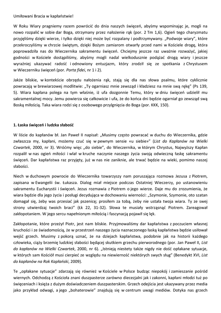 Umiłowani Bracia w kapłaństwie! W Roku Wiary pragniemy razem powrócić do dnia naszych święceń, abyśmy wspominając je, mogli na nowo rozpalić w sobie dar Boga, otrzymany przez nałożenie rąk (por. 2 Tm 1,6). Ogień tego charyzmatu przyjęliśmy dzięki wierze, i tylko dzięki niej może być rozpalany i podtrzymywany. „Podwoje wiary”, które przekroczyliśmy w chrzcie świętym, dzięki Bożym zamiarom otwarły przed nami w Kościele drogę, która poprowadziła nas do Wieczernika sakramentu święceń. Chciejmy jeszcze raz uważnie rozważyć, jakiej godności w Kościele dostąpiliśmy, abyśmy mogli nadal wielkodusznie podążać drogą wiary i jeszcze wyraźniej ukazywać radość i odnowiony entuzjazm, który zrodził się ze spotkania z Chrystusem w Wieczerniku święceń (por. Porta fidei, nr 1 i 2). Jakże bliskie, w kontekście obrzędu nałożenia rąk, stają się dla nas słowa psalmu, które cyklicznie powracają w brewiarzowej modlitwie: „Ty ogarniasz mnie zewsząd i kładziesz na mnie swą rękę” (Ps 139, 5). Wiara kapłana polega na tym właśnie, iż ufa dozgonnie Temu, który w dniu święceń udzielił mu sakramentalnej mocy. Jemu powierza się całkowicie i ufa, że do końca dni będzie ogarniał go zewsząd swą Boską miłością. Taka wiara rodzi się z osobowego przylgnięcia do Boga (por. KKK, 150). 1. Łaska święceń i ludzka słabość W liście do kapłanów bł. Jan Paweł II napisał: „Musimy często powracać w duchu do Wieczernika, gdzie zwłaszcza my, kapłani, możemy czuć się w pewnym sensie «u siebie»” (List do Kapłanów na Wielki Czwartek, 2000, nr 3). Wróćmy więc „do siebie”, do Wieczernika, w którym Chrystus, Najwyższy Kapłan rozpalił w nas ogień miłości i wlał w kruche naczynie naszego życia swoją odwieczną łaskę sakramentu święceń. Dar kapłaństwa raz przyjęty, już w nas nie zaniknie, ale trwać będzie na wieki, pomimo naszej słabości. Niech w duchowym powrocie do Wieczernika towarzyszy nam poruszająca rozmowa Jezusa z Piotrem, zapisana w Ewangelii św. Łukasza. Dialog miał miejsce podczas Ostatniej Wieczerzy, po ustanowieniu sakramentu Eucharystii i święceń. Jezus rozmawia z Piotrem o jego wierze. Daje mu do zrozumienia, że wiara będzie dla jego życia i posługi decydująca w dochowaniu wierności: „Szymonie, Szymonie, oto szatan domagał się, żeby was przesiać jak pszenicę; prosiłem za tobą, żeby nie ustała twoja wiara. Ty ze swej strony utwierdzaj twoich braci” (Łk 22, 31-32). Słowa te musiały wstrząsnąć Piotrem. Zareagował zakłopotaniem. W jego sercu napełnionym miłością i fascynacją pojawił się lęk. Zakłopotanie, które przeżył Piotr, jest nam bliskie. Przyjmowaliśmy dar kapłaństwa z poczuciem własnej kruchości i ze świadomością, że w przestrzeń naszego życia naznaczonego łaską kapłaństwa będzie usiłował wejść grzech. Musimy z pokorą uznać, że na dziejach kapłaństwa, podobnie jak na historii każdego człowieka, ciąży brzemię ludzkiej słabości będącej skutkiem grzechu pierworodnego (por. Jan Paweł II, List do kapłanów na Wielki Czwartek, 2000, nr 6). „Istnieją niestety także nigdy nie dość opłakane sytuacje, w których sam Kościół musi cierpieć ze względu na niewierność niektórych swych sług” (Benedykt XVI, List do kapłanów na Rok Kapłański, 2009). Te „opłakane sytuacje” zdarzają się również w Kościele w Polsce budząc niepokój i zamieszanie pośród wiernych. Odchodzą z Kościoła znani duszpasterze zarówno diecezjalni jak i zakonni, kapłani młodzi tuż po święceniach i księża z dużym doświadczeniem duszpasterskim. Grzech odejścia jest ukazywany przez media jako przykład odwagi, a jego „bohaterowie” znajdują się w centrum uwagi mediów. Dotyka nas grzech zdrady Mistrza, jak grzech Judasza. Zanika poczucie winy i odpowiedzialności za kapłaństwo i powierzony Lud Boży. W rozmowie z Piotrem, Pan Jezus uświadamia nam jednak, że misterium iniquitatismoże być przezwyciężone przez wymodloną i strzeżoną wiarę. Każdego dnia nie przestaje wołać za nami do Ojca, aby wiara nasza nie ustała i aby utwierdzała innych. Czyni to zwłaszcza, gdy in persona Christi sprawujemy Eucharystię. My ze swej strony, przed przyjęciem Jego Ciała i Krwi Pańskiej, powtarzamy z pokorą: „Nie pozwól mi nigdy odłączyć się od Ciebie”. Wyznajemy tym samym, że każdy dzień wierności w kapłaństwie jest łaską, wyproszoną przez Jezusa u Ojca, za cenę Jego ofiary z życia. 2. Adoracja i uniżenie Do tajemnicy święceń zbliżaliśmy się w postawie całkowitego ukorzenia, kładąc się krzyżem na ziemi, dotykając posadzki kościoła. Bł. Jan Paweł II wspominając dzień swoich święceń napisał: „W tej postawie leżenia krzyżem przed otrzymaniem święceń wyraża się najgłębszy sens duchowości kapłańskiej” (Jan Paweł II, Dar i tajemnica). Postawa leżenia krzyżem wyraża adorację Majestatu Boga i wdzięczną świadomość niczym niezasłużonej łaski kapłaństwa. Wyraża również najgłębsze uniżenie siebie, akt pokuty i najusilniejszą modlitwę. Nie może być jednak kojarzona jedynie z obrzędem święceń. Potrzebujemy stałego trwania w tej postawie, ilekroć sprawujemy Najświętsze Tajemnice. Niezasłużony dar kapłaństwa całkowicie nas przerasta. Nosimy go w kruchych naczyniach (por. 2 Kor 4, 7). Aby go traktować z szacunkiem i uważnie strzec, musimy nieustannie wychowywać siebie do adoracji, pokuty i modlitwy. Każdy akt pokuty przed celebracją Mszy świętej przypomina nam o tym. Drodzy Kapłani! W Wielki Piątek, jak co roku, powtórzymy z wiarą gest prostracji i uniżenia. W ten sposób, obejmując całym sobą Chrystusa Ukrzyżowanego, wyznamy wobec wiernych, że tak samo jak oni potrzebujemy ciągłego nawracania i łaski zbawienia. Uznając publicznie, w geście prostracji, własną grzeszność i potrzebę ł