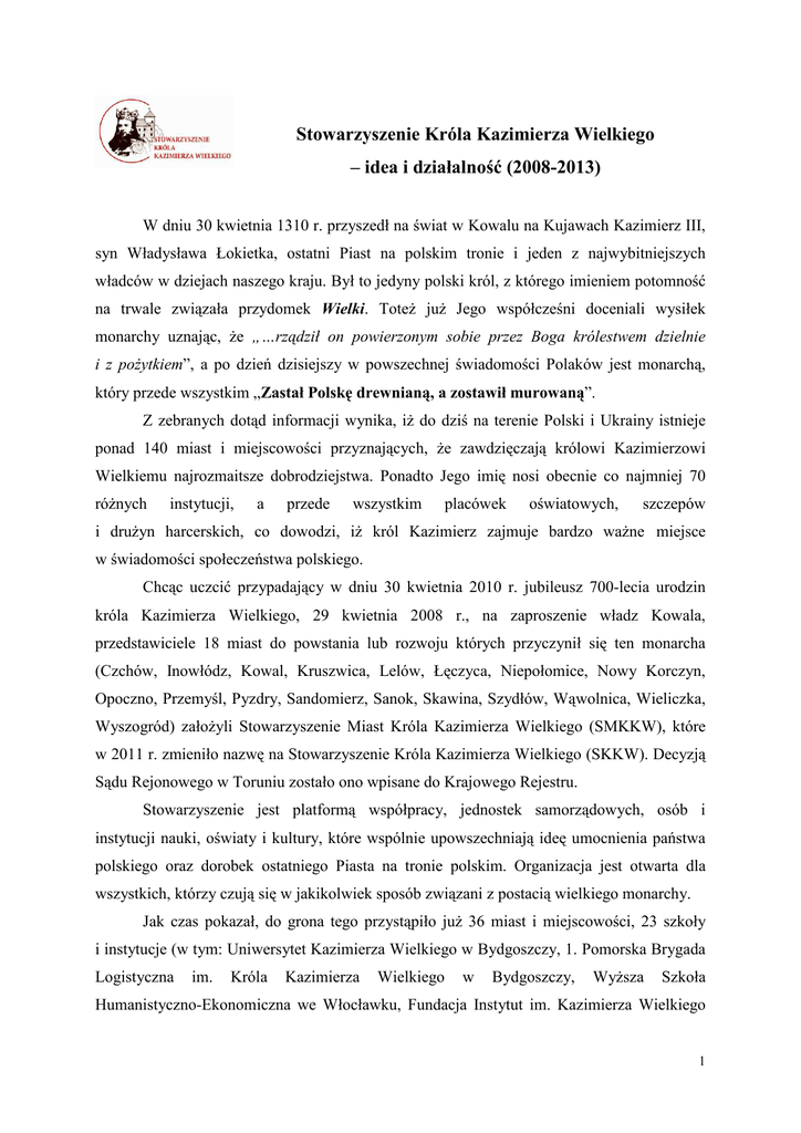 Stowarzyszenie Króla Kazimierza Wielkiego – idea i działalność (2008-2013) W dniu 30 kwietnia 1310 r. przyszedł na świat w Kowalu na Kujawach Kazimierz III, syn Władysława Łokietka, ostatni Piast na polskim tronie i jeden z najwybitniejszych władców w dziejach naszego kraju. Był to jedyny polski król, z którego imieniem potomność na trwale związała przydomek Wielki. ToteŜ juŜ Jego współcześni doceniali wysiłek monarchy uznając, Ŝe „…rządził on powierzonym sobie przez Boga królestwem dzielnie i z poŜytkiem”, a po dzień dzisiejszy w powszechnej świadomości Polaków jest monarchą, który przede wszystkim „Zastał Polskę drewnianą, a zostawił murowaną”. Z zebranych dotąd informacji wynika, iŜ do dziś na terenie Polski i Ukrainy istnieje ponad 140 miast i miejscowości przyznających, Ŝe zawdzięczają królowi Kazimierzowi Wielkiemu najrozmaitsze dobrodziejstwa. Ponadto Jego imię nosi obecnie co najmniej 70 róŜnych instytucji, a przede wszystkim placówek oświatowych, szczepów i druŜyn harcerskich, co dowodzi, iŜ król Kazimierz zajmuje bardzo waŜne miejsce w świadomości społeczeństwa polskiego. Chcąc uczcić przypadający w dniu 30 kwietnia 2010 r. jubileusz 700-lecia urodzin króla Kazimierza Wielkiego, 29 kwietnia 2008 r., na zaproszenie władz Kowala, przedstawiciele 18 miast do powstania lub rozwoju których przyczynił się ten monarcha (Czchów, Inowłódz, Kowal, Kruszwica, Lelów, Łęczyca, Niepołomice, Nowy Korczyn, Opoczno, Przemyśl, Pyzdry, Sandomierz, Sanok, Skawina, Szydłów, Wąwolnica, Wieliczka, Wyszogród) załoŜyli Stowarzyszenie Miast Króla Kazimierza Wielkiego (SMKKW), które w 2011 r. zmieniło nazwę na Stowarzyszenie Króla Kazimierza Wielkiego (SKKW). Decyzją Sądu Rejonowego w Toruniu zostało ono wpisane do Krajowego Rejestru. Stowarzyszenie jest platformą współpracy, jednostek samorządowych, osób i instytucji nauki, oświaty i kultury, które wspólnie upowszechniają ideę umocnienia państwa polskiego oraz dorobek ostatniego Piasta na tronie polskim. Organizacja jest otwarta dla wszystkich, którzy czują się w jakikolwiek sposób związani z postacią wielkiego monarchy. Jak czas pokazał, do grona tego przystąpiło juŜ 36 miast i miejscowości, 23 szkoły i instytucje (w tym: Uniwersytet Kazimierza Wielkiego w Bydgoszczy, 1. Pomorska Brygada Logistyczna im. Króla Kazimierza Wielkiego w Bydgoszczy, WyŜsza Szkoła Humanistyczno-Ekonomiczna we Włocławku, Fundacja Instytut im. Kazimierza Wielkiego 1 w Lublinie), które za patrona mają Kazimierza Wielkiego oraz 85 osób indywidualnych (m.in.: profesorowie Jerzy Wyrozumski – Honorowy Członek >>SKKW<< z Krakowa, Antoni Barciak z Katowic, Stanisław Kunikowski z Włocławka, Jacek Maciejewski z Bydgoszczy) oraz bardzo wielu historyków z tytułami doktorskimi. Ogólnopolski charakter SKKW postawił przed jego władzami bardzo istotną kwestię opracowania koncepcji komunikowania się jego członków poprzez stronę internetową www.kazimierzwielki.pl, która znakomicie spełnia swoje zadania w dobie upowszechniania internetu. Kolejnym waŜnym krokiem na drodze wzajemnej komunikacji oraz współpracy stał się periodyk o charakterze ogólnopolskim „Zapiski Kazimierzowskie”, którego 10 numerów nieodpłatnie dotarło do wszystkich członków oraz grodów kazimierzowskich. Działalność Stowarzyszenia jest inicjatywą skierowaną w pierwszym rzędzie do tych samorządów, organizacji i instytucji, które dumne ze swych królewskich koneksji, kultywują pamięć o Nim nie tylko w swoim lokalnym środowisku. Stąd teŜ, przy całej otwartości na nowe pomysły i idee, uznano, Ŝe głównymi celami SKKW, są: • Popularyzacja dorobku króla Kazimierza Wielkiego, a zarazem ogólnopolska promocja miast kazimierzowskich. • Nawiązywanie partnerskiej współpracy pomiędzy miastami stowarzyszonymi, w celu stworzenia sieci miast kazimierzowskich, a w dłuŜszej perspektywie szlaków turystycznych, które będą je łączyły. • Koordynacja działań oraz wymiana doświadczeń i informacji między miastami członkowskimi w celu upowszechnienia wspólnych tradycji historycznych, kulturalnych i gospodarczych. • Wspieranie działań popularyzujących dorobek polskich rodów królewskich z okresu średniowiecza, ze szczególnym uwzględnieniem czasów panowania króla Kazimierza Wielkiego, między innymi poprzez organizowanie ogólnopolskich konkursów wiedzy i turniejów dla dzieci oraz młodzieŜy. • Inicjowanie współpracy instytucji, organizacji i innych podmiotów, w tym zwłaszcza szkół, mających za swojego patrona króla Kazimierza Wielkiego. • Dokumentowanie oraz upowszechnianie informacji dotyczących osoby króla, Jego czasów oraz pielęgnowania tradycji kazimierzowskich w miastach i miejscowościach na terenie Polski na łamach periodyku „Zapiski Kazimierzowskie” oraz w innych wydawnictwach. 2 W czasie minionego okresu działalności (29 IV 2008 r. – 31 VIII 2013 r.) Stowarzyszenia do najwaŜniejszych przedsięwzięć zrealizowanych lub współrealizowanych naleŜy zaliczyć: • Wizytę prezesa Stowarzyszenia w dniu 12 II 2009 r. u Bronisława Komorowskiego – marszałka Sejmu RP, której przedmiotem była problematyka działalności Stowarzyszenia oraz uczczenia obchodów jubileuszu urodzin króla Kazimierza Wielkiego. • Odbycie kolejnych eliminacji oraz finału „Ogólnopolskiego Konkursu Wiedzy o Kazimierzu Wielkim i Jego Czasach”, którego głównym realizatorem jest Uniwersytet Kazimierza Wielkiego w Bydgoszczy. • Inaugurację mszą świętą w intencji króla Kazimierza Wielkiego obchodów jubileuszu urodzin monarchy w krakowskiej katedrze na Wawelu w dniu 30 IV 2009 r., którą sprawował ks. bp prof. Tadeusz Pieronek. • Zorganizowanie w dniach 21 VI 2009 r., 18-20 VI 2010 r., 19 VI 2011 r., 11 VI 2012 r., 24 VI 2013 r. przez władze samorządowe Przemyśla oraz Przemyskie Centrum Kultury