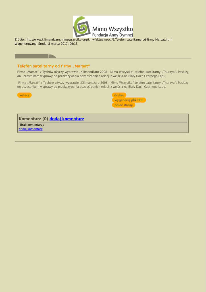 Źródło: http://www.kilimandzaro.mimowszystko.org/kmw/aktualnosci/6,Telefon-satelitarny-od-firmy-Marsat.html Wygenerowano: Środa, 8 marca 2017, 09:13 Telefon satelitarny od firmy „Marsat” Firma „Marsat” z Tychów użyczy wyprawie „Kilimandżaro 2008 - Mimo Wszystko” telefon satelitarny „Thuraya”. Posłuży on uczestnikom wyprawy do przekazywania bezpośrednich relacji z wejścia na Biały Dach Czarnego Lądu. Firma „Marsat” z Tychów użyczy wyprawie „Kilimandżaro 2008 - Mimo Wszystko” telefon satelitarny „Thuraya”. Posłuży on uczestnikom wyprawy do przekazywania bezpośrednich relacji z wejścia na Biały Dach Czarnego Lądu. Komentarz (0) dodaj komentarz Brak komentarzy dodaj komentarz