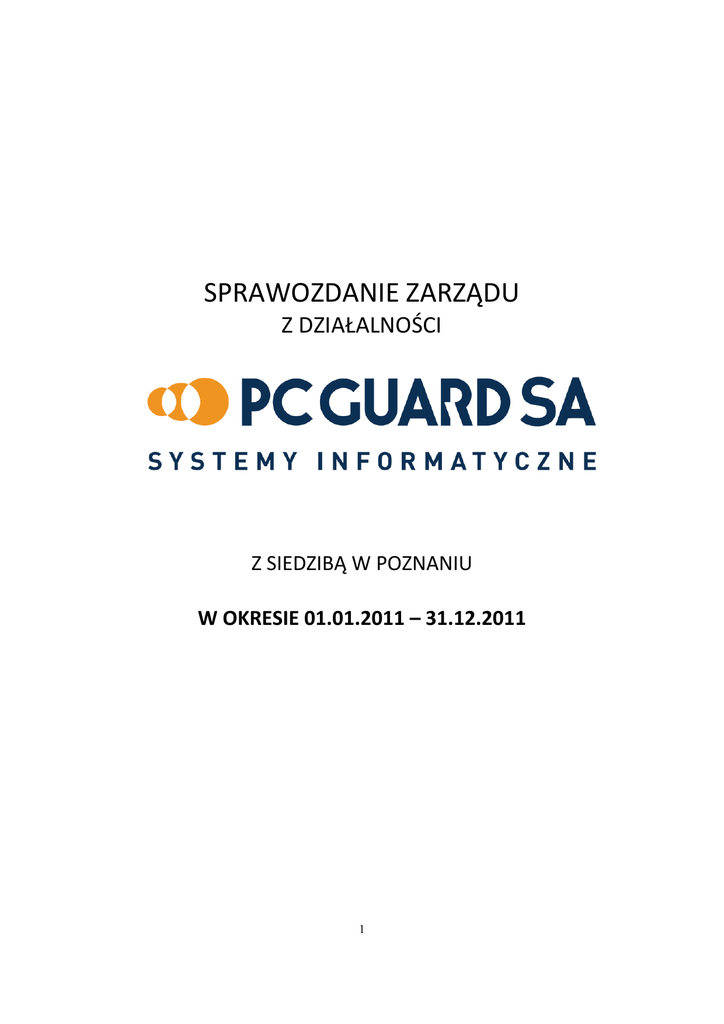 SPRAWOZDANIE ZARZĄDU Z DZIAŁALNOŚCI Z SIEDZIBĄ W POZNANIU W OKRESIE 01.01.2011 – 31.12.2011 1 I. Stan prawny i władze Spółki: Pełna nazwa podmiotu: PC Guard Spółka Akcyjna Adres siedziby: ul. Jasielska 16, 60-476 Poznań Z dniem 04 czerwca 2007 roku Spółka prowadzi działalność pod adresem: 60-476 Poznań, ul. Jasielska 16. W dniu 18.06.2007 roku postanowieniem Sądu Rejonowego w Poznaniu XXI Wydział Gospodarczy Krajowego Rejestru Sądowego został dokonany wpis o zmianie adresu prowadzenia działalności. Spółka została wpisana do Rejestru Przedsiębiorców prowadzonego przez Sąd Rejonowy w Poznaniu XXI Wydział Gospodarczy pod numerem KRS 0000137173 w dniu 31.10.2002 roku. Spółka posiada dwa Biura Handlowe: 1. Warszawa przy ul. Kierbedzia 4, 2. Katowice przy ul. Czerwińskiego 3. Lublin przy ul. Związkowej 23 Podstawowym przedmiotem działalności biur handlowych jest sprzedaż i wdrażanie oraz nadzór nad systemem Graffiti. Biura handlowe nie prowadzą działalności w zakresie sprzedaży i wdrażania systemów obcych jak również nie dokonują sprzedaży sprzętu komputerowego. Spółka została zawiązana: 02.08.2000 r. Podstawowy przedmiot działalności Spółki według EKD: 7220Z działalność w zakresie oprogramowania Władze Spółki: Dariusz Grześkowiak Mariusz Bławat - Prezes Zarządu, - Członek Zarządu. W skład Rady Nadzorczej na dzień 31 grudnia 2011 roku wchodzili: 1. Łukasz Motała - Przewodniczący Rady Nadzorczej 2. Paweł Narkiewicz - Członek RN 3. Tomasz Pańczyk - Członek RN 4. Katarzyna Kozłowska – Członek RN 5. Daria Motała - Członek RN. Rada Nadzorcza (stan na początek roku): 1. Łukasz Motała - Przewodniczący Rady Nadzorczej 2. Paweł Narkiewicz – Członek RN 3. Daria Motała - Członek RN 4. Tomasz Owczarzak - Członek RN 5. Wojciech Skiba - Członek RN. Rada Nadzorcza po WZA z dnia 13 czerwca 2011 roku: 1. Łukasz Motała - Przewodniczący Rady Nadzorczej 2. Paweł Narkiewicz - Członek RN 3. Tomasz Pańczyk - Członek RN 4. Katarzyna Kozłowska – Członek RN 5. Wojciech Skiba - Członek RN. 2 II. Charakterystyka działalności Spółki (produkty, rynki zbytu i zaopatrzenia, umowy) Przedmiotem działalności spółki jest dostarczanie i wdrażanie nowoczesnych i kompleksowych rozwiązań z zakresu zaawansowanych technologii informatycznych. Podstawowym produktem oferowanym przez spółkę jest zintegrowany system informatyczny do wspomagania zarządzania przedsiębiorstwem - Graffiti.ERP Strategicznym segmentem rynkowym zainteresowań spółki jest przemysł. Wynika to z zakresu funkcjonalnego jaki oferowany jest przez system Graffiti, który stanowi główny produkt spółki. Nawiązanie współpracy z potencjalnymi odbiorcami wymaga znacznych nakładów marketingowych. W roku obrotowym 2011 spółka poprzez własny Dział Handlowy oraz Biura Handlowe zawarła umowy sprzedaży licencji oraz wdrożenia systemu Graffiti z 37 podmiotami. Poprzez Dystrybutorów, z którymi zawarte zostały umowy dystrybucji, zostało sprzedanych 12 licencji wraz z usługą wdrożenia. Pozyskano również 3 nowych dystrybutorów. Spółka w ramach umów serwisowych systemu Graffiti obsługiwała na koniec roku obrotowego 2011 – 68 podmiotów. Spółka w roku obrotowym 2010 korzystała z usług bankowych w: ING Bank Śląski S.A. Oddział Regionalny w Poznaniu rachunek podstawowy i ZFŚS, BZ WBK S.A. 2 Oddział w Poznaniu – rachunek pomocniczy, Spółka w roku obrotowym 2011 kontynuowała następujące umowy ubezpieczenia: Allianz S.A. - umowa ubezpieczenia majątku trwałego i wyposażenia spółki. PZU S.A. - polisa pakietowa do samochodów służbowych TUiR WARTA S.A. - ubezpieczenie odpowiedzialności cywilnej od prowadzonej działalności. III. Osiągnięcia Spółki PC Guard SA w rozpatrywanym okresie uzyskał przychody netto ze sprzedaży w kwocie 6.892 tys. zł. Jest to spadek o 9,0% w stosunku do roku ubiegłego. Na działalności operacyjnej spółka wypracowała zysk w wysokości 973 tys. zł, przy zysku w wysokości 1.436 tys. zł w roku ubiegłym. W trakcie okresu sprawozdawczego rozszerzano zakres modelowych procedur pozyskania potencjalnego klienta dostosowując go to segmentu rynku w jakim chce poruszać się Emitent. W trakcie trwania okresu sprawozdawczego Emitent zawierał nowe umowy sprzedaży licencji oraz prowadził projekty wdrożeń zgodnie z literą umów zawartych w okresach poprzednich. Spółka nieustająco rozszerza oprogramowanie, które jest podstawowym źródłem przychodów. Rozszerzenia funkcjonalne realizowane w trakcie okresu sprawozdawczego są pochodną zarówno projektów własnych jak i inicjatyw odbiorców Spółki. 3 Kontynuowano prace nad rozwojem systemu Ascent.DBI, tak aby zaspokoić potrzeby funkcjonalne oprogramowania dla szerszego obszaru rynku. W I kwartale 2011 roku emitent utworzył 2 spółki zależne: - CG Finanse Sp. z o.o. z siedzibą w Poznaniu z kapitałem zakładowym 200.000 zł, w której objął 100% udziałów, - 2Intellect.com Sp. z o.o. z siedzibą w Poznaniu z kapitałem zakładowym 400.000 zł, w której objął 75% udziałów. W dniu 29 czerwca 2011 roku emitent dokonał zakupu 5.625.589 szt. akcji spółki Imagis S.A. z siedzibą w Warszawie o łącznej wartości 46,4 mln zł (w tym 11,9 mln zobowiązania warunkowego), co stanowi 71,9% udziałów w spółce. W lipcu 2011 emitent kontynuował skup akcji i w dniu 18 lipca 2011 roku osiągnął 100% udział w spółce. Łączna wartość poniesionych wydatków wyniosła 64,5 mln zł ( w tym 16,5 mln zł zobowiązania warunkowego). Emitent prowadził sprzedaż systemów przez Centralę w Poznaniu oraz przez biura handlowe w Warszawie i Katowicach (dane w tys. zł) źródła przychodów Biura Handlowego Warszawa sprzedaż licencji usługi wdrożenia usługi serwisowe 2011 2010 702 1148 385 875 657 441 zmiana % -19,7% +74,7% -14,5% (dane w tys. zł) źródła przychodów Biura Handlowego Katowice sprzedaż licencji usłu