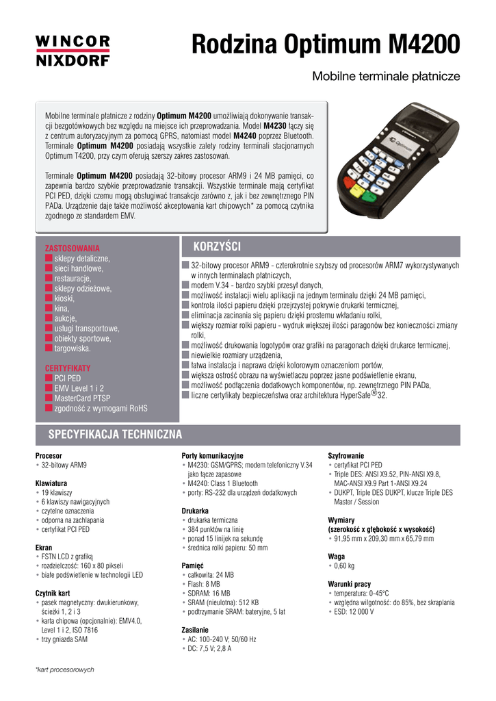 Rodzina Optimum M4200 Mobilne terminale płatnicze Mobilne terminale płatnicze z rodziny Optimum M4200 umożliwiają dokonywanie transakcji bezgotówkowych bez względu na miejsce ich przeprowadzania. Model M4230 łączy się z centrum autoryzacyjnym za pomocą GPRS, natomiast model M4240 poprzez Bluetooth. Terminale Optimum M4200 posiadają wszystkie zalety rodziny terminali stacjonarnych Optimum T4200, przy czym oferują szerszy zakres zastosowań. Terminale Optimum M4200 posiadają 32-bitowy procesor ARM9 i 24 MB pamięci, co zapewnia bardzo szybkie przeprowadzanie transakcji. Wszystkie terminale mają certyfikat PCI PED, dzięki czemu mogą obsługiwać transakcje zarówno z, jak i bez zewnętrznego PIN PADa. Urządzenie daje także możliwość akceptowania kart chipowych* za pomocą czytnika zgodnego ze standardem EMV. KORZYŚCI ZASTOSOWANIA sklepy detaliczne, sieci handlowe, restauracje, sklepy odzieżowe, kioski, kina, aukcje, usługi transportowe, obiekty sportowe, targowiska. 3 2-bitowy procesor ARM9 - czterokrotnie szybszy od procesorów ARM7 wykorzystywanych w innych terminalach płatniczych, modem V.34 - bardzo szybki przesył danych, możliwość instalacji wielu aplikacji na jednym terminalu dzięki 24 MB pamięci, kontrola ilości papieru dzięki przejrzystej pokrywie drukarki termicznej, eliminacja zacinania się papieru dzięki prostemu wkładaniu rolki, większy rozmiar rolki papieru - wydruk większej ilości paragonów bez konieczności zmiany rolki, możliwość drukowania logotypów oraz grafiki na paragonach dzięki drukarce termicznej, niewielkie rozmiary urządzenia, łatwa instalacja i naprawa dzięki kolorowym oznaczeniom portów, większa ostrość obrazu na wyświetlaczu poprzez jasne podświetlenie ekranu, możliwość podłączenia dodatkowych komponentów, np. zewnętrznego PIN PADa, liczne certyfikaty bezpieczeństwa oraz architektura HyperSafe®32. CERTYFIKATY PCI PED EMV Level 1 i 2 MasterCard PTSP zgodność z wymogami RoHS SPECYFIKACJA TECHNICZNA Procesor • 32-bitowy ARM9 Klawiatura • 19 klawiszy • 6 klawiszy nawigacyjnych • czytelne oznaczenia • odporna na zachlapania • certyfikat PCI PED Ekran • FSTN LCD z grafiką • rozdzielczość: 160 x 80 pikseli • białe podświetlenie w technologii LED Czytnik kart • p asek magnetyczny: dwukierunkowy, ścieżki 1, 2 i 3 • k arta chipowa (opcjonalnie): EMV4.0, Level 1 i 2, ISO 7816 • trzy gniazda SAM *kart procesorowych Porty komunikacyjne • M4230: GSM/GPRS; modem telefoniczny V.34 jako łącze zapasowe • M4240: Class 1 Bluetooth • porty: RS-232 dla urządzeń dodatkowych Drukarka • drukarka termiczna • 384 punktów na linię • ponad 15 linijek na sekundę • średnica rolki papieru: 50 mm Pamięć • całkowita: 24 MB • Flash: 8 MB • SDRAM: 16 MB • SRAM (nieulotna): 512 KB • podtrzymanie SRAM: bateryjne, 5 lat Zasilanie • AC: 100-240 V; 50/60 Hz • DC: 7,5 V; 2,8 A Szyfrowanie • certyfikat PCI PED • Triple DES: ANSI X9.52, PIN-ANSI X9.8, MAC-ANSI X9.9 Part 1-ANSI X9.24 • DUKPT, Triple DES DUKPT, klucze Triple DES Master / Session Wymiary (szerokość x głębokość x wysokość) • 91,95 mm x 209,30 mm x 65,79 mm Waga • 0,60 kg Warunki pracy • temperatura: 0-45°C • względna wilgotność: do 85%, bez skraplania • ESD: 12 000 V
