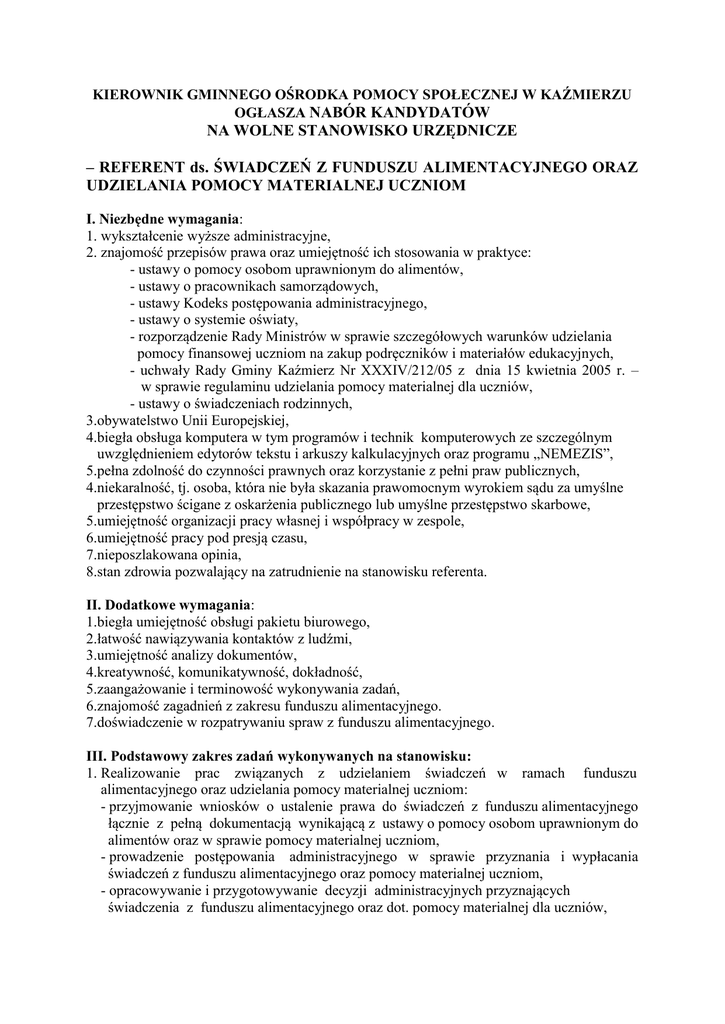 KIEROWNIK GMINNEGO OŚRODKA POMOCY SPOŁECZNEJ W KAŹMIERZU OGŁASZA NABÓR KANDYDATÓW NA WOLNE STANOWISKO URZĘDNICZE – REFERENT ds. ŚWIADCZEŃ Z FUNDUSZU ALIMENTACYJNEGO ORAZ UDZIELANIA POMOCY MATERIALNEJ UCZNIOM I. Niezbędne wymagania: 1. wykształcenie wyższe administracyjne, 2. znajomość przepisów prawa oraz umiejętność ich stosowania w praktyce: - ustawy o pomocy osobom uprawnionym do alimentów, - ustawy o pracownikach samorządowych, - ustawy Kodeks postępowania administracyjnego, - ustawy o systemie oświaty, - rozporządzenie Rady Ministrów w sprawie szczegółowych warunków udzielania pomocy finansowej uczniom na zakup podręczników i materiałów edukacyjnych, - uchwały Rady Gminy Kaźmierz Nr XXXIV/212/05 z dnia 15 kwietnia 2005 r. – w sprawie regulaminu udzielania pomocy materialnej dla uczniów, - ustawy o świadczeniach rodzinnych, 3.obywatelstwo Unii Europejskiej, 4.biegła obsługa komputera w tym programów i technik komputerowych ze szczególnym uwzględnieniem edytorów tekstu i arkuszy kalkulacyjnych oraz programu „NEMEZIS”, 5.pełna zdolność do czynności prawnych oraz korzystanie z pełni praw publicznych, 4.niekaralność, tj. osoba, która nie była skazania prawomocnym wyrokiem sądu za umyślne przestępstwo ścigane z oskarżenia publicznego lub umyślne przestępstwo skarbowe, 5.umiejętność organizacji pracy własnej i współpracy w zespole, 6.umiejętność pracy pod presją czasu, 7.nieposzlakowana opinia, 8.stan zdrowia pozwalający na zatrudnienie na stanowisku referenta. II. Dodatkowe wymagania: 1.biegła umiejętność obsługi pakietu biurowego, 2.łatwość nawiązywania kontaktów z ludźmi, 3.umiejętność analizy dokumentów, 4.kreatywność, komunikatywność, dokładność, 5.zaangażowanie i terminowość wykonywania zadań, 6.znajomość zagadnień z zakresu funduszu alimentacyjnego. 7.doświadczenie w rozpatrywaniu spraw z funduszu alimentacyjnego. III. Podstawowy zakres zadań wykonywanych na stanowisku: 1. Realizowanie prac związanych z udzielaniem świadczeń w ramach funduszu alimentacyjnego oraz udzielania pomocy materialnej uczniom: - przyjmowanie wniosków o ustalenie prawa do świadczeń z funduszu alimentacyjnego łącznie z pełną dokumentacją wynikającą z ustawy o pomocy osobom uprawnionym do alimentów oraz w sprawie pomocy materialnej uczniom, - prowadzenie postępowania administracyjnego w sprawie przyznania i wypłacania świadczeń z funduszu alimentacyjnego oraz pomocy materialnej uczniom, - opracowywanie i przygotowywanie decyzji administracyjnych przyznających świadczenia z funduszu alimentacyjnego oraz dot. pomocy materialnej dla uczniów, - sporządzanie list wypłat świadczeń pieniężnych, przelewów bankowych, przekazów oraz przesyłek pocztowych, - terminowe przyznawanie i realizowanie świadczeń, - prowadzenie postępowania wobec dłużników alimentacyjnych, współpraca z sądem, komornikami, policją i innymi jednostkami organizacyjnymi - odpowiedzialność za prawidłowe naliczanie wysokości świadczeń, - prowadzenie windykacji należności z funduszu alimentacyjnego, - przeprowadzanie wywiadów alimentacyjnych i odbieranie oświadczeń majątkowych, - opracowywanie potrzeb i środków na fundusz alimentacyjny oraz na pomoc materialną dla uczniów na dany rok, - opracowywanie i sporządzanie sprawozdań statystycznych i sprawozdań z zakresu funduszu alimentacyjnego oraz z pomocy materialnej dla uczniów, - wydawanie formularzy świadczeń osobom uprawnionym do funduszu alimentacyjnego oraz pomocy materialnej dla uczniów, - wyczerpujące informowanie interesantów o trybie postępowania w sprawach dotyczących uprawnień do funduszu alimentacyjnego, wymaganych dokumentach, oraz procedurach ich przyznawania oraz pomocy materialnej dla uczniów, - bieżąca analiza przepisów prawnych i ich interpretacja, - sprawdzanie merytoryczne wniosków i ich kompletności oraz zgodności z przepisami dokumentów niezbędnych do przyznawania świadczeń, - prawidłowe przechowywanie dokumentacji oraz przygotowywanie jej do przekazania do archiwizacji zgodnie z instrukcją kancelaryjną, - prowadzenie rejestru wniosków, wydawanych decyzji i kartotek świadczeniobiorców, - wykonywanie wszystkich czynności związanych z obsługą programu komputerowego NEMEZIS, - prowadzenie rejestru korespondencji wychodzącej i przychodzącej do Ośrodka. 2. Niezależnie od powyższego kierownik Ośrodka może zlecić wykonywanie innych czynności służbowych nie objętych niniejszym zakresem czynności lecz związanych z pomocą społeczną m.in.: - wydawanie formularzy świadczeń osobom uprawnionym do świadczeń rodzinnych, - wyczerpujące informowanie interesantów o trybie postępowania w sprawach dotyczących uprawnień do świadczeń rodzinnych, wymaganych dokumentach oraz procedurach ich przyznawania, - przyjmowanie wniosków o świadczenia rodzinne, - sprawdzanie merytoryczne wniosków i ich kompletności oraz zgodności z przepisami dokumentów niezbędnych do przyznawania świadczeń, - ustalanie prawa do świadczeń na podstawie złożonych wniosków, - obsługa systemu komputerowego świadczeń rodzinnych, - prowadzenie teczek spraw świadczeniobiorców zgodnie z instrukcja kancelaryjną. IV. Informacja o warunkach pracy na danym stanowisku: 1.miejsce wykonywania pracy: Gminny Ośrodek Pomocy Społecznej w Kaźmierzu przy ul. Szamotulskiej 20c, 2.stanowisko pracy: referent ds. świadczeń z funduszu alimentacyjnego oraz udzielania pomocy materialnej uczniom, 3.czas pracy: pełen etat na czas określony z możliwością przedłużenia, 4.praca od 3 sierpnia 2015 r. V. Wymagane dokumenty: 1. podanie o przyjęcie do pracy z dokładnym adresem, telefonem oraz adresem e-mail., 2. CV ze zdjęciem, 3. kserokopie dokumentów poświadczających posiadane wykształcenie, 4. inne dodatkowe dokumenty o posiadanych kwalifikacjach i umiejętnościach, 5. kwestionariusz osobowy dla osób ubiegają