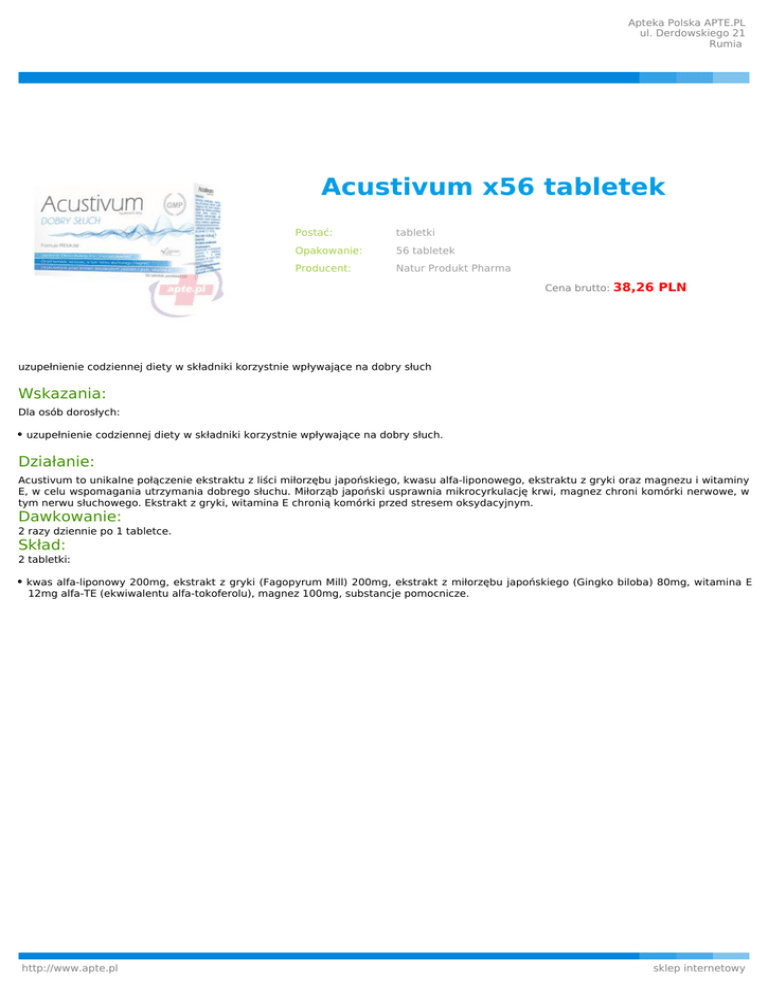 Apteka Polska APTE.PL ul. Derdowskiego 21 Rumia Acustivum x56 tabletek Postać: tabletki Opakowanie: 56 tabletek Producent: Natur Produkt Pharma Cena brutto: 38,26 PLN uzupełnienie codziennej diety w składniki korzystnie wpływające na dobry słuch Wskazania: Dla osób dorosłych: uzupełnienie codziennej diety w składniki korzystnie wpływające na dobry słuch. Działanie: Acustivum to unikalne połączenie ekstraktu z liści miłorzębu japońskiego, kwasu alfa-liponowego, ekstraktu z gryki oraz magnezu i witaminy E, w celu wspomagania utrzymania dobrego słuchu. Miłorząb japoński usprawnia mikrocyrkulację krwi, magnez chroni komórki nerwowe, w tym nerwu słuchowego. Ekstrakt z gryki, witamina E chronią komórki przed stresem oksydacyjnym. Dawkowanie: 2 razy dziennie po 1 tabletce. Skład: 2 tabletki: kwas alfa-liponowy 200mg, ekstrakt z gryki (Fagopyrum Mill) 200mg, ekstrakt z miłorzębu japońskiego (Gingko biloba) 80mg, witamina E 12mg alfa-TE (ekwiwalentu alfa-tokoferolu), magnez 100mg, substancje pomocnicze. http://www.apte.pl sklep internetowy