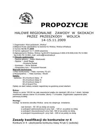 PROPOZYCJE HALOWE REGIONALNE ZAWODY W SKOKACH PRZEZ PRZESZKODY WOLICA 14-15.11.2009 1.Organizator: Klub jeździecki „Wolica” 2.Miejsce:Kryta ujeżdżalnia na terenie KJ Wolica, Wolica k/Kalisza 3.Termin:14-15.11.2009 4.Termin zgłoszeń:12.11.2009 pisemnie 5.Zgłoszenia;KJ Wolica, Wolica 1g,62-872 Godziesze 0-604-418-509,0-62-76-12-564 fax.0-62-76-12-564.,mail: [email protected] 6.Obsada sędziowska: - Sędzia główny – Adam Markowski - Sędzia - Józef Śląski - Krystyna Rybak - Komisarz – Anna Stanek - Gospodarz toru – Krzysztof Kierzek Warunki techniczne: 1.Plac konkursowy – Hala: rozmiary 70 x21 2.Rozprężalnia – : Hala rozmiary 40x20 Opłaty; wpisowe: 35 zł konkurs klasy P 40 zł konkurs klasy N 50 zł konkurs klasy C 60 zł Grand Prix Opłaty za start należy wnieść najpóźniej na godzinę przed startem Boksy: Boksy w cenie 150.00 na całe zawody(od piątku do niedzieli ),90 zł za 1 dzień. Istnieje możliwość zakupu siana-10 zł kostka ,słomy -7 zł kostka. Organizator zapewnia tylko pierwszą ściółkę. Noclegi : noclegi na terenie ośrodka Wolica cena nie obejmuje śniadania nad domem - 50 .00 za dobę od osoby w pokojach jednoosobowych przy hali – 120 zł za pokój na dobę w pokojach dwuosobowych przy hali -160 zł za pokój na dobę. w pokojach trzyosobowych przy hali – 220 zł za pokój na dobę Zasady kwalifikacji do konkursów nr 4 Konkurs nr 4 –ukończenie konkursu klasy N lub C (sobota) Program zawodów: SOBOTA 14.11.2009 Godzina 11.00 - konkursy w ramach zawodów towarzyskich (patrz oddzielne propozycje) Godzina 14.00 Konkurs nr 1 P Konkurs nr 2 N Konkurs nr 3 C dwufazowy dwufazowy z jokerem art.274.5.3. art.274.5.3. art.269.5 NIEDZIELA 15.11.2009 Godzina 11.00 - konkursy w ramach zawodów towarzyskich (patrz oddzielne propozycje) Godzina .14.00 Konkurs nr 4 C Konkurs nr 5 P Konkurs nr 6 N Grand Prix zwykły z rozgrywką art.238.2.2 z jokerem art.269.5 z jokerem art.269.5 Nagrody: -. flot’s dla 25% startujących w konkursie - puchary za 3 pierwsze miejsca konkursach P, N - Konkurs klasy P I –m-ce -300zł ,II m-ce -200 zł, III m-ce 100zł - Konkurs klasy N I m-ce -400zł ,II m-ce -300 zł ,III m-ce -200 zł - Konkurs klasy C I m-ce -400zł ,II m-ce -300 zł ,III m-ce -200 zł - Grand Prix C I m-ce -800 zł ,II m-ce 400 zł ,III m-ce 200 zł Przy wypłacie nagród ma zastosowanie Art.2 par.3 Regulaminu Krajowych Zawodów w skokach przez przeszkody 2005 rok Sprawy organizacyjne 1.Organizator zastrzega sobie możliwość zmian w programie zawodów. 2.Organizator nie odpowiada za wypadki, kradzieże i inne zdarzenia losowe mogące mieć miejsce podczas trwania zawodów oraz podczas transportu. 3.Dokumentacja zawodników i koni wg przepisów PZJ 4.Zmiany na listach startowych lub zgłoszenia w dniu zawodów dodatkowa opłata 20.00. Propozycje konkursów towarzyskich rozgrywanych przy okazji zawodów regionalnych 1.Ranga –Zawody Towarzyskie 2.Wpisowe – konkurs zręcznościowy -15 zł od startu Kuce -25 zł LL, L dokładności -30 zł L dwufazowy -35 zł Finał Amatorów – 50 zł SOBOTA 14.11.2009 Godzina 10.00 Konkurs nr T1 Konkurs nr T2 Konkurs nr T3 Konkurs nr T4 Konkurs nr T5 Konkurs nr T6 dla kuców zręcznościowy „pierwszy start” 60 cm dla kuców dokładności 80 cm dla kuców dwufazowy LL dokładności L dokładności L dwufazowy * art.238.1.1 art.274.5.3 art.238.1.1 art.238.1.1 art.274.5.3. NIEDZIELA 15.11.2009 Godzina 10.00 Konkurs nr T7 dla kuców zręcznościowy „pierwszy start” Konkurs nr T8 60 cm dla kuców dokładności Konkurs nr T9 80 cm dla kuców dwufazowy Konkurs nr T10 LL dokładności Konkurs nr T11 L dokładności Konkurs nr T12 L Finał Amatorów zwykły z rozgrywką * art.238.1.1 art.274.5.3 art.238.1.1 art.238.1.1 art.238.2.2 Nagrody: - Finał Amatorów I m-ce – 400 zł ,II m-ce -300 zł , III m-ce -200 zł - Konkurs T6 nagrody rzeczowe -Flots dla 25 % startujących w konkursach - Dla konkursów kucowych –upominki *W konkursie zręcznościowym do pokonania będzie tor przeszkód składający się z slalomu ,bramek , przeszkód –krzyżaków o wys. ok. 20 cm itp