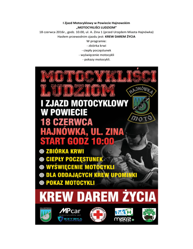 I Zjazd Motocyklowy w Powiecie Hajnowskim „MOTOCYKLIŚCI LUDZIOM” 18 czerwca 2016r., godz. 10.00, ul. A. Zina 1 (przed Urzędem Miasta Hajnówka) Hasłem przewodnim zjazdu jest: KREW DAREM ŻYCIA W programie: - zbiórka krwi - ciepły poczęstunek - wyświęcenie motocykli - pokazy motocykli.