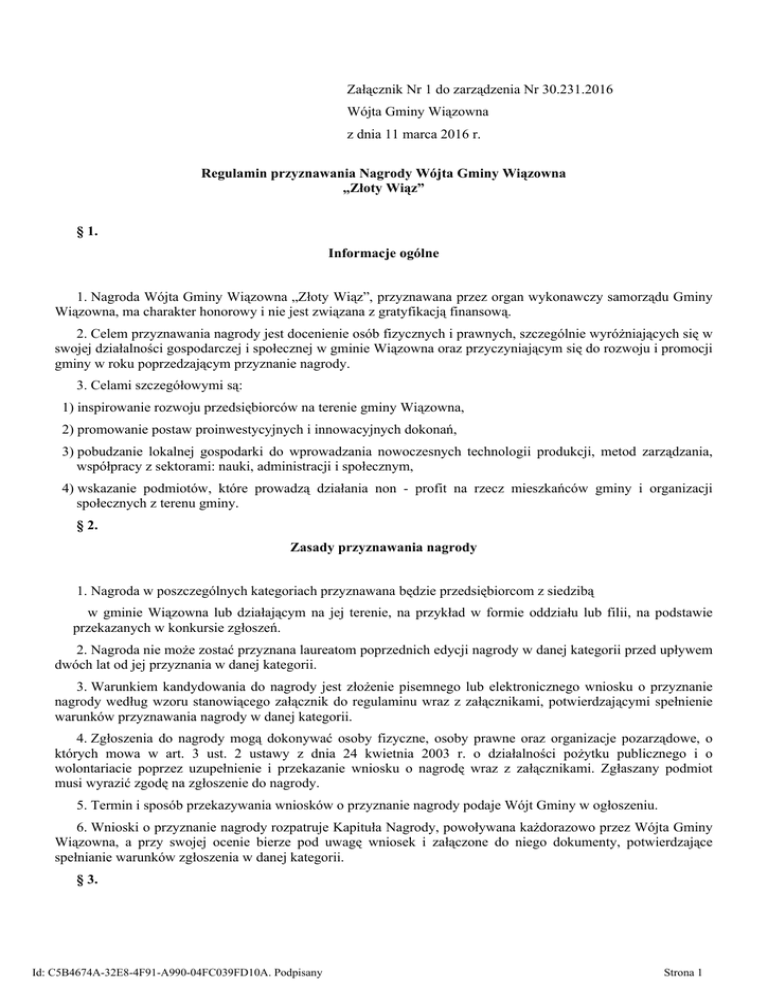 Załącznik Nr 1 do zarządzenia Nr 30.231.2016 Wójta Gminy Wiązowna z dnia 11 marca 2016 r. Regulamin przyznawania Nagrody Wójta Gminy Wiązowna „Złoty Wiąz” § 1. Informacje ogólne 1. Nagroda Wójta Gminy Wiązowna „Złoty Wiąz”, przyznawana przez organ wykonawczy samorządu Gminy Wiązowna, ma charakter honorowy i nie jest związana z gratyfikacją finansową. 2. Celem przyznawania nagrody jest docenienie osób fizycznych i prawnych, szczególnie wyróżniających się w swojej działalności gospodarczej i społecznej w gminie Wiązowna oraz przyczyniającym się do rozwoju i promocji gminy w roku poprzedzającym przyznanie nagrody. 3. Celami szczegółowymi są: 1) inspirowanie rozwoju przedsiębiorców na terenie gminy Wiązowna, 2) promowanie postaw proinwestycyjnych i innowacyjnych dokonań, 3) pobudzanie lokalnej gospodarki do wprowadzania nowoczesnych technologii produkcji, metod zarządzania, współpracy z sektorami: nauki, administracji i społecznym, 4) wskazanie podmiotów, które prowadzą działania non - profit na rzecz mieszkańców gminy i organizacji społecznych z terenu gminy. § 2. Zasady przyznawania nagrody 1. Nagroda w poszczególnych kategoriach przyznawana będzie przedsiębiorcom z siedzibą w gminie Wiązowna lub działającym na jej terenie, na przykład w formie oddziału lub filii, na podstawie przekazanych w konkursie zgłoszeń. 2. Nagroda nie może zostać przyznana laureatom poprzednich edycji nagrody w danej kategorii przed upływem dwóch lat od jej przyznania w danej kategorii. 3. Warunkiem kandydowania do nagrody jest złożenie pisemnego lub elektronicznego wniosku o przyznanie nagrody według wzoru stanowiącego załącznik do regulaminu wraz z załącznikami, potwierdzającymi spełnienie warunków przyznawania nagrody w danej kategorii. 4. Zgłoszenia do nagrody mogą dokonywać osoby fizyczne, osoby prawne oraz organizacje pozarządowe, o których mowa w art. 3 ust. 2 ustawy z dnia 24 kwietnia 2003 r. o działalności pożytku publicznego i o wolontariacie poprzez uzupełnienie i przekazanie wniosku o nagrodę wraz z załącznikami. Zgłaszany podmiot musi wyrazić zgodę na zgłoszenie do nagrody. 5. Termin i sposób przekazywania wniosków o przyznanie nagrody podaje Wójt Gminy w ogłoszeniu. 6. Wnioski o przyznanie nagrody rozpatruje Kapituła Nagrody, powoływana każdorazowo przez Wójta Gminy Wiązowna, a przy swojej ocenie bierze pod uwagę wniosek i załączone do niego dokumenty, potwierdzające spełnianie warunków zgłoszenia w danej kategorii. § 3. Id: C5B4674A-32E8-4F91-A990-04FC039FD10A. Podpisany Strona 1 Kategorie przyznawania nagrody Nagroda przyznawana jest raz do roku osobom fizycznym lub prawnym, a także organizacjom pozarządowym i grupom osób za osiągnięcia w roku kalendarzowym poprzedzającym rok przyznania nagrody w następujących kategoriach: 1) Mała Firma roku – firma z terenu gminy Wiązowna, który zatrudnia od 1 do 30 osób, której działalność pozytywnie wpływa na rozwój gminy oraz wzrost konkurencyjności na rynku; 2) Pracodawca roku - przedsiębiorca zatrudniający powyżej 30 osób, wyróżniający się działaniami na rzecz przeciwdziałania bezrobociu na terenie gminy Wiązowna i aktywizacji lokalnego rynku pracy; 3) Nestor biznesu - firma z terenu gminy Wiązowna, działająca nieprzerwanie minimum 20 lat na terenie gminy Wiązowna; 4) Innowacyjna Firma roku - firma z terenu gminy Wiązowna, która wdrożyła lub ciągle wdraża innowacyjne rozwiązania technologiczne i innowacyjne rozwiązania produkcyjne lub w zakresie zarządzania, albo opracowała własne technologie lub udoskonaliła zakupione technologie; 5) Filantrop roku - firma z terenu gminy Wiązowna, wyróżniająca się udzielaniem pomocy na rzecz osób potrzebujących, organizacji społecznych i mieszkańców gminy w różnych aspektach życia społecznego; 6) Lider ekonomii społecznej - stowarzyszenie, fundacja, spółdzielnia, warsztaty terapii zajęciowej, grupa osób i podmiotów, które prowadzą działalność o celach społecznych, których dochód przeznaczany jest na realizację tych celów. § 4. Opis warunków zgłaszania 1. Kandydaci zgłoszeni do nagrody w kategorii Mała Firma roku w roku kalendarzowym poprzedzającym rok zgłoszenia do nagrody powinni spełniać następujące warunki: 1) zatrudnianie nie więcej niż 30 pracowników, 2) posiadanie dobrej sytuacji finansowej i osiąganie rentowności działalności gospodarczej, 3) budowanie przewagi konkurencyjnej na rynku krajowym lub międzynarodowym. 2. Kandydaci zgłoszeni do nagrody w kategorii Pracodawca roku w roku kalendarzowym poprzedzającym rok zgłoszenia do nagrody powinni spełniać następujące warunki: 1) działania na rzecz poprawy warunków pracy i płacy pracowników, a także podnoszenia przez nich kwalifikacji zawodowych, 2) podejmowanie działań w sferze programów motywacyjnych dla pracowników, społecznej odpowiedzialności biznesu, 3) oferowanie programów stażowych oraz praktyk dla osób młodych lub absolwentów. 3. Kandydaci zgłoszeni do nagrody w kategorii Nestor biznesu w roku kalendarzowym poprzedzającym rok zgłoszenia do nagrody powinni spełniać następujące warunki: 1) stabilność zarówno na rynku lokalnym jak i krajowym niezmiennie od minimum 20 lat, 2) prowadzenie polityki sprzyjającej rozwojowi firmy, 3) przekazywanie wiedzy zawodowej w prowadzeniu firmy młodszym pokoleniom poprzez wdrażanie i wprowadzanie do firmy młodszych pracowników lub członków rodziny. 4. Kandydaci zgłoszeni do nagrody w kategorii Innowacyjna Firma roku w roku kalendarzowym poprzedzającym rok zgłoszenia do nagrody powinni spełniać następujące warunki: 1) prowadzenie prac badawczo - rozwojowych bądź dokonywanie zakupów projektów B+R, 2) ciągłe wdrażanie nowych rozwiązań naukowo-technicznych, Id: C5B4674A-32E8-4F91-A990-04FC039FD10A. Podpisany Strona 2 3) posiadanie dużego udziału nowości (wyrobów i te