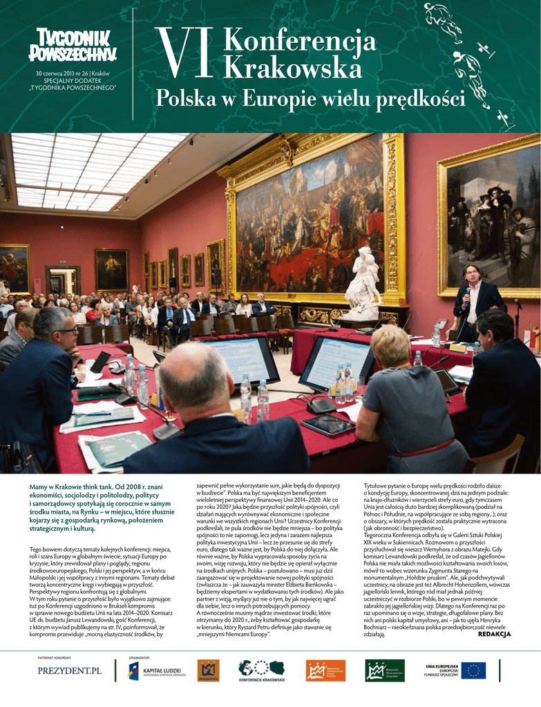 30 czerwca 2013 nr 26 | Kraków SPECJALNY Dodatek „Tygodnika Powszechnego” VI onferencja K Krakowska Polska w Europie wielu prędkości Mamy w Krakowie think tank. Od 2008 r. znani ekonomiści, socjolodzy i politolodzy, politycy i samorządowcy spotykają się corocznie w samym środku miasta, na Rynku – w miejscu, które słusznie kojarzy się z gospodarką rynkową, położeniem strategicznym i kulturą. Tego bowiem dotyczą tematy kolejnych konferencji: miejsca, roli i szans Europy w globalnym świecie; sytuacji Europy po kryzysie, który zrewidował plany i poglądy; regionu środkowoeuropejskiego, Polski i jej perspektyw, a w końcu Małopolski i jej współpracy z innymi regionami. Tematy debat tworzą koncentryczne kręgi i wybiegają w przyszłość. Perspektywy regionu konfrontują się z globalnymi. W tym roku pytanie o przyszłość było wyjątkowo zajmujące: tuż po Konferencji uzgodniono w Brukseli kompromis w sprawie nowego budżetu Unii na lata 2014–2020. Komisarz UE ds. budżetu Janusz Lewandowski, gość Konferencji, z którym wywiad publikujemy na str. IV, poinformował, że kompromis przewiduje „mocną elastyczność środków, by zapewnić pełne wykorzystanie sum, jakie będą do dyspozycji w budżecie”. Polska ma być największym beneficjentem wieloletniej perspektywy finansowej Unii 2014–2020. Ale co po roku 2020? Jaka będzie przyszłość polityki spójności, czyli działań mających wyrównywać ekonomiczne i społeczne warunki we wszystkich regionach Unii? Uczestnicy Konferencji podkreślali, że pula środków nie będzie mniejsza – bo polityka spójności to nie zapomogi, lecz jedyna i zarazem najlepsza polityka inwestycyjna Unii – lecz że przesunie się do strefy euro, dlatego tak ważne jest, by Polska do niej dołączyła. Ale równie ważne, by Polska wypracowała sposoby życia na swoim, wizję rozwoju, który nie będzie się opierał wyłącznie na środkach unijnych. Polska – postulowano – musi już dziś zaangażować się w projektowanie nowej polityki spójności (zwłaszcza że – jak zauważyła minister Elżbieta Bieńkowska – będziemy ekspertami w wydatkowaniu tych środków). Ale jako partner z wizją, myślący już nie o tym, by jak najwięcej ugrać dla siebie, lecz o innych potrzebujących pomocy. A równocześnie musimy mądrze inwestować środki, które otrzymamy do 2020 r., żeby kształtować gospodarkę w kierunku, który Ryszard Petru definiuje jako stawanie się „mniejszymi Niemcami Europy”. Tytułowe pytanie o Europę wielu prędkości rodziło dalsze: o kondycję Europy, skoncentrowanej dziś na jednym podziale: na kraje-dłużników i wierzycieli strefy euro, gdy tymczasem Unia jest całością dużo bardziej skomplikowaną (podział na Północ i Południe, na współpracujące ze sobą regiony...); oraz o obszary, w których prędkość została praktycznie wytracona ( jak obronność i bezpieczeństwo). Tegoroczna Konferencja odbyła się w Galerii Sztuki Polskiej XIX wieku w Sukiennicach. Rozmowom o przyszłości przysłuchiwał się wieszcz Wernyhora z obrazu Matejki. Gdy komisarz Lewandowski podkreślał, że od czasów Jagiellonów Polska nie miała takich możliwości kształtowania swoich losów, mówił to wobec wizerunku Zygmunta Starego na monumentalnym „Hołdzie pruskim”. Ale, jak podchwytywali uczestnicy, na obrazie jest też Albrecht Hohenzollern, wówczas jagielloński lennik, którego ród miał jednak później uczestniczyć w rozbiorze Polski, bo w pewnym momencie zabrakło jej jagiellońskiej wizji. Dlatego na Konferencji raz po raz upominano się o wizje, strategie, długofalowe plany. Bez nich ani polski kapitał umysłowy, ani – jak to ujęła Henryka Bochniarz – nieokiełznana polska przedsiębiorczość niewiele REDAKCJA zdziałają. II VI konferencja krakowska 36 TYGODNIK POWSZECHNY 26 | 30 czerwca 2013 marek sowa marszałek województwa małopolskiego Jednym z ważnych tematów spotkania w Krakowie była wspólna europejska waluta. W obliczu kłopotów, z jakimi boryka się część krajów strefy euro, potrzebna jest nam rzetelna debata na temat korzyści, ale i zagrożeń, jakie niesie przynależność do tego grona. Dzięki temu unikniemy błędów popełnionych już przez innych. Istotnym wątkiem dyskusji była również próba wskazania dróg rozwoju Polski i regionów europejskich po 2020 r., kiedy to zmniejszy się strumień unijnych funduszy. Środki europejskie, jak zauważył jeden z naszych panelistów, mogą być swoistym narkotykiem. Umożliwiają w krótkiej perspektywie znaczące zwiększanie inwestycji, ale mogą też utrudniać rozwój w oparciu o własny potencjał. Choć to odległa perspektywa, moim zdaniem już teraz powinniśmy opracować scenariusze budowania konkurencyjnej pozycji regionu własnymi siłami. h OLGIERD DZIEKOŃSKI sekretarz stanu w kancelarii prezydenta rp Mamy przedsiębiorczość w genach. Aż 83 proc. Polaków deklaruje pozytywne nastawienie do przedsiębiorczości. Tego kapitału nie wolno nam zmarnować. Potrzebujemy wolności w gospodarce, współpracy, otwartości i dialogu oraz sprawnych instytucji państwowych. Jeśli nie podejmiemy dzisiaj reform strukturalnych, odsuniemy rozwiązanie problemów w przyszłość, a wtedy koszty społeczne wprowadzanych zmian mogą się okazać bardzo wysokie. Obywatelskim obowiązkiem każdego z nas jest budowanie wokół siebie klimatu zaufania. Buduje on poczucie stabilności, wiary we własne siły i w sens współpracy. A tego właśnie potrzebujemy do zbudowania w naszym kraju globalnych firm, które mogą się w przyszłości stać jednym z motorów rozwoju Polski. h VI konferencja krakowska III TYGODNIK POWSZECHNY 26 | 30 czerwca 2013 Co cię czeka, Europo Na naukowców, polityków i ekspertów spoglądali Zygmunt Stary i Wernyhora. Bo krakowskie debaty o przyszłości Europy, Polski i jej regionów toczyły się w tym roku w galerii w Sukiennicach. Anna Goc Natalia Srom