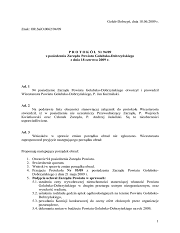 PROTOKÓŁ Nr 94/09 z posiedzenia Zarządu Powiatu Golubsko