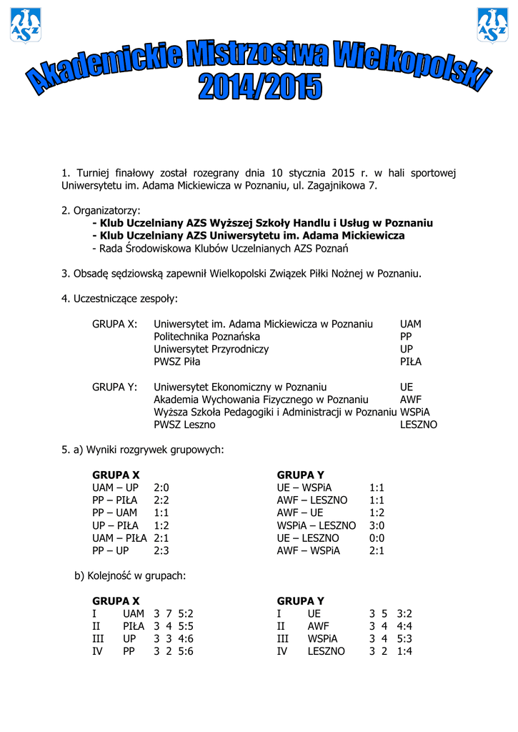 1. Turniej finałowy został rozegrany dnia 10 stycznia 2015 r. w hali sportowej Uniwersytetu im. Adama Mickiewicza w Poznaniu, ul. Zagajnikowa 7. 2. Organizatorzy: - Klub Uczelniany AZS Wyższej Szkoły Handlu i Usług w Poznaniu - Klub Uczelniany AZS Uniwersytetu im. Adama Mickiewicza - Rada Środowiskowa Klubów Uczelnianych AZS Poznań 3. Obsadę sędziowską zapewnił Wielkopolski Związek Piłki Nożnej w Poznaniu. 4. Uczestniczące zespoły: GRUPA X: Uniwersytet im. Adama Mickiewicza w Poznaniu Politechnika Poznańska Uniwersytet Przyrodniczy PWSZ Piła UAM PP UP PIŁA GRUPA Y: Uniwersytet Ekonomiczny w Poznaniu Akademia Wychowania Fizycznego w Poznaniu Wyższa Szkoła Pedagogiki i Administracji w Poznaniu PWSZ Leszno UE AWF WSPiA LESZNO 5. a) Wyniki rozgrywek grupowych: GRUPA X UAM – UP PP – PIŁA PP – UAM UP – PIŁA UAM – PIŁA PP – UP 2:0 2:2 1:1 1:2 2:1 2:3 GRUPA Y UE – WSPiA AWF – LESZNO AWF – UE WSPiA – LESZNO UE – LESZNO AWF – WSPiA 1:1 1:1 1:2 3:0 0:0 2:1 GRUPA Y I UE II AWF III WSPiA IV LESZNO 3 3 3 3 b) Kolejność w grupach: GRUPA X I UAM II PIŁA III UP IV PP 3 3 3 3 7 4 3 2 5:2 5:5 4:6 5:6 5 4 4 2 3:2 4:4 5:3 1:4 6. Mecze o miejsca: o VII miejsce: o I miejsce: PP – LESZNO UAM – UE 3:1 2:0 7. Kolejność miejsc III – VI ustalono w oparciu o porównanie liczby punktów, uzyskanych w grupach eliminacyjnych przez zespoły, które wywalczyły w nich odpowiednio II i III miejsca; III PIŁA [4 pkt. w grupie; lepszy stos. bramek od AWF] IV AWF [4 pkt. w grupie; gorszy stos. bramek od PIŁY] V WSPiA [4 pkt. w grupie] VI UP Poznań [3 pkt. w grupie] 8. Wyróżnienia indywidualne dla zawodników: „Król strzelców”: Jakub Mikulasczyk Najlepszy bramkarz: Maciej Foltyn Najlepszy zawodnik: Bartosz Burzyński PP (6 bramek) UAM UE 9. Kolejność końcowa (miejsca I – VIII; turniej finałowy) Akademickich Mistrzostw Wielkopolski w futsalu 2014/2015: I UAM Poznań II UE Poznań III PWSZ Piła IV AWF Poznań V WSPiA Poznań VI UP Poznań VII PP Poznań VIII PWSZ Leszno IX GWSHM Gniezno X PWSZ Konin WSB WSEiT XIII PWSZ Kalisz WSL WSNHiD XVI UM 10. Fundator nagród: Dom Wydawniczy REBIS