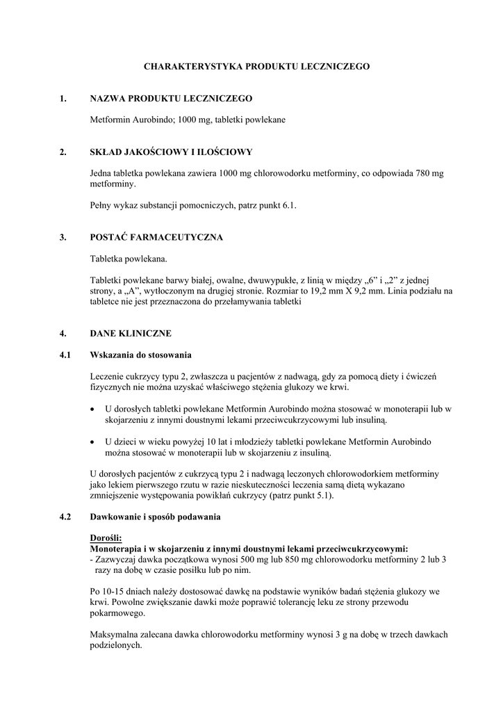 CHARAKTERYSTYKA PRODUKTU LECZNICZEGO 1. NAZWA PRODUKTU LECZNICZEGO Metformin Aurobindo; 1000 mg, tabletki powlekane 2. SKŁAD JAKOŚCIOWY I ILOŚCIOWY Jedna tabletka powlekana zawiera 1000 mg chlorowodorku metforminy, co odpowiada 780 mg metforminy. Pełny wykaz substancji pomocniczych, patrz punkt 6.1. 3. POSTAĆ FARMACEUTYCZNA Tabletka powlekana. Tabletki powlekane barwy białej, owalne, dwuwypukłe, z linią w między „6” i „2” z jednej strony, a „A”, wytłoczonym na drugiej stronie. Rozmiar to 19,2 mm X 9,2 mm. Linia podziału na tabletce nie jest przeznaczona do przełamywania tabletki 4. DANE KLINICZNE 4.1 Wskazania do stosowania Leczenie cukrzycy typu 2, zwłaszcza u pacjentów z nadwagą, gdy za pomocą diety i ćwiczeń fizycznych nie można uzyskać właściwego stężenia glukozy we krwi. • U dorosłych tabletki powlekane Metformin Aurobindo można stosować w monoterapii lub w skojarzeniu z innymi doustnymi lekami przeciwcukrzycowymi lub insuliną. • U dzieci w wieku powyżej 10 lat i młodzieży tabletki powlekane Metformin Aurobindo można stosować w monoterapii lub w skojarzeniu z insuliną. U dorosłych pacjentów z cukrzycą typu 2 i nadwagą leczonych chlorowodorkiem metforminy jako lekiem pierwszego rzutu w razie nieskuteczności leczenia samą dietą wykazano zmniejszenie występowania powikłań cukrzycy (patrz punkt 5.1). 4.2 Dawkowanie i sposób podawania Dorośli: Monoterapia i w skojarzeniu z innymi doustnymi lekami przeciwcukrzycowymi: - Zazwyczaj dawka początkowa wynosi 500 mg lub 850 mg chlorowodorku metforminy 2 lub 3 razy na dobę w czasie posiłku lub po nim. Po 10-15 dniach należy dostosować dawkę na podstawie wyników badań stężenia glukozy we krwi. Powolne zwiększanie dawki może poprawić tolerancję leku ze strony przewodu pokarmowego. Maksymalna zalecana dawka chlorowodorku metforminy wynosi 3 g na dobę w trzech dawkach podzielonych. W przypadku zamiaru zamiany innego doustnego leku przeciwcukrzycowego na chlorowodorek metforminy, należy odstawić poprzednio stosowany lek i zastosować chlorowodorek metforminy w wyżej podanych dawkach. Skojarzenie z insuliną: Chlorowodorek metforminy i insulina mogą być stosowane w skojarzeniu w celu uzyskania lepszej kontroli stężenia glukozy we krwi. Chlorowodorek metforminy stosuje się zwykle w dawce początkowej 500 mg lub 850 mg chlorowodorku metforminy 2 lub 3 razy na dobę natomiast dawkę insuliny dostosowuje się na podstawie wyników badania stężenia glukozy we krwi. Osoby w wieku podeszłym: Z uwagi na ryzyko obniżenia czynności nerek u pacjentów w podeszłym wieku dawkę chlorowodorku metforminy należy ustalić na podstawie czynności nerek. Konieczna jest regularna kontrola czynności nerek (patrz punkt 4.4). Dzieci i młodzież: Monoterapia i leczenie skojarzone z insuliną • • Tabletki powlekane Metformin Aurobindo można stosować u dzieci w wieku powyżej 10 lat i młodzieży. Zazwyczaj dawka początkowa wynosi 500 mg lub 850 mg chlorowodorku metforminy raz na dobę w czasie posiłku lub po nim. Po 10-15 dniach należy dostosować dawkę na podstawie wyników badań stężenia glukozy we krwi. Powolne zwiększanie dawki może poprawić tolerancję leku ze strony przewodu pokarmowego. Maksymalna zalecana dawka chlorowodorku metforminy wynosi 2 g na dobę w 2 lub 3 dawkach podzielonych. 4.3 Przeciwwskazania • • • • • • 4.4 Nadwrażliwość na chlorowodorek metforminy lub którykolwiek inny składnik preparatu. Cukrzycowa kwasica ketonowa, stan przedśpiączkowy w cukrzycy. Niewydolność nerek lub zaburzenia czynności nerek (klirens kreatyniny <60 ml/min). Ostre choroby, które mogą powodować zaburzenia czynności nerek: odwodnienie, ciężkie zakażenie, wstrząs, Ostre lub przewlekłe choroby, które mogą być przyczyną niedotlenienia tkanek: niewydolność serca lub oddechowa, niedawno przebyty zawał mięśnia sercowego, wstrząs. Niewydolność wątroby, ostre zatrucie alkoholem, alkoholizm. Specjalne ostrzeżenia i środki ostrożności dotyczące stosowania Kwasica mleczanowa: Kwasica mleczanowa stanowi rzadko występujące, ale groźne (z wysoką śmiertelnością w razie braku natychmiastowego leczenia) powikłanie metaboliczne, które może powstać w wyniku kumulacji chlorowodorku metforminy. Zgłoszone przypadki kwasicy mleczanowej u pacjentów leczonych chlorowodorkiem metforminy występowały przede wszystkim u pacjentów chorych na cukrzycę ze znaczną niewydolnością nerek. Ryzyko kwasicy mleczanowej można i należy zmniejszać poprzez ocenę również innych powiązanych czynników ryzyka, takich jak: źle kontrolowana cukrzyca, ketoza, długotrwałe głodzenie, nadużywanie alkoholu, niewydolność wątroby i inne stany związane z niedotlenieniem. Rozpoznanie: Ryzyko kwasicy mleczanowej należy uwzględnić w przypadku wystąpienia oznak niespecyficznych, takich jak skurcze mięśni z zaburzeniami przewodu pokarmowego, na przykład bólem brzucha i ciężkim osłabieniem. Następstwem może być duszność z kwasiczym oddechem, ból brzucha, hipotermia i śpiączka. W badaniach laboratoryjnych stwierdza się zmniejszenie pH krwi, zwiększenie stężenia mleczanów w osoczu powyżej 5 mmol/1, zwiększenie luki anionowej oraz zwiększenie stosunku stężenia mleczanów do pirogronianów we krwi. W przypadku podejrzenia kwasicy metabolicznej chlorowodorek metforminy należy odstawić, a pacjenta niezwłocznie umieścić w szpitalu (patrz punkt 4.9). Czynność nerek: Ponieważ chlorowodorek metforminy jest wydalany przez nerki, przed rozpoczęciem leczenia oraz regularnie w czasie leczenia należy oznaczać klirens kreatyniny (można go obliczyć na podstawie stężeń kreatyniny w surowicy za pomocą wzoru Cockcrofta-Gaulta):: * u pacjentów z prawidłową czynnością nerek przynajmniej raz w roku, * u pacjentów z klirensem kreatyniny na dolnej granicy normy oraz u osób w podeszłym wieku przynajmniej 2 do 4 razy w roku.