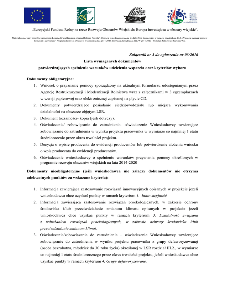„Europejski Fundusz Rolny na rzecz Rozwoju Obszarów Wiejskich: Europa inwestująca w obszary wiejskie”. Materiał opracowany przez Stowarzyszenie Lokalna Grupa Działania „Kraina Dolnego Powiśla”. Operacja współfinansowana ze środków Unii Europejskiej w ramach poddziałania 19.4 „Wsparcie na rzecz kosztów bieżących i aktywizacji” Programu Rozwoju Obszarów Wiejskich na lata 2014-2020. Instytucja Zarządzająca PROW 2014-2020 – Minister Rolnictwa i Rozwoju Wsi. Załącznik nr 3 do ogłoszenia nr 03/2016 Lista wymaganych dokumentów potwierdzających spełnienie warunków udzielenia wsparcia oraz kryteriów wyboru Dokumenty obligatoryjne: 1. Wniosek o przyznanie pomocy sporządzony na aktualnym formularzu udostępnianym przez Agencję Restrukturyzacji i Modernizacji Rolnictwa wraz z załącznikami w 3 egzemplarzach w wersji papierowej oraz elektronicznej zapisanej na płycie CD. 2. Dokumenty potwierdzające posiadanie siedziby/oddziału lub miejsca wykonywania działalności na obszarze objętym LSR. 3. Dokument tożsamości- kopia (jeśli dotyczy). 4. Oświadczenie/ zobowiązanie do zatrudnienia- oświadczenie Wnioskodawcy zawierające zobowiązanie do zatrudnienia w wyniku projektu pracownika w wymiarze co najmniej 1 etatu średniorocznie przez okres trwałości projektu. 5. Decyzja o wpisie producenta do ewidencji producentów lub potwierdzenie złożenia wniosku o wpis producenta do ewidencji producentów. 6. Oświadczenie wnioskodawcy o spełnieniu warunków przyznania pomocy określonych w programie rozwoju obszarów wiejskich na lata 2014-2020 Dokumenty nieobligatoryjne (jeśli wnioskodawca nie załączy dokumentów nie otrzyma adekwatnych punktów za wskazane kryteria): 1. Informacja zawierająca zastosowanie rozwiązań innowacyjnych opisanych w projekcie jeżeli wnioskodawca chce uzyskać punkty w ramach kryterium 1. Innowacyjność. 2. Informacja zawierająca zastosowanie rozwiązań proekologicznych, w zakresie ochrony środowiska i/lub przeciwdziałanie zmianom klimatu opisanych w projekcie jeżeli wnioskodawca chce uzyskać punkty w ramach kryterium 3. Działalność związana z wdrażaniem rozwiązań proekologicznych, w zakresie ochrony środowiska i/lub przeciwdziałanie zmianom klimat. 3. Oświadczenie/zobowiązanie do zatrudnienia – oświadczenie Wnioskodawcy zawierające zobowiązanie do zatrudnienia w wyniku projektu pracownika z grupy defaworyzowanej (osoba bezrobotna, młodzież do 30 roku życia) określonej w LSR rozdział III.2., w wymiarze co najmniej 1 etatu średniorocznego przez okres trwałości projektu, jeżeli wnioskodawca chce uzyskać punkty w ramach kryterium 4. Grupy defaworyzowane. „Europejski Fundusz Rolny na rzecz Rozwoju Obszarów Wiejskich: Europa inwestująca w obszary wiejskie”. Materiał opracowany przez Stowarzyszenie Lokalna Grupa Działania „Kraina Dolnego Powiśla”. Operacja współfinansowana ze środków Unii Europejskiej w ramach poddziałania 19.4 „Wsparcie na rzecz kosztów bieżących i aktywizacji” Programu Rozwoju Obszarów Wiejskich na lata 2014-2020. Instytucja Zarządzająca PROW 2014-2020 – Minister Rolnictwa i Rozwoju Wsi. 4. Dokument potwierdzający udział w szkoleniu dotyczącym zakładania i prowadzenia działalności gospodarczej jeżeli wnioskodawca chce uzyskać punkty w ramach kryterium 6. Udokumentowanie udziału w szkoleniu dotyczącym zakładania i prowadzenia działalności gospodarczej.