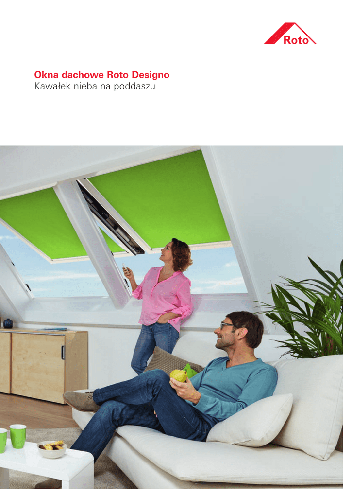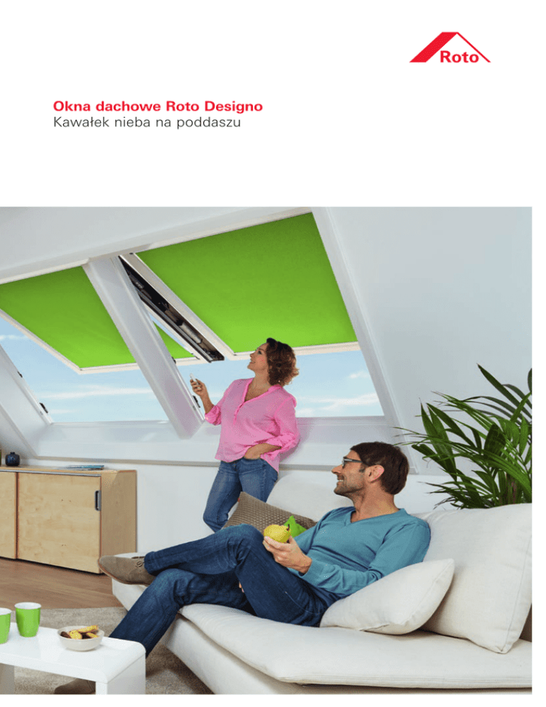 Okna dachowe Roto Designo Kawałek nieba na poddaszu Nadszedł czas, aby na nowo zdefiniować komfort mieszkania na poddaszu. Okno RotoComfort i8 jest pierwszym w pełni automatycznym oknem uchylno-wysokoosiowym, w którym napęd okna został całkowicie zintegrowany z jego konstrukcją, pozostając niewidocznym dla użytkownika poddasza. innowacja – pierwsze w pełni automatyczne okno uchylno– –wysokoosiowe inteligencja – otwieranie za pomocą przełącznika, pilota, sterowania czasowego lub smartfona/tabletu (poprzez centralę BeckerBox cc31) image – nowoczesny kształt i kolor antracyt metallic idealnie komponują się z każdym kolorem pokrycia dachowego 2 Roto Designo Imponujące rozmiary 1140 1340 1400 7/14 9/14 11/14 13/14 1600 Wysokość 940 7/16 9/16 11/16 13/16 1800 Szerokość 740 7/18 9/18 11/18 Okno RotoComfort i8 najwyższa klasa bezpieczeństwa dzięki automatycznym ryglom okna 45º kąt otwarcia okna w pozycji uchylnej wyposażone w czujnik deszczu możliwość regulacji szybkości otwierania niewidoczny układ napędowy bardzo cicho pracujący napęd okna, sprawdzający się idealnie do wietrzenia pomieszczenia nocą podczas snu w pełni kompatybilny z systemem RotoMatic oraz z systemem KNX – światowy standard zarządzania i kontroli urządzeń i budynków Roto Designo 3 Możliwości jakie dają okna Roto Designo*: najwyższa klasa bezpieczeństwa – 4 punkty ryglowania, podwyższona odporność na włamania energooszczędność – fabrycznie montowany termo–blok WD gwarantujący o 15% lepszą termoizolację wielofunkcyjne szklenie: szyba hartowana odporna na gradobicie szyba z powłoką samoczyszczącą Aquaclear szyba laminowana od wewnątrz blueLine Plus szyba dźwiękoszczelna acusticLine szyba niskoemisyjna blueTec Plus 2 sposoby obsługi okna: manualne – wielofunkcyjna klamka u dołu okna zdalnie – otwieranie za pomocą przełącznika, pilota, sterowania czasowego lub smartfona/tabletu (za pomocą centrali BeckerBox cc31) nowoczesny wygląd – ergonomiczny kształt, oblachowanie w kolorze antracyt metallic, które idalnie komponuje się z połacią dachową efektywne doświetlenie i wentylacja poddasza innowacyjny system regulacji skrzydła w dachu * Wymienione opcje dostępne w wybranych modelach. Szczegóły w cenniku lub na www.roto.pl 4 Roto Designo Okna dachowe Roto Designo Designo R8 - okno uchylno-wysokoosiowe Dzięki zastosowaniu okuć światowego lidera okno Designo R8 posiada 2 systemy otwierania sterowane jedną klamką. Pozycja uchylna skrzydła to bezpieczny dostęp do otwartego okna. Pozycja wysokoosiowa w ¾ wysokości okna to efektywne wietrzenie i możliwość wyglądania przez otwarte okno w pozycji wyprostowanej. Okna dachowe Roto Designo Kawałek nieba na poddaszu Klimat poddasza użytkowego zależy w dużym stopniu od okien dachowych. Już na etapie jego planowania należy uwzględnić takie aspekty jak: rozmiar okna, izolacja, ochrona przeciwsłoneczna, sposób obsługi. Roto jest w stanie spełnić wszystkie oczekiwania. Linia okien dachowych Designo otwiera nieograniczone możliwości aranżacji pomieszczeń, stwarza namiastkę własnego nieba na poddaszu, dba o bezpieczeństwo użytkowników oraz dzięki przemyślanym energooszczędnym rozwiązaniom o ich domowy budżet. Designo R7 - okno wysokoosiowe Oś obrotu okna Designo R7 znajduje się w ¾ jego wysokości, dzięki czemu otwarte skrzydło nie wchodzi do pomieszczenia, zapewniając w ten sposób swobodny i wygodny dostęp do otwartego okna w pozycji wyprostowanej. Designo R4/R6 - okna obrotowe Designo R4/R6 to okno dachowe z osią obrotu w połowie wysokości, dostępne również w wersji zdalnie sterowanej RotoTronic obsługiwanej za pomocą przełącznika w ścianie lub pilota. Ten model Designo to możliwość spełnienia każdej wizji poddasza, szczególnie, kiedy okna dachowe montowane są w miejscach trudno dostępnych. Roto Designo 5 Szklenie Roto blueLine Okna dachowe Roto Designo to perspektywa pełna światła, oszczędności energii oraz szczelności połączenia. Wysokiej jakości szklenie Roto blueLine gwarantuje niskie zużycie energii i zdrowy klimat na poddaszu. W szczególnych przypadkach warto zastosować szyby dźwiękoszczelne, które zapewnią ciszę i spokój w każdym otoczeniu. Dodatkowo o energooszczędność zadba fabrycznie zamontowany termo-blok WD. Designo R8, wartość UW =1,2 W/m²K Optymalny klimat na poddaszu i najlepszą izolację termiczną zapewniają: 1 1 szyba Roto blueLine: 2-szybowy pakiet energooszczędny 2 fabrycznie zamontowana folia paroizolacyjna 2 3 dwuczęściowy, fabrycznie zamontowany termo-blok WD 3 Szklenie Roto blueLine Roto blueLine 2-szybowy pakiet energooszczędny, zewnętrzna szyba hartowana, Ug=1,0 W/m2K Roto blueLine Plus 2-szybowy pakiet energooszczędny, zewnętrzna szyba hartowana, wewnętrzna szyba bezpieczna klejona, powłoka Aquaclear oraz izolacja akustyczna (3 klasa dźwiękoszczelności), Ug=1,0 W/m2K 6 Roto Designo Designo R8 Szklenie Roto blueTec Okna dachowe Roto Designo R8, R6 i RotoComfort i8, to okna idealnie dopasowane do domów energooszczędnych i pasywnych, dzięki zastosowaniu innowacyjnego szklenia Roto blueTec. Nowy trzyszybowy pakiet niskoemisyjny wraz z fabrycznie zamontowanym termo-blokiem WD zapewnia bezpieczeństwo oraz jeszcze lepsze parametry izolacyjne całego okna. Designo R89P PVC/R69P PVC, wartość Uw=0,80 W/m2K 1 Optymalny klimat na poddaszu, minimalne zużycie energii i najlepszą izolację termiczną zapewniają: 1 szyba Roto blueTec Plus: 3-szybowy pakiet niskoemisyjny, zewnętrzna i środkowa szyba hartowana, wewnętrzna szyba bezpieczna klejona, powłoka samoczyszcząca Aquaclear 2 2 fabrycznie zamontowana folia paroizolacyjna 3 dwuczęściowy, fabrycznie zamontowany termo-blok WD 3 Okna dachowe Roto Designo - idealnie dopasowany element do domów pasywnych i energooszczędnych ++ Standard NF 40 Współczynnik Uw 1,0 W/m2K + + +NF 15 Standard Współczynnik Uw 0,80* W