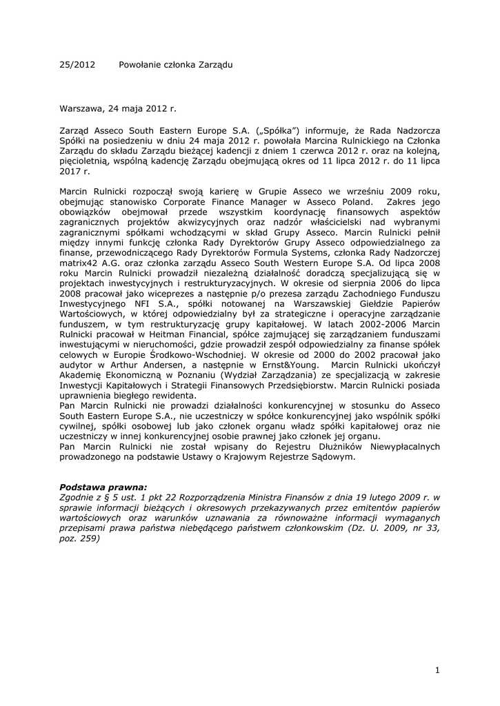 25/2012 Powołanie członka Zarządu Warszawa, 24 maja 2012 r. Zarząd Asseco South Eastern Europe S.A. („Spółka”) informuje, że Rada Nadzorcza Spółki na posiedzeniu w dniu 24 maja 2012 r. powołała Marcina Rulnickiego na Członka Zarządu do składu Zarządu bieżącej kadencji z dniem 1 czerwca 2012 r. oraz na kolejną, pięcioletnią, wspólną kadencję Zarządu obejmującą okres od 11 lipca 2012 r. do 11 lipca 2017 r. Marcin Rulnicki rozpoczął swoją karierę w Grupie Asseco we wrześniu 2009 roku, obejmując stanowisko Corporate Finance Manager w Asseco Poland. Zakres jego obowiązków obejmował przede wszystkim koordynację finansowych aspektów zagranicznych projektów akwizycyjnych oraz nadzór właścicielski nad wybranymi zagranicznymi spółkami wchodzącymi w skład Grupy Asseco. Marcin Rulnicki pełnił między innymi funkcję członka Rady Dyrektorów Grupy Asseco odpowiedzialnego za finanse, przewodniczącego Rady Dyrektorów Formula Systems, członka Rady Nadzorczej matrix42 A.G. oraz członka zarządu Asseco South Western Europe S.A. Od lipca 2008 roku Marcin Rulnicki prowadził niezależną działalność doradczą specjalizującą się w projektach inwestycyjnych i restrukturyzacyjnych. W okresie od sierpnia 2006 do lipca 2008 pracował jako wiceprezes a następnie p/o prezesa zarządu Zachodniego Funduszu Inwestycyjnego NFI S.A., spółki notowanej na Warszawskiej Giełdzie Papierów Wartościowych, w której odpowiedzialny był za strategiczne i operacyjne zarządzanie funduszem, w tym restrukturyzację grupy kapitałowej. W latach 2002-2006 Marcin Rulnicki pracował w Heitman Financial, spółce zajmującej się zarządzaniem funduszami inwestującymi w nieruchomości, gdzie prowadził zespół odpowiedzialny za finanse spółek celowych w Europie Środkowo-Wschodniej. W okresie od 2000 do 2002 pracował jako audytor w Arthur Andersen, a następnie w Ernst&Young. Marcin Rulnicki ukończył Akademię Ekonomiczną w Poznaniu (Wydział Zarządzania) ze specjalizacją w zakresie Inwestycji Kapitałowych i Strategii Finansowych Przedsiębiorstw. Marcin Rulnicki posiada uprawnienia biegłego rewidenta. Pan Marcin Rulnicki nie prowadzi działalności konkurencyjnej w stosunku do Asseco South Eastern Europe S.A., nie uczestniczy w spółce konkurencyjnej jako wspólnik spółki cywilnej, spółki osobowej lub jako członek organu władz spółki kapitałowej oraz nie uczestniczy w innej konkurencyjnej osobie prawnej jako członek jej organu. Pan Marcin Rulnicki nie został wpisany do Rejestru Dłużników Niewypłacalnych prowadzonego na podstawie Ustawy o Krajowym Rejestrze Sądowym. Podstawa prawna: Zgodnie z § 5 ust. 1 pkt 22 Rozporządzenia Ministra Finansów z dnia 19 lutego 2009 r. w sprawie informacji bieżących i okresowych przekazywanych przez emitentów papierów wartościowych oraz warunków uznawania za równoważne informacji wymaganych przepisami prawa państwa niebędącego państwem członkowskim (Dz. U. 2009, nr 33, poz. 259) 1