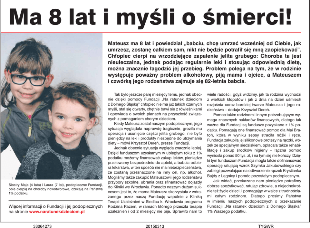Ma 8 lat i myśli o śmierci! Mateusz ma 8 lat i powiedział „babciu, chcę umrzeć wcześniej od Ciebie, jak umrzesz, zostanę całkiem sam, nikt nie będzie potrafił się mną zaopiekować”. Chłopiec cierpi na wrzodziejące zapalenie jelita grubego: Choroba ta jest nieuleczalna, jednak podając regularnie leki i stosując odpowiednią dietę, można znacznie łagodzić jej przebieg. Problem polega na tym, że w rodzinie występuje poważny problem alkoholowy, piją mama i ojciec, a Mateuszem i czwórką jego rodzeństwa zajmuje się 82-letnia babcia. Siostry Maja (4 lata) i Laura (7 lat), podopieczne Fundacji, obie cierpią na choroby nowotworowe, czekają na Państwa 1% podatku. Więcej informacji o Fundacji i jej podopiecznych na stronie www.naratunekdzieciom.pl 33064273 Tak było jeszcze parę miesięcy temu, jednak obecnie dzięki pomocy Fundacji „Na ratunek dzieciom z Dolnego Śląską” chłopiec nie ma już takich czarnych myśli, stał się otwarty, chętnie bawi się z rówieśnikami i opowiada o swoich planach na przyszłość związanych z pomaganiem chorym dzieciom. Kiedy Mateusz został naszym podopiecznym, jego sytuacja wyglądała naprawdę tragicznie, groziła mu operacja i usunięcie części jelita grubego, nie było pieniędzy na leki i produkty niezbędne do utrzymania diety – mówi Krzysztof Dereń, prezes Fundacji. Jednak obecnie sytuacja wygląda znacznie lepiej. Dzięki funduszom uzyskanym w ubiegłym roku z 1% podatku możemy finansować zakup leków, pieniądze przelewamy bezpośrednio do apteki, a babcia odbiera lekarstwa, w ten sposób nie ma niebezpieczeństwa, że zostaną przeznaczone na inny cel, np. alkohol. Mogliśmy także zakupić Mateuszowi i jego rodzeństwu przybory szkolne, ubrania oraz sfinansować dojazdy do Kliniki we Wrocławiu. Ponadto naszym dużym sukcesem jest to, że mama Mateusza skorzystała z wdrażanego przez naszą Fundację wspólnie z Kliniką Terapii Uzależnień w Siedlcu k. Wrocławia programu Rodzina Razem, w ramach którego przeszła terapię uzależnień i od 2 miesięcy nie pije. Sprawiło nam to 20150313 wiele radości, gdyż widzimy, jak ta rodzina wychodzi z wielkich kłopotów i jak z dnia na dzień uśmiech rozjaśnia coraz bardziej twarze Mateusza i jego rodzeństwa – dodaje Krzysztof Dereń. Pomoc takim rodzinom i innym potrzebującym wymaga znacznych nakładów finansowych, dlatego tak ważne dla Fundacji są fundusze pozyskane z 1% podatku. Pomagają one finansować pomoc dla Mai Bratoń, która w wyniku sepsy straciła nóżki i ręce. Fundacja zakupiła jej silikonowe protezy na rączki, wózek ze specjalnym siedziskiem, opłacała także rehabilitację i zakup środków higieny – łączna pomoc wyniosła ponad 50 tys. zł, i na tym się nie kończy. Dzięki tym funduszom Fundacja mogła także dofinansować operację ratującą wzrok Szymka Jakubowskiego czy zabiegi pozwalające na odtworzenie rączek Krystianka Bajdy z Legnicy i pomóc pozostałym podopiecznym. Jak widać, przekazane nam pieniądze potrafimy dobrze spożytkować, ratując zdrowie, a niejednokrotnie też życie dzieci, i pomagając w walce z trudnościami całym rodzinom. Dlatego prosimy Państwa w imieniu naszych podopiecznych o przekazanie Fundacji „Na ratunek dzieciom z Dolnego Śląska” 1% Waszego podatku. TYGWR