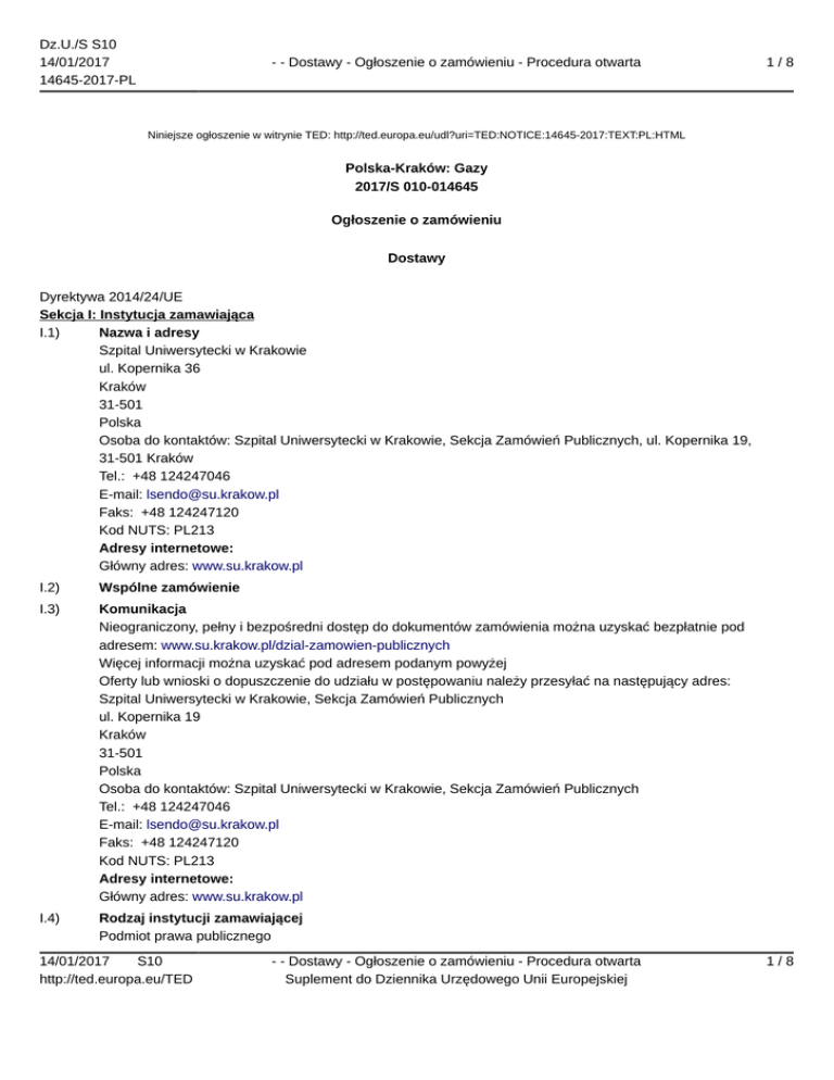 Dz.U./S S10 14/01/2017 14645-2017-PL - - Dostawy - Ogłoszenie o zamówieniu - Procedura otwarta 1/8 Niniejsze ogłoszenie w witrynie TED: http://ted.europa.eu/udl?uri=TED:NOTICE:14645-2017:TEXT:PL:HTML Polska-Kraków: Gazy 2017/S 010-014645 Ogłoszenie o zamówieniu Dostawy Dyrektywa 2014/24/UE Sekcja I: Instytucja zamawiająca I.1) Nazwa i adresy Szpital Uniwersytecki w Krakowie ul. Kopernika 36 Kraków 31-501 Polska Osoba do kontaktów: Szpital Uniwersytecki w Krakowie, Sekcja Zamówień Publicznych, ul. Kopernika 19, 31-501 Kraków Tel.: +48 124247046 E-mail: [email protected] Faks: +48 124247120 Kod NUTS: PL213 Adresy internetowe: Główny adres: www.su.krakow.pl I.2) Wspólne zamówienie I.3) Komunikacja Nieograniczony, pełny i bezpośredni dostęp do dokumentów zamówienia można uzyskać bezpłatnie pod adresem: www.su.krakow.pl/dzial-zamowien-publicznych Więcej informacji można uzyskać pod adresem podanym powyżej Oferty lub wnioski o dopuszczenie do udziału w postępowaniu należy przesyłać na następujący adres: Szpital Uniwersytecki w Krakowie, Sekcja Zamówień Publicznych ul. Kopernika 19 Kraków 31-501 Polska Osoba do kontaktów: Szpital Uniwersytecki w Krakowie, Sekcja Zamówień Publicznych Tel.: +48 124247046 E-mail: [email protected] Faks: +48 124247120 Kod NUTS: PL213 Adresy internetowe: Główny adres: www.su.krakow.pl I.4) Rodzaj instytucji zamawiającej Podmiot prawa publicznego 14/01/2017 S10 http://ted.europa.eu/TED - - Dostawy - Ogłoszenie o zamówieniu - Procedura otwarta Suplement do Dziennika Urzędowego Unii Europejskiej 1/8 Dz.U./S S10 14/01/2017 14645-2017-PL I.5) - - Dostawy - Ogłoszenie o zamówieniu - Procedura otwarta 2/8 Główny przedmiot działalności Zdrowie Sekcja II: Przedmiot II.1) Wielkość lub zakres zamówienia II.1.1) Nazwa: Dostawa gazów medycznych i technicznych oraz dzierżawa zbiorników na ciekły tlen medyczny i zbiornika na azot ciekły (DFZP-LS-271-1/2017). Numer referencyjny: DFZP-LS-271-1/2017 II.1.2) Główny kod CPV 24100000 II.1.3) Rodzaj zamówienia Dostawy II.1.4) Krótki opis: Przedmiotem zamówienia jest dostawa gazów medycznych i technicznych oraz dzierżawa zbiorników na ciekły tlen medyczny i zbiornika na azot ciekły. II.1.5) Szacunkowa całkowita wartość Wartość bez VAT: 10 687 386.60 PLN II.1.6) Informacje o częściach To zamówienie podzielone jest na części: tak Oferty można składać w odniesieniu do wszystkich części II.2) Opis II.2.1) Nazwa: Część nr: 1 II.2.2) Dodatkowy kod lub kody CPV 24100000 II.2.3) Miejsce świadczenia usług Kod NUTS: PL213 Główne miejsce lub lokalizacja realizacji: Szpital Uniwersytecki w Krakowie. II.2.4) Opis zamówienia: Dostawa gazów medycznych, dzierżawa butli, tablic redukcyjnych i zbiorników: 1. Tlen medyczny – 216 000 m3 2. Tlen medyczny – 900 m3 3. Tlen ciekły – 3 000 000 kg 4. Podtlenek azotu – 6 720 kg 5. Tlenek azotu – 405 m3 6. Dwutlenek węgla – 7 200 kg 7. Azot ciekły – 126 600 kg 8. Mieszanina tlenu 50 % podtlenek 50 % – 924 m3 9. Ustnik – 3 000 szt. 10. Dzierżawa zbiorników na ciekły tlen medyczny – 3 szt. 11. Dzierżawa zbiornika na ciekły tlen medyczny wraz z dzierżawą stacji redukcyjnej – 1 szt. 12. Dzierżawa zbiorników na ciekły tlen medyczny – 1 szt. 14/01/2017 S10 http://ted.europa.eu/TED - - Dostawy - Ogłoszenie o zamówieniu - Procedura otwarta Suplement do Dziennika Urzędowego Unii Europejskiej 2/8 Dz.U./S S10 14/01/2017 14645-2017-PL - - Dostawy - Ogłoszenie o zamówieniu - Procedura otwarta 3/8 13. Dzierżawa zbiorników przewoźnych wraz z tablicą redukcyjną – 2 szt. 14. Dzierżawa zbiorników przewoźnych – 6 szt. 15. Dzierżawa zbiornika przewoźnego na azot ciekły – 1 szt. 16. Dzierżawa – butle – 100 szt. 17. Dzierżawa – butle – 8 szt. 18. Dzierżawa – stojaki do butli – 4 szt. 19. Dzierżawa – zawór dozujący – 4 szt. 20. Sukcesywne dostarczanie gazów medycznych – 36 miesięcy. II.2.5) Kryteria udzielenia zamówienia Kryteria określone poniżej Cena II.2.6) Szacunkowa wartość Wartość bez VAT: 10 096 930.14 PLN II.2.7) Okres obowiązywania zamówienia, umowy ramowej lub dynamicznego systemu zakupów Okres w miesiącach: 36 Niniejsze zamówienie podlega wznowieniu: nie II.2.10) Informacje o ofertach wariantowych Dopuszcza się składanie ofert wariantowych: nie II.2.11) Informacje o opcjach Opcje: nie II.2.12) Informacje na temat katalogów elektronicznych II.2.13) Informacje o funduszach Unii Europejskiej Zamówienie dotyczy projektu/programu finansowanego ze środków Unii Europejskiej: nie II.2.14) Informacje dodatkowe 1. Wadium wynosi: 200 000 PLN. II.2) Opis II.2.1) Nazwa: Część nr: 2 II.2.2) Dodatkowy kod lub kody CPV 24100000 II.2.3) Miejsce świadczenia usług Kod NUTS: PL213 Główne miejsce lub lokalizacja realizacji: Szpital Uniwersytecki w Krakowie. II.2.4) Opis zamówienia: Dostawa gazów technicznych: 1. Azot sprężony – 60 m3 2. Azot – 60 m3 3. Dwutlenek węgla – 2 010 kg 4. Powietrze sprężone – 1 200 m3 5. Argon – 300 m3 6. Acetylen – 105 kg 7. Acetylen – 180 kg 14/01/2017 S10 http://ted.europa.eu/TED - - Dostawy - Ogłoszenie o zamówieniu - Procedura otwarta Suplement do Dziennika Urzędowego Unii Europejskiej 3/8 Dz.U./S S10 14/01/2017 14645-2017-PL - - Dostawy - Ogłoszenie o zamówieniu - Procedura otwarta 4/8 8. Czynnik chłodniczy – 24 kg 9. Czynnik chłodniczy – 156 kg 10. Czynnik chłodniczy – 210 kg 11. Czynnik chłodniczy – 90 kg 12. Czynnik chłodniczy – 297 kg 13. Czynnik chłodniczy – 24 kg 14. Tlen techniczny – 384 m3 15. Propan butan – 150 kg 16. Metan – 6 m3 17. Mieszanka 2-składnikowa – 15 m3 18. Mieszanka 2-składnikowa – 6 m3 19. Mieszanka 3-składnikowa – 19,50 m3 20. Mieszanka 3-skladnikowa – 6 m3 21. Mieszanki do aparatu CORNING 348 – 15 komplet 22. Hel sprężony – 27,30 m3 23. Hel sprężony – 273 m3 24. Mieszanka 5 składnikowa – 81 m3 25. Sukcesywne dostar