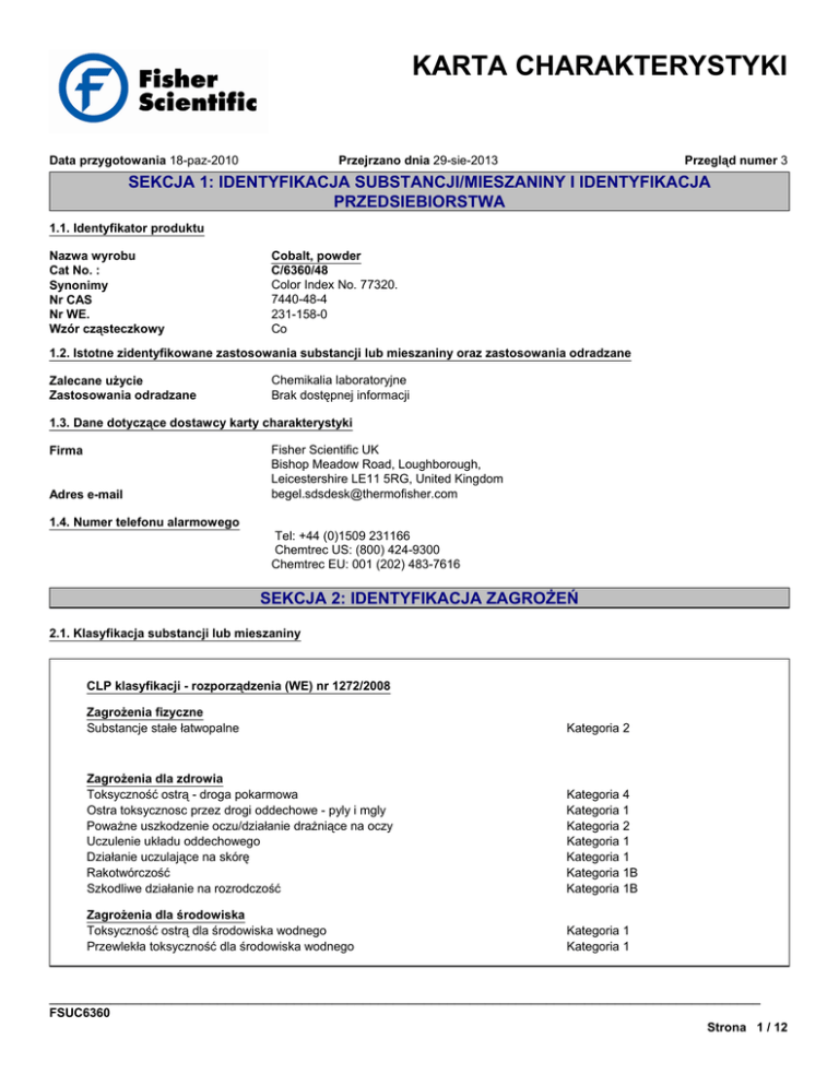 KARTA CHARAKTERYSTYKI Data przygotowania 18-paz-2010 Przejrzano dnia 29-sie-2013 Przegląd numer 3 SEKCJA 1: IDENTYFIKACJA SUBSTANCJI/MIESZANINY I IDENTYFIKACJA PRZEDSIEBIORSTWA 1.1. Identyfikator produktu Nazwa wyrobu Cat No. : Synonimy Nr CAS Nr WE. Wzór cząsteczkowy Cobalt, powder C/6360/48 Color Index No. 77320. 7440-48-4 231-158-0 Co 1.2. Istotne zidentyfikowane zastosowania substancji lub mieszaniny oraz zastosowania odradzane Zalecane użycie Zastosowania odradzane Chemikalia laboratoryjne Brak dostępnej informacji 1.3. Dane dotyczące dostawcy karty charakterystyki Firma Adres e-mail Fisher Scientific UK Bishop Meadow Road, Loughborough, Leicestershire LE11 5RG, United Kingdom [email protected] 1.4. Numer telefonu alarmowego Tel: +44 (0)1509 231166 Chemtrec US: (800) 424-9300 Chemtrec EU: 001 (202) 483-7616 SEKCJA 2: IDENTYFIKACJA ZAGROŻEŃ 2.1. Klasyfikacja substancji lub mieszaniny CLP klasyfikacji - rozporządzenia (WE) nr 1272/2008 Zagrożenia fizyczne Substancje stałe łatwopalne Kategoria 2 Zagrożenia dla zdrowia Toksyczność ostrą - droga pokarmowa Ostra toksycznosc przez drogi oddechowe - pyly i mgly Poważne uszkodzenie oczu/działanie drażniące na oczy Uczulenie układu oddechowego Działanie uczulające na skórę Rakotwórczość Szkodliwe działanie na rozrodczość Kategoria 4 Kategoria 1 Kategoria 2 Kategoria 1 Kategoria 1 Kategoria 1B Kategoria 1B Zagrożenia dla środowiska Toksyczność ostrą dla środowiska wodnego Przewlekła toksyczność dla środowiska wodnego Kategoria 1 Kategoria 1 _____________________________________________________________________________________________ FSUC6360 Strona 1 / 12 KARTA CHARAKTERYSTYKI Cobalt, powder Przejrzano dnia 29-sie-2013 _____________________________________________________________________________________________ SEKCJA 2: IDENTYFIKACJA ZAGROŻEŃ Klasyfikacja zgodnie z dyrektywami UE 67/548/EWG lub 1999/45/WE F - Produkt wysoce łatwopalny Symbol(e) T+ - Produkt bardzo toksyczny N - Produkt niebezpieczny dla środowiska R11 - Produkt wysoce łatwopalny Zwrot(y) R R49 - Może powodować raka w następstwie narażenia drogą oddechową R60 - Może upośledzać płodność R22 - Działa szkodliwie również po połknięciu R26 - Działa bardzo toksycznie również przez drogi oddechowe R36 - Działa drażniąco na oczy R42/43 - Może powodować uczulenie w następstwie narażenia drogą oddechową i w kontakcie ze skórą R50/53 - Działa bardzo toksycznie na organizmy wodne; może powodować długo utrzymujące się niekorzystne zmiany w środowisku wodnym Pelny tekst wyrazen R- i zdan H- o, których byla mowa w niniejszej sekcji, patrz sekcja 16 2.2. Elementy oznakowania Hasło ostrzegawcze Niebezpieczeństwo Zwroty wskazujące rodzaj zagrożenia H228 - Substancja stała łatwopalna H317 - Może powodować reakcję alergiczną skóry H334 - Może powodować objawy alergii lub astmy lub trudności w oddychaniu w następstwie wdychania H302 - Działa szkodliwie po połknięciu H330 - Wdychanie grozi śmiercią H319 - Działa drażniąco na oczy H350i - Wdychanie może spowodować raka H360F - Może działać szkodliwie na płodność H410 - Działa bardzo toksycznie na organizmy wodne, powodując długotrwałe skutki Zwroty wskazujące środki ostrożności P302 + P352 - W PRZYPADKU KONTAKTU ZE SKÓRĄ: Umyć dużą ilością wody z mydłem P210 - Przechowywać z dala od źródeł ciepła/iskrzenia/otwartego ognia/gorących powierzchni. Palenie wzbronione P304 + P340 - W PRZYPADKU DOSTANIA SIĘ DO DRÓG ODDECHOWYCH: wyprowadzić lub wynieść poszkodowanego na świeże powietrze i zapewnić warunki do odpoczynku w pozycji umożliwiającej swobodne oddychanie P310 - Natychmiast skontaktować się z OŚRODKIEM ZATRUĆ lub lekarzem P281 - Stosować wymagane środki ochrony indywidualnej P201 - Przed użyciem zapoznać się ze specjalnymi środkami ostrożności 2.3. Inne zagrożenia Brak dostępnej informacji. SEKCJA 3: SKŁAD/INFORMACJA O SKŁADNIKACH 3.1. Substancje _____________________________________________________________________________________________ FSUC6360 Strona 2 / 12 KARTA CHARAKTERYSTYKI Cobalt, powder Przejrzano dnia 29-sie-2013 _____________________________________________________________________________________________ Składniki Nr CAS Nr WE. Procent wagowy Cobalt, powder 7440-48-4 EEC No. 231-158-0 >95 CLP klasyfikacji rozporządzenia (WE) nr 1272/2008 Flam. Sol. 2 (H228) Resp. Sens. 1 (H334) Skin Sens. 1 (H317) Acute Tox. 4 (H302) Acute Tox. 1 (H330) Eye Irrit. 2 (H319) Carc. 1B (H350i) Repr. 1B (H360F) Aquatic Acute 1 (H400) Aquatic Chronic 1 (H410) 67/548/EEC klasyfikacji F; R11 Carc.Cat. 2; R49 Repr.Cat. 2; R60 T; R26 Xn; R22-42/43 Xi; R36 N; R50-53 Pelny tekst wyrazen R- i zdan H- o, których byla mowa w niniejszej sekcji, patrz sekcja 16 SEKCJA 4: ŚRODKI PIERWSZEJ POMOCY 4.1. Opis środków pierwszej pomocy Porady ogólne Przedstawić lekarzowi dołączoną Kartę Charakterystyki Substancji Niebezpiecznej. Wymagana jest natychmiastowa opieka medyczna. Kontakt z oczami Natychmiast płukać dużą ilością wody, także pod powiekami przynajmniej przez 15 minut. W przypadku kontaktu produktu z oczami niezwłocznie przemyć je dużą ilością wody i zasięgnąć pomocy lekarskiej. Kontakt przez skórę Natychmiast spłukać dużą ilością wody, nie krócej niż 15 minut. Wymagana jest natychmiastowa opieka medyczna. Połknięcie NIE prowokować wymiotów. Natychmiast wezwać lekarza lub powiadomić centrum zatruć. Wdychanie Przenieść na świeże powietrze. W przypadku trudności w oddychaniu, podać tlen. Nie stosowac sztucznego oddychania usta-usta w przypadku, kiedy ofiara polknela lub narazila sie substancja poprzez drogi oddechowe; zastosowac sztuczne oddycha przy pomocymedycznego urzadzenia do sztucznego oddychania. Wymagana jest natychmiastowa opieka medyczna. Zabezpieczenie dla udzielającego pierwszej pomocy Użyć środków ochrony osobistej. 4.2. Najważniejsze ostre i