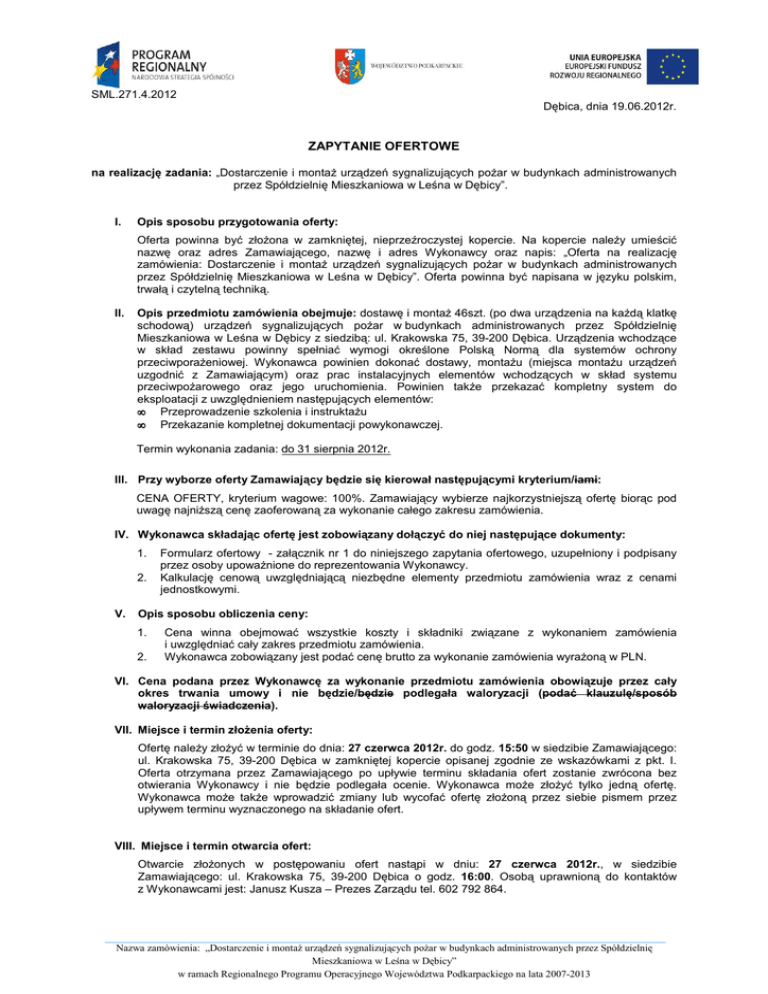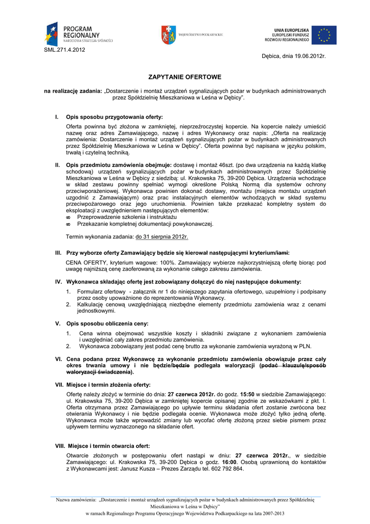 SML.271.4.2012 Dębica, dnia 19.06.2012r. ZAPYTANIE OFERTOWE na realizację zadania: „Dostarczenie i montaż urządzeń sygnalizujących pożar w budynkach administrowanych przez Spółdzielnię Mieszkaniowa w Leśna w Dębicy”. I. Opis sposobu przygotowania oferty: Oferta powinna być złożona w zamkniętej, nieprzeźroczystej kopercie. Na kopercie należy umieścić nazwę oraz adres Zamawiającego, nazwę i adres Wykonawcy oraz napis: „Oferta na realizację zamówienia: Dostarczenie i montaż urządzeń sygnalizujących pożar w budynkach administrowanych przez Spółdzielnię Mieszkaniowa w Leśna w Dębicy”. Oferta powinna być napisana w języku polskim, trwałą i czytelną techniką. II. Opis przedmiotu zamówienia obejmuje: dostawę i montaż 46szt. (po dwa urządzenia na każdą klatkę schodową) urządzeń sygnalizujących pożar w budynkach administrowanych przez Spółdzielnię Mieszkaniowa w Leśna w Dębicy z siedzibą: ul. Krakowska 75, 39-200 Dębica. Urządzenia wchodzące w skład zestawu powinny spełniać wymogi określone Polską Normą dla systemów ochrony przeciwporażeniowej. Wykonawca powinien dokonać dostawy, montażu (miejsca montażu urządzeń uzgodnić z Zamawiającym) oraz prac instalacyjnych elementów wchodzących w skład systemu przeciwpożarowego oraz jego uruchomienia. Powinien także przekazać kompletny system do eksploatacji z uwzględnieniem następujących elementów: • Przeprowadzenie szkolenia i instruktażu • Przekazanie kompletnej dokumentacji powykonawczej. Termin wykonania zadania: do 31 sierpnia 2012r. III. Przy wyborze oferty Zamawiający będzie się kierował następującymi kryterium/iami: CENA OFERTY, kryterium wagowe: 100%. Zamawiający wybierze najkorzystniejszą ofertę biorąc pod uwagę najniższą cenę zaoferowaną za wykonanie całego zakresu zamówienia. IV. Wykonawca składając ofertę jest zobowiązany dołączyć do niej następujące dokumenty: 1. 2. V. Formularz ofertowy - załącznik nr 1 do niniejszego zapytania ofertowego, uzupełniony i podpisany przez osoby upoważnione do reprezentowania Wykonawcy. Kalkulację cenową uwzględniającą niezbędne elementy przedmiotu zamówienia wraz z cenami jednostkowymi. Opis sposobu obliczenia ceny: 1. 2. Cena winna obejmować wszystkie koszty i składniki związane z wykonaniem zamówienia i uwzględniać cały zakres przedmiotu zamówienia. Wykonawca zobowiązany jest podać cenę brutto za wykonanie zamówienia wyrażoną w PLN. VI. Cena podana przez Wykonawcę za wykonanie przedmiotu zamówienia obowiązuje przez cały okres trwania umowy i nie będzie/będzie podlegała waloryzacji (podać klauzulę/sposób waloryzacji świadczenia). VII. Miejsce i termin złożenia oferty: Ofertę należy złożyć w terminie do dnia: 27 czerwca 2012r. do godz. 15:50 w siedzibie Zamawiającego: ul. Krakowska 75, 39-200 Dębica w zamkniętej kopercie opisanej zgodnie ze wskazówkami z pkt. I. Oferta otrzymana przez Zamawiającego po upływie terminu składania ofert zostanie zwrócona bez otwierania Wykonawcy i nie będzie podlegała ocenie. Wykonawca może złożyć tylko jedną ofertę. Wykonawca może także wprowadzić zmiany lub wycofać ofertę złożoną przez siebie pismem przez upływem terminu wyznaczonego na składanie ofert. VIII. Miejsce i termin otwarcia ofert: Otwarcie złożonych w postępowaniu ofert nastąpi w dniu: 27 czerwca 2012r., w siedzibie Zamawiającego: ul. Krakowska 75, 39-200 Dębica o godz. 16:00. Osobą uprawnioną do kontaktów z Wykonawcami jest: Janusz Kusza – Prezes Zarządu tel. 602 792 864. Nazwa zamówienia: „Dostarczenie i montaż urządzeń sygnalizujących pożar w budynkach administrowanych przez Spółdzielnię Mieszkaniowa w Leśna w Dębicy” w ramach Regionalnego Programu Operacyjnego Województwa Podkarpackiego na lata 2007-2013 IX. Informacje dotyczące zawarcia umowy: W terminie do 3 dni od dnia powiadomienia przez Zamawiającego o wyborze oferty Wykonawca, którego oferta została uznana za najkorzystniejszą w postępowaniu, jest zobowiązany do podpisania umowy. Zamawiający zastrzega sobie termin płatności za faktury Wykonawcy w terminie 14 dni. 19-06-2012r. ………………………………. (data, podpis) Załączniki: 1. Formularz ofertowy, 2. Wzór umowy. Nazwa zamówienia: „Dostarczenie i montaż urządzeń sygnalizujących pożar w budynkach administrowanych przez Spółdzielnię Mieszkaniowa w Leśna w Dębicy” w ramach Regionalnego Programu Operacyjnego Województwa Podkarpackiego na lata 2007-2013 SML.271.4.2012 Załącznik nr 1 do Zapytania ofertowego z dnia 19.06.2012r. OFERTA odpowiadając na zaproszenie do składania ofert na realizację zadania: „Dostarczenie i montaż urządzeń sygnalizujących pożar w budynkach administrowanych przez Spółdzielnię Mieszkaniowa w Leśna w Dębicy” I. Oferujemy wykonanie przedmiotu zamówienia, zgodnie z wymogami opisu przedmiotu zamówienia, za kwotę w wysokości: ………………………. PLN brutto (słownie: …………………………………………………… zł). II. Oświadczamy, że posiadamy kwalifikacje wymagane obowiązującymi przepisami do wykonania zamówienia. III. Oświadczamy, że posiadamy wiedzę i doświadczenie do prawidłowego wykonania zamówienia. IV. Oświadczamy, że dysponujemy odpowiednim potencjałem technicznym oraz osobami zdolnymi do wykonania zamówienia. V. Oświadczamy, że znajdujemy się w sytuacji ekonomicznej i finansowej umożliwiającej wykonanie zamówienia. VI. Oświadczamy, że osoby które będą uczestniczyć w wykonaniu zamówienia posiadają wszelkie wymagane ustawowo uprawnienia do prawidłowego wykonania zamówienia …………………………………………………… (data, podpis osoby/osób upoważnionych do reprezentowania Wykonawcy) ……………………………………….… (NIP, adres, Nazwa Wykonawcy) Załączniki: 1. …………………………………. 2. ……