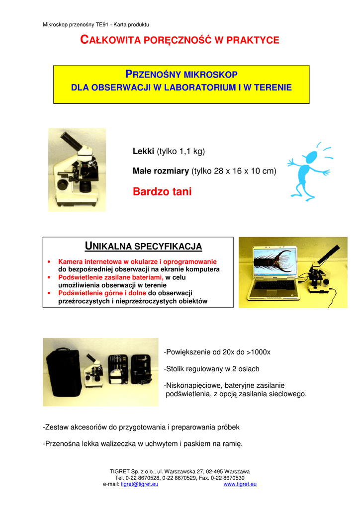 Mikroskop przenośny TE91 - Karta produktu CAŁKOWITA PORĘCZNOŚĆ W PRAKTYCE PRZENOŚNY MIKROSKOP DLA OBSERWACJI W LABORATORIUM I W TERENIE Lekki (tylko 1,1 kg) Małe rozmiary (tylko 28 x 16 x 10 cm) Bardzo tani UNIKALNA SPECYFIKACJA • • • Kamera internetowa w okularze i oprogramowanie do bezpośredniej obserwacji na ekranie komputera Podświetlenie zasilane bateriami, w celu umożliwienia obserwacji w terenie Podświetlenie górne i dolne do obserwacji przeźroczystych i nieprzeźroczystych obiektów -Powiększenie od 20x do >1000x -Stolik regulowany w 2 osiach -Niskonapięciowe, bateryjne zasilanie podświetlenia, z opcją zasilania sieciowego. -Zestaw akcesoriów do przygotowania i preparowania próbek -Przenośna lekka walizeczka w uchwytem i paskiem na ramię. TIGRET Sp. z o.o., ul. Warszawska 27, 02-495 Warszawa Tel. 0-22 8670528, 0-22 8670529, Fax. 0-22 8670530 e-mail: [email protected] www.tigret.eu Mikroskop przenośny TE91 - Karta produktu PRZENOŚNY MIKROSKOP DLA OBSERWACJI W LABORATORIUM I W TERENIE Przenośny laboratoryjny lub terenowy mikroskop ALL-IN PORTABLE MICROSCOPE jest lekkim, małych rozmiarów, bardzo praktycznym i łatwym w obsłudze urządzeniem, umożliwiającym obserwację i analizę małych obiektów zarówno w laboratorium jak i w terenie. Co więcej, przy niskiej cenie, mikroskop ten posiada bogato wyposażony zestaw akcesoriów, które na ogół dostępne są w znacznie droższych mikroskopach laboratoryjnych. Powiększenia ALL-IN PORTABLE MICROSCOPE wyposażony jest 3 obiektywy (4x, 10x i 40x) oraz 2 okulary (5x i 16x), w celu uzyskania powiększeń od 20x do 640x. Posiada również specjalny obiektyw Barlow, który umożliwia powiększenie przybliżenia w każdej kombinacji obiektyw-okular 2x. Ruchomy stolik Statyw mikroskopu jest wyposażony w stolik przesuwany w 2 osiach w płaszczyźnie poziomej przy użyciu pokręteł śrubowych. Podświetlenie ALL-IN PORTABLE MICROSCOPE ma dwa niezależne źródła światła (diody LED). Dolne oświetlenie umożliwia obserwacje obiektów transparentnych w świetle przechodzącym, natomiast górne oświetlenie umożliwia obserwację obiektów nieprzeźroczystych. Równoczesne oświetlenie dwoma źródłami światła jest również możliwe. Przy wykorzystaniu mikroskopu w warunkach laboratoryjnych, podświetlenie można zasilić z sieci 240V poprzez transformator umieszczony we wtyczce i redukujący napięcie do 5V. W odróżnieniu do wszystkich mikroskopów laboratoryjnych, mikroskop ALL-IN PORTABLE MICROSCOPE może być używany wszędzie i w każdym czasie, niezależnie od dostępu do sieci elektrycznej. Podświetlenie jest zasilane przez 3 baterie 1,5 V, umieszczone w oddzielnym uchwycie, podłączanym kablem do mikroskopu. 3 baterie zapewniają ciągłe oświetlenie przez więcej niż 2 tygodnie (po 24 godziny dziennie), co umożliwia wykonanie co najmniej 600 obserwacji po 30 minut każda! Bezpośrednia obserwacja obrazu na ekranie komputera Kolejnym ważnym elementem mikroskopu jest „MicrOcular” – kamera wbudowana w okular. Ta cyfrowa kamera wraz z okularem jest umieszczana w uchwycie mikroskopu i podłączana przez port USB do komputera w celu bezpośredniej obserwacji na ekranie komputera. Załączona płyta CD zawiera dwa oprogramowania: jedno do obserwacji żywych organizmów, drugie do rejestrowania obrazów w formie plików komputerowych. Akcesoria Mikroskop ALL-IN PORTABLE MICROSCOPE przechowywany jest w lekkiej przenośnej walizce z uchwytem i paskiem na ramię. Walizka posiada kieszenie, umieszczone po obu stronach, umożliwiające przechowywanie akcesoriów mikroskopu oraz innych, służących do przygotowania próbek. Unikalnymi akcesoriami są: *) plastykowe płytki odporne na łamanie, które eliminują problemy tradycyjnych szkiełek, *) specjalna płytka z podziałką, umożliwiająca pomiary długości i zliczanie organizmów, *) mini-filtr stosowany do koncentracji organizmów (np. planktonu) i/lub innych materiałów w zawiesinach (mini-filtr zawiera strzykawkę 10 ml i mały nylonowy filtr o porowatości 10 µm), *) przeźroczysty zbiorniczek obserwacyjny z 4 przegródkami, który może być umieszczony bezpośrednio na stoliku mikroskopu, *) mikronożyk do preparowania cienkich plastrów próbek miękkiego materiału biologicznego. TIGRET Sp. z o.o., ul. Warszawska 27, 02-495 Warszawa Tel. 0-22 8670528, 0-22 8670529, Fax. 0-22 8670530 e-mail: [email protected] www.tigret.eu