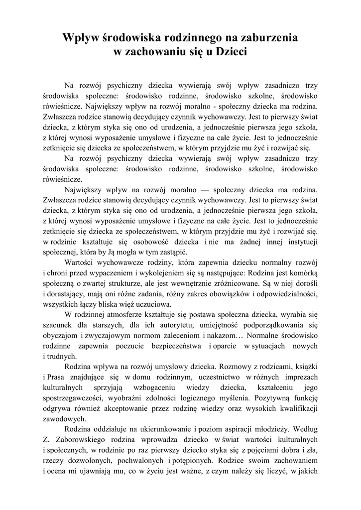 Wpływ środowiska rodzinnego na zaburzenia w zachowaniu się u Dzieci Na rozwój psychiczny dziecka wywierają swój wpływ zasadniczo trzy środowiska społeczne: środowisko rodzinne, środowisko szkolne, środowisko rówieśnicze. Największy wpływ na rozwój moralno - społeczny dziecka ma rodzina. Zwłaszcza rodzice stanowią decydujący czynnik wychowawczy. Jest to pierwszy świat dziecka, z którym styka się ono od urodzenia, a jednocześnie pierwsza jego szkoła, z której wynosi wyposażenie umysłowe i fizyczne na całe życie. Jest to jednocześnie zetknięcie się dziecka ze społeczeństwem, w którym przyjdzie mu żyć i rozwijać się. Na rozwój psychiczny dziecka wywierają swój wpływ zasadniczo trzy środowiska społeczne: środowisko rodzinne, środowisko szkolne, środowisko rówieśnicze. Największy wpływ na rozwój moralno — społeczny dziecka ma rodzina. Zwłaszcza rodzice stanowią decydujący czynnik wychowawczy. Jest to pierwszy świat dziecka, z którym styka się ono od urodzenia, a jednocześnie pierwsza jego szkoła, z której wynosi wyposażenie umysłowe i fizyczne na całe życie. Jest to jednocześnie zetknięcie się dziecka ze społeczeństwem, w którym przyjdzie mu żyć i rozwijać się. w rodzinie kształtuje się osobowość dziecka i nie ma żadnej innej instytucji społecznej, która by Ją mogła w tym zastąpić. Wartości wychowawcze rodziny, która zapewnia dziecku normalny rozwój i chroni przed wypaczeniem i wykolejeniem się są następujące: Rodzina jest komórką społeczną o zwartej strukturze, ale jest wewnętrznie zróżnicowane. Są w niej dorośli i dorastający, mają oni różne zadania, różny zakres obowiązków i odpowiedzialności, wszystkich łączy bliska więź uczuciowa. W rodzinnej atmosferze kształtuje się postawa społeczna dziecka, wyrabia się szacunek dla starszych, dla ich autorytetu, umiejętność podporządkowania się obyczajom i zwyczajowym normom zaleceniom i nakazom… Normalne środowisko rodzinne zapewnia poczucie bezpieczeństwa i oparcie w sytuacjach nowych i trudnych. Rodzina wpływa na rozwój umysłowy dziecka. Rozmowy z rodzicami, książki i Prasa znajdujące się w domu rodzinnym, uczestnictwo w różnych imprezach kulturalnych sprzyjają wzbogaceniu wiedzy dziecka, kształceniu jego spostrzegawczości, wyobraźni zdolności logicznego myślenia. Pozytywną funkcję odgrywa również akceptowanie przez rodzinę wiedzy oraz wysokich kwalifikacji zawodowych. Rodzina oddziałuje na ukierunkowanie i poziom aspiracji młodzieży. Według Z. Zaborowskiego rodzina wprowadza dziecko w świat wartości kulturalnych i społecznych, w rodzinie po raz pierwszy dziecko styka się z pojęciami dobra i zła, rzeczy dozwolonych, pochwalonych i potępionych. Rodzice swoim zachowaniem i ocena mi ujawniają mu, co w życiu jest ważne, z czym należy się liczyć, w jakich warunkach i w jakim stopniu. Rodzina wywiera także wpływ pośredni, selekcjonując wpływy zewnętrzne. To wszystko charakteryzuje rodzinę normalną, pozytywną, to jest taką, która chce, umie i ma warunki o spełniania swoich funkcji opiekuńczych i wychowawczych wobec dziecka. Zaburzenia w zachowaniu u dzieci i trudności, jakie występują wówczas w procesie wychowania, mają silny związek z atmosferą w rodzinie i z typami postaw rodzicielskich. Tak na przykład L. Kanner wyróżnił cztery typy postaw wiążąc je z charakterystycznymi reakcjami dziecka. Jedynie postawa akceptacji i uczucie przejawiające się w okazywaniu dziecku czułości w zajmowaniu się nim i w cierpliwym stosunku do niego sprzyja normalnemu rozwojowi osobowości wytwarzając poczucie bezpieczeństwa. Natomiast inne postawy, do których autor zalicza odtrącanie, perfekcjonizm i nadmierne chronienie, wpływają niekorzystnie na rozwój osobowości. przy postawie odrzucającej dzieci są zaniedbywane, a rodzice unikają z nimi kontaktów lub stosują surowe kary. Powoduje to zahamowanie rozwoju uczuć wyższych, agresywność i prowadzi do wykolejenia i przestępczości. Przy postawie perfekcjonistycznej ambicją rodziców jest wychowanie doskonałego człowieka. Stawiają oni dziecku wówczas nadmierne wymaganie, dezaprobują zwykle jego zachowanie, obwiniają, je bez uzasadnienia. Prowadzi to do braku zaufania we własne siły, stanów frustracyjnych, a nawet do obsesji. Postawa nadmiernie ochraniająca i opiekuńcza przejawia się bądź to w zbytniej pobłażliwości, bądź też w przytłaczaniu dziecka autorytetem. Rodzice rozpieszczają dziecko, dając mu stale do zrozumienia, że się dla niego poświęcają. Wtrącają się do wszystkich jego spraw, nie pozostawiając miejsca na jakiekolwiek samodzielne poczynanie. Konsekwencją takiej postawy jest opóźnienie dojrzałości i usamodzielnienia wskutek nadmiernej zależności od rodziców, a zwłaszcza od matki. Jednym z czynników powodującym niedostosowanie jest atmosfera rodzinna, a negatywne sytuacje w jej życiu wewnętrznym powodują: napięcia psychiczne; brak poczucia bezpieczeństwa; utrudnienie życia. Podobne stany powstają u dziecka na skutek: ostrych konfliktów między rodzicami, stwarzających poczucie stałej niepewności w domu; faktycznej dezintegracji rodziny, poczucie obcości (w szkole dziecko zachowuje się coraz gorzej); aktywnego udziału dziecka w rozwiązywaniu sytuacji konfliktowych rodziny, w kłótniach, próbach pozyskiwania dziecka przeciwko jednemu z rodziców; stałych awantur, przy niskim poziomie kulturowym środowiska, które z istnieniem dziecka w ogóle się nie liczy; alkoholizm rodziców, negatywnego wpływu takich sytuacji jak libacje, brak zainteresowania dzieckiem; egoistycznej postawy rodziców zapewniających wysoki standard materialny, ale z bezkrytycznym eksponowaniem tego stanu na zewnątrz; izolacji rodziców od otoczenia, zamknięcia się jedynie w kręgu rodziny; postaw rodziców reprezentujących odmienne od proponowanych przez szkołę tre