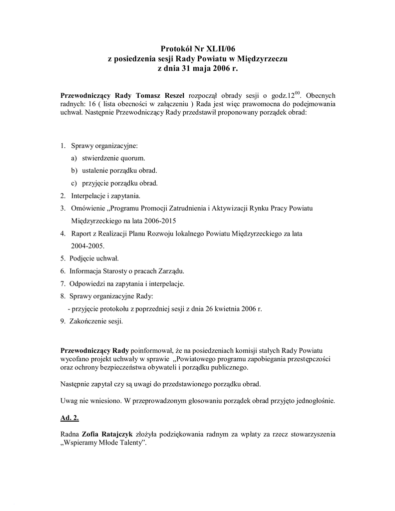 Protokół Nr XLII/06 z posiedzenia sesji Rady Powiatu w Międzyrzeczu z dnia 31 maja 2006 r. Przewodniczący Rady Tomasz Reszel rozpoczął obrady sesji o godz.1200. Obecnych radnych: 16 ( lista obecności w załączeniu ) Rada jest więc prawomocna do podejmowania uchwał. Następnie Przewodniczący Rady przedstawił proponowany porządek obrad: 1. Sprawy organizacyjne: a) stwierdzenie quorum. b) ustalenie porządku obrad. c) przyjęcie porządku obrad. 2. Interpelacje i zapytania. 3. Omówienie „Programu Promocji Zatrudnienia i Aktywizacji Rynku Pracy Powiatu Międzyrzeckiego na lata 2006-2015 4. Raport z Realizacji Planu Rozwoju lokalnego Powiatu Międzyrzeckiego za lata 2004-2005. 5. Podjęcie uchwał. 6. Informacja Starosty o pracach Zarządu. 7. Odpowiedzi na zapytania i interpelacje. 8. Sprawy organizacyjne Rady: - przyjęcie protokołu z poprzedniej sesji z dnia 26 kwietnia 2006 r. 9. Zakończenie sesji. Przewodniczący Rady poinformował, że na posiedzeniach komisji stałych Rady Powiatu wycofano projekt uchwały w sprawie „Powiatowego programu zapobiegania przestępczości oraz ochrony bezpieczeństwa obywateli i porządku publicznego. Następnie zapytał czy są uwagi do przedstawionego porządku obrad. Uwag nie wniesiono. W przeprowadzonym głosowaniu porządek obrad przyjęto jednogłośnie. Ad. 2. Radna Zofia Ratajczyk złożyła podziękowania radnym za wpłaty za rzecz stowarzyszenia „Wspieramy Młode Talenty”. Ad. 3. Przewodniczący Rady przekazał głos Pani Hannie Bułach Dyrektor Powiatowego Urzędu Pracy w Międzyrzeczu. Pani Dyrektor przedstawiła Programu Promocji Zatrudnienia i Aktywizacji Rynku Pracy Powiatu Międzyrzeckiego na lata 2006-2015 ( program w załączeniu do protokołu ). Radny Zbigniew Górny – w ofercie pracy jest informacja, że duża liczba ofert miejsc pracy jest spoza powiatu. Pani Dyrektor odpowiedziała, że zgłosiła się firma z Sulęcina, która utworzyła tam nowe miejsca pracy. Nie mogła znaleźć chętnych do jej podjęcia na tym terenie. Lokalizacja sprawia też że jest problem z dojazdem do miejsca pracy. Radna Zofia Ratajczyk zapytała czy ustawa o wolontariacie w jakimś sensie pomogła. Pani Dyrektor odpowiedziała, że w rodzinach bezrobotnych jest taka sytuacja, że głównym problemem jest brak pieniędzy. Przede wszystkim poszukiwana jest praca z wynagrodzeniem. Radna Zofia Plewa zapytała czy jest informacja ile osób bezrobotnych notorycznie uchyla się od pracy i chce posiadać status bezrobotnego tylko dla ubezpieczenia zdrowotnego. Z jednej strony mówi się o dużym bezrobociu a z drugiej strony pracodawcy poszukują pracowników. Pani Dyrektor odpowiedziała, że nie powinno łączyć się ubezpieczenia zdrowotnego ze statusem bezrobotnego. Niemniej jednak takie przepisy teraz funkcjonują. Ustawa daje jednak możliwość pozbawienia osoby bezrobotnej statusu na trzy miesiące w przypadku gdy: odmówi udziału w szkoleniach, odmówi udziału w pracach użyteczno społecznych. Poprzednio bezrobotny pozbawiany był statusu kiedy odrzucił dwie oferty pracy. Przepisy są teraz bardziej restrykcyjne. Radny Andrzej Frabiński zapytał o ile powinien wzrosnąć fundusz płac, żeby zatrzymać odchodzących z Powiatowego Urzędu Pracy pracowników. Pani Dyrektor odpowiedziała, że w roku bieżącym nie ma już możliwości dokonania takich zmian. Taka informacja zostanie przygotowana w najbliższym czasie. Przewodniczący Rady podziękował Pani Dyrektor za przedstawione informacje. Następnie ogłosił przerwę w obradach sesji ( godz.13 35 ) Posiedzenie sesji wznowiono o godz.1345. Przewodniczący Rady przekazał głos Dyrektorowi I Liceum Ogólnokształcącego w Międzyrzeczu Maciejowi Rębaczowi. Dyrektor Maciej Rębacz powiedział, że wypowiedzi radnego Dariusza Orzeszko oraz radnej Zofii Ratajczyk na poprzednim posiedzeniu sesji Rady Powiatu rażąco naruszają dobre imię I Liceum Ogólnokształcącego im. Heliodora Święcickiego. Nie może być tak, że wprowadza się wszystkich w błąd. Zarzuty radnego Orzeszko dotyczyły obchodów dnia otwartego 2 w szkole. W tym dniu szkoła miała być czynna od godz.1000 do godz.1200, a była od godz.830 do godz.1200. Poinformował, że do dni otwartych przygotowywano się solidnie. Przygotowana została prezentacja multimedialna na sali gimnastycznej pokazująca szkołę, system kształcenia oraz to czego wymaga się od kandydatów, żeby zostali przyjęci. Samorząd uczniowski zorganizował punkt informacyjny w którym rozdawano podania, regulamin przyjmowania do szkoły. Oprócz tego na trzech tablicach, na różnych kondygnacjach, zamieszczono informacje co zrobić i w jakim terminie, żeby zostać przyjętym. Ponadto w pracowniach przedmiotowych czekali na uczniów nauczyciele, którzy tłumaczyli na czym polega nauka w szkole i jakie programy realizuje. W sprawie wystąpienia na ostatniej sesji radnej Ratajczyk Dyrektor przedstawił rankingi osiągnięć uczniów szkoły z ostatnich lat ( w załączeniu do protokołu ). Obecny system nauczania umożliwia zmianę realizowania przez ucznia programu rozszerzonego nawet po dwóch latach nauki. Poinformował, że w tym roku Liceum Ogólnokształcące miało stypendystę Ministra Edukacji Narodowej. Dyrektor podkreślił, że konieczny jest remont szkoły. Podsumowując Dyrektor powiedział, że: „ Krytyka szkoły wynika z pobudek politycznych, osobistych i temu będziemy się przeciwstawiać”. Następnie odczytał i przekazał Przewodniczącemu Rady protest grona pedagogicznego Liceum Ogólnokształcącego przeciwko szerzeniu nieprawdziwych i niesprawdzonych informacji na temat organizacji dnia otwartego szkoły. Przewodniczący Rady powiedział, że Dyrektor nie powinien podważać autorytetu Przewodniczącego Komisji Edukacji, Kultury i Sportu. Następnie przekazał głos radnemu Dariuszowi Orzeszko. Radny Dariusz Orzeszko powiedział, że w swoim wystąpieniu nie naruszył dobrego imienia szkoły. Przytocz