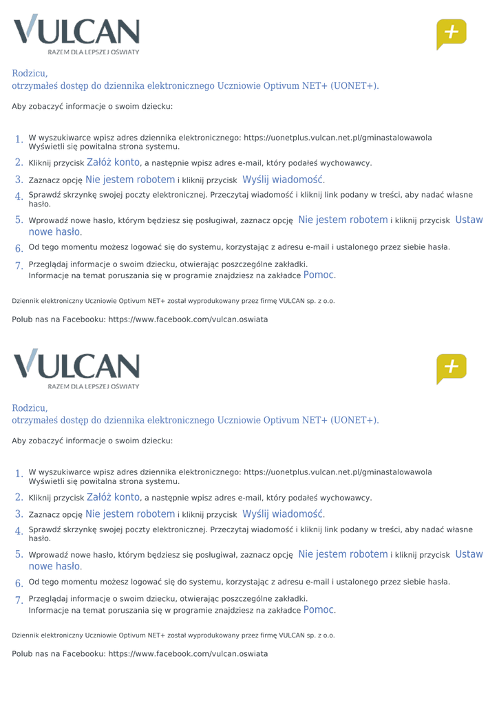 Rodzicu, otrzymałeś dostęp do dziennika elektronicznego Uczniowie Optivum NET+ (UONET+). Aby zobaczyć informacje o swoim dziecku: 1. W wyszukiwarce wpisz adres dziennika elektronicznego: https://uonetplus.vulcan.net.pl/gminastalowawola Wyświetli się powitalna strona systemu. 2. Kliknij przycisk Załóż konto, a następnie wpisz adres e-mail, który podałeś wychowawcy. 3. Zaznacz opcję Nie jestem robotem i kliknij przycisk Wyślij wiadomość. 4. Sprawdź skrzynkę swojej poczty elektronicznej. Przeczytaj wiadomość i kliknij link podany w treści, aby nadać własne hasło. 5. Wprowadź nowe hasło, którym będziesz się posługiwał, zaznacz opcję Nie jestem robotem i kliknij przycisk Ustaw nowe hasło. 6. Od tego momentu możesz logować się do systemu, korzystając z adresu e-mail i ustalonego przez siebie hasła. 7. Przeglądaj informacje o swoim dziecku, otwierając poszczególne zakładki. Informacje na temat poruszania się w programie znajdziesz na zakładce Pomoc. Dziennik elektroniczny Uczniowie Optivum NET+ został wyprodukowany przez firmę VULCAN sp. z o.o. Polub nas na Facebooku: https://www.facebook.com/vulcan.oswiata Rodzicu, otrzymałeś dostęp do dziennika elektronicznego Uczniowie Optivum NET+ (UONET+). Aby zobaczyć informacje o swoim dziecku: 1. W wyszukiwarce wpisz adres dziennika elektronicznego: https://uonetplus.vulcan.net.pl/gminastalowawola Wyświetli się powitalna strona systemu. 2. Kliknij przycisk Załóż konto, a następnie wpisz adres e-mail, który podałeś wychowawcy. 3. Zaznacz opcję Nie jestem robotem i kliknij przycisk Wyślij wiadomość. 4. Sprawdź skrzynkę swojej poczty elektronicznej. Przeczytaj wiadomość i kliknij link podany w treści, aby nadać własne hasło. 5. Wprowadź nowe hasło, którym będziesz się posługiwał, zaznacz opcję Nie jestem robotem i kliknij przycisk Ustaw nowe hasło. 6. Od tego momentu możesz logować się do systemu, korzystając z adresu e-mail i ustalonego przez siebie hasła. 7. Przeglądaj informacje o swoim dziecku, otwierając poszczególne zakładki. Informacje na temat poruszania się w programie znajdziesz na zakładce Pomoc. Dziennik elektroniczny Uczniowie Optivum NET+ został wyprodukowany przez firmę VULCAN sp. z o.o. Polub nas na Facebooku: https://www.facebook.com/vulcan.oswiata