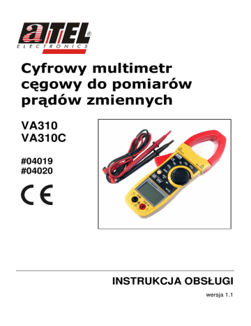 Cyfrowy multimetr cęgowy do pomiarów prądów zmiennych VA310 VA310C #04019 #04020 INSTRUKCJA OBSŁUGI wersja 1.1 VA310 / VA310C SPIS TREŚCI Wstęp ...................................................................................................................... 3 Bezpieczeństwo uŜytkowania ................................................................................. 3 1. Zawartość opakowania ....................................................................................... 4 2. Budowa urządzenia ............................................................................................ 4 4. Wykonywanie pomiarów ..................................................................................... 5 4.1. Pomiar napięcia przemiennego (AC) i stałego (DC) ................................... 5 4.2. Pomiar prądu przemiennego (AC) ............................................................... 5 4.3. Pomiar rezystancji ....................................................................................... 5 4.4. Pomiar temperatury (model VA310C) ........................................................ 6 4.5. Test diod półprzewodnikowych (model VA310) .......................................... 6 4.6. Test ciągłości obwodu ................................................................................. 6 5. Dokładności pomiarów ........................................................................................ 6 5.1. Pomiar napięcia stałego (DC)...................................................................... 6 5.2. Pomiar napięcia przemiennego (AC)........................................................... 6 5.3. Pomiar prądu przemiennego (AC) ............................................................... 7 5.4. Pomiar rezystancji ....................................................................................... 7 5.5. Pomiar temperatury ..................................................................................... 7 5.6. Test diod ...................................................................................................... 7 5.7. Test ciągłości obwodu ................................................................................. 7 6. Wymiana baterii .................................................................................................. 7 7. Składowanie zuŜytego sprzętu ........................................................................... 8 8. Specyfikacja techniczna...................................................................................... 8 2 VA310 / VA310C Wstęp Instrukcja obsługi dostarcza informacji dotyczących bezpieczeństwa i sposobu uŜytkowania, parametrów technicznych oraz konserwacji multimetru cyfrowego VA310 oraz VA310C. Multimetr ten moŜe być stosowany do następujących pomiarów: - napięcia stałego (DC) i przemiennego (AC); - prądu przemiennego (AC); - rezystancji; - temperatury (model VA310C); - kontroli ciągłości obwodu (z sygnalizacją dźwiękową); - diod półprzewodnikowych (model VA310). Bezpieczeństwo uŜytkowania Prezentowany przyrząd pomiarowy został zaprojektowany w trosce o bezpieczeństwo uŜytkownika i zapewnia poprawną pracę pod warunkiem przestrzegania zaleceń niniejszej instrukcji. Przyrząd spełnia wymagania dyrektyw UE oraz posiada deklarację zgodności CE producenta. Przed przystąpieniem do wykonywania pomiarów naleŜy zapoznać się z instrukcją obsługi, ze wszystkimi symbolami znajdującymi się na przyrządzie oraz z ich znaczeniem. W celu zapewnienia podstawowych wymogów bezpieczeństwa obsługi przyrządu naleŜy zastosować się do poniŜszych zasad: − Przyrząd naleŜy zabezpieczyć przed dostępem dzieci i osób niepowołanych. − JeŜeli przyrząd zostanie przeniesiony z miejsca o niŜszej temperaturze do miejsca o wyŜszej temperaturze, wówczas wewnątrz przyrządu moŜe się skroplić para wodna uniemoŜliwiając jego prawidłowe funkcjonowanie i dlatego naleŜy odczekać, aŜ wilgoć odparuje. − Przed przystąpieniem do konserwacji przyrządu i montaŜu elementów wymienialnych przyrządu takich jak: baterie, bezpieczniki i inne, naleŜy bezwzględnie odłączyć od przyrządu wszystkie przewody łączące z innymi urządzeniami. − Nie naleŜy przekraczać dopuszczalnych wartości pomiarowych mierzonej wielkości nie tylko ze względu na błędy pomiaru i moŜliwość uszkodzenia przetworników pomiarowych, ale przede wszystkim ze względów bezpieczeństwa uŜytkownika. − Zabrania się uŜywania przyrządu w obszarach duŜej wilgotności, zasolenia, działania oparów toksycznych, łatwopalnych lub Ŝrących. − Nie uŜywać przyrządu przy widocznych uszkodzeniach lub gdy przewody są uszkodzone lub zuŜyte. Przewody pomiarowe naleŜy wymienić na nowe o takich samych parametrach przekroju i izolacji, a przyrząd naleŜy oddać do autoryzowanego serwisu. − Przy pomiarach elektrycznych nie dotykać nie wykorzystanych gniazd i końcówek przyrządu. − Jeśli wartość pomiaru jest nieznana, pomiar naleŜy rozpocząć od największego zakresu pomiarowego. − W celu zmiany wielkości mierzonej, przed przełączeniem przełącznika naleŜy odłączyć końcówki pomiarowe. − Nie mierzyć rezystancji obwodów znajdujących się pod napięciem. − W przypadku pomiaru długich linii lub pojemności pomiar moŜe być wykonany dopiero po całkowitym rozładowaniu ładunku elektrostatycznego. Symbole i oznaczenia związane z bezpieczeństwem uŜytkowania znajdujące się na obudowie miernika: OSTRZEśENIE: Przed uruchomieniem przyrządu lub wykonaniem pomiaru naleŜy zapoznać się dokładnie z instrukcją obsługi. Nie zastosowanie się do tego polecenia moŜe spowodować uszkodzenie lub zniszczenie multimetru. Oznaczenie końcówek i wejść, na których moŜe występować napięcie o niebezpiecznej wartości. Podwójna izolacja (II klasa bezpieczeństwa). 3 VA310 / VA310C CE Zgodność z dyrektywami Uni