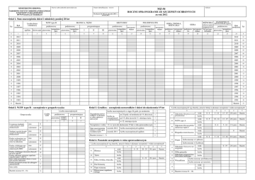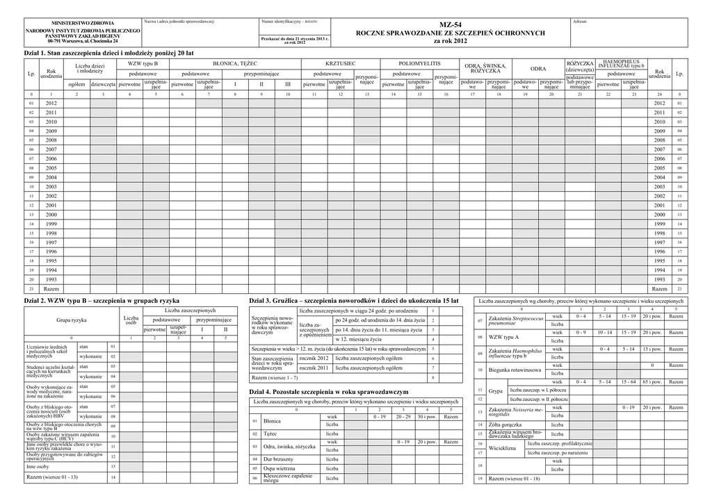 Nazwa i adres jednostki sprawozdawczej: MINISTERSTWO ZDROWIA Numer identyfikacyjny – REGON: NARODOWY INSTYTUT ZDROWIA PUBLICZNEGO PAŃSTWOWY ZAKŁAD HIGIENY 00-791 Warszawa, ul. Chocimska 24 Adresat: MZ-54 ROCZNE SPRAWOZDANIE ZE SZCZEPIEŃ OCHRONNYCH za rok 2012 Przekazać do dnia 21 stycznia 2013 r. za rok 2012 Dział 1. Stan zaszczepienia dzieci i młodzieży poniżej 20 lat WZW typu B Liczba dzieci i młodzieży Rok Lp. urodzenia ogółem podstawowe podstawowe uzupełniadziewczęta pierwotne uzupełniapierwotne jące jące 2 3 4 HAEMOPHILUS RÓŻYCZKA INFLUENZAE typu b (dziewczęta) Rok podstawowe podstawowe podstawowe urodzenia przypomiprzypomipodstawowe nające nające uzupełniauzupełniapodstawoprzypomipodstawoprzypomiuzupełnialub przypopierwotne pierwotne jące jące we nające we nające jące minające pierwotne BŁONICA, TĘŻEC 5 6 KRZTUSIEC przypominające 7 I II III 8 9 10 1 24 0 2012 01 02 2011 2011 02 03 2010 2010 03 04 2009 2009 04 05 2008 2008 05 06 2007 2007 06 07 2006 2006 07 08 2005 2005 08 09 2004 2004 09 10 2003 2003 10 11 2002 2002 11 12 2001 2001 12 13 2000 2000 13 14 1999 1999 14 15 1998 1998 15 16 1997 1997 16 17 1996 1996 17 18 1995 1995 18 19 1994 1994 19 20 1993 1993 20 21 Razem Razem 21 0 1 2 3 15 liczba zaszczepionych w ciągu 24 godz. po urodzeniu przypominające I II 4 5 Szczepienia noworodków wykonane w roku sprawozdawczym po 24 godz. od urodzenia do 14. dnia życia liczba zaszczepionych po 14. dniu życia do 11. miesiąca życia z opóźnieniem w 12. miesiącu życia 2 5 01 Szczepienia w wieku > 12. m. życia (do ukończenia 15 lat) w roku sprawozdawczym wykonanie 02 Studenci uczelni kształ- stan cących na kierunkach medycznych wykonanie 03 Stan zaszczepienia dzieci w roku sprawozdawczym 04 Osoby wykonujące zawody medyczne, narażone na zakażenie stan 05 wykonanie 06 Osoby z bliskiego otoczenia nosicieli (osób zakażonych) HBV stan 07 wykonanie 08 Osoby z bliskiego otoczenia chorych na wzw typu B Osoby zakażone wirusem zapalenia wątroby typu C (HCV) Inne osoby przewlekle chore o wysokim ryzyku zakażenia Osoby przygotowywane do zabiegów operacyjnych 11 12 liczba zaszczepionych ogółem 6 rocznik 2011 liczba zaszczepionych ogółem 7 0 1 wiek 01 Błonica 02 Tężec 03 Odra, świnka, różyczka 04 Dur brzuszny liczba Ospa wietrzna Kleszczowe zapalenie mózgu liczba Razem (wiersze 01 - 13) 14 06 2 3 4 5 0 - 19 20 - 29 30 i pow. Razem 07 Zakażenia Streptococcus pneumoniae 08 WZW typu A 09 Zakażenia Haemophilus influenzae typu b 10 Biegunka rotawirusowa 11 Grypa 12 13 liczba 14 liczba 15 wiek liczba liczba 0 - 19 20 i pow. Razem 21 22 23 Liczba zaszczepionych wg choroby, przeciw której wykonano szczepienie i wieku szczepionych wiek 16 17 2 3 4 5 5 - 14 15 - 19 20 i pow. Razem wiek 0-9 10 - 14 15 - 19 20 i pow. Razem 0-4 5 - 14 15 i pow. Razem 0 Razem 15 - 64 65 i pow. Razem 0 - 19 20 i pow. Razem liczba wiek liczba wiek liczba 0-4 5 - 14 liczba zaszczep. w I. półroczu liczba zaszczep. w II .półroczu Zakażenia Neisseria meningitidis Żółta gorączka Zakażenia wirusem brodawczaka ludzkiego Wścieklizna wiek liczba liczba liczba liczba zaszczep. profilaktycznie liczba zaszczep. po narażeniu wiek 18 19 1 0-4 liczba wiek Liczba zaszczepionych wg choroby, przeciw której wykonano szczepienie i wieku szczepionych 05 20 8 Dział 4. Pozostałe szczepienia w roku sprawozdawczym 13 19 0 4 Razem (wiersze 1 - 7) Inne osoby 18 3 rocznik 2012 09 10 17 1 stan Uczniowie średnich i policealnych szkół medycznych 16 Dział 3. Gruźlica – szczepienia noworodków i dzieci do ukończenia 15 lat Liczba zaszczepionych podstawowe pierwotne uzupełniające 14 Lp. 2012 Grupa ryzyka 13 ODRA 0 Liczba osób 12 ODRA, ŚWINKA, RÓŻYCZKA 01 Dział 2. WZW typu B – szczepienia w grupach ryzyka 11 POLIOMYELITIS liczba Razem (wiersze 01 - 18) Uwagi przekazującego dane: .............................................................................................................................. .............................................................................................................................. .............................................................................................................................. .............................................................................................................................. .............................................................................................................................. .............................................................................................................................. .............................................................................................................................. .............................................................................................................................. .............................................................................................................................. .............................................................................................................................. Instrukcja do sprawozdania Sprawozdanie jednostkowe sporządzają podmioty wykonujące działalność leczniczą udzielające ambulatoryjnych i stacjonarnych świadczeń zdrowotnych, biorące udział w szczepieniach ochronnych (obowiązkowych, zalecanych lub innych) lub przechowujące karty uodpornienia. Sprawozdanie sporządzane jest według stanu dokumentacji podstawowej w dniu 31 grudnia roku sprawozdawczego. Dział 1. Stan zaszczepienia dzieci i młodzieży poniżej 20 lat W sprawozdaniu jednostkowym podstawę wypełnienia tego działu stanowią wyłącznie karty uodpornienia. Wiersze 01-20 są przeznaczone do wykazania stanu zaszczepienia kolejnych roczników dzieci i młodzieży. Wiersz 21 jest przeznaczony na sumy liczb z poszczególnych rubryk - pełniące w sprawozdaniu funkcję kontrolną. Rubryki 2-3: Należy podać liczbę osób, których k