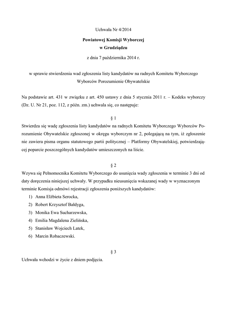 Uchwała Nr 4/2014 Powiatowej Komisji Wyborczej w Grudziądzu z dnia 7 października 2014 r. w sprawie stwierdzenia wad zgłoszenia listy kandydatów na radnych Komitetu Wyborczego Wyborców Porozumienie Obywatelskie Na podstawie art. 431 w związku z art. 450 ustawy z dnia 5 stycznia 2011 r. – Kodeks wyborczy (Dz. U. Nr 21, poz. 112, z późn. zm.) uchwala się, co następuje: §1 Stwierdza się wadę zgłoszenia listy kandydatów na radnych Komitetu Wyborczego Wyborców Porozumienie Obywatelskie zgłoszonej w okręgu wyborczym nr 2, polegającą na tym, iż zgłoszenie nie zawiera pisma organu statutowego partii politycznej – Platformy Obywatelskiej, potwierdzającej poparcie poszczególnych kandydatów umieszczonych na liście. §2 Wzywa się Pełnomocnika Komitetu Wyborczego do usunięcia wady zgłoszenia w terminie 3 dni od daty doręczenia niniejszej uchwały. W przypadku nieusunięcia wskazanej wady w wyznaczonym terminie Komisja odmówi rejestracji zgłoszenia poniższych kandydatów: 1) Anna Elżbieta Serocka, 2) Robert Krzysztof Bałdyga, 3) Monika Ewa Sucharzewska, 4) Emilia Magdalena Zielińska, 5) Stanisław Wojciech Latek, 6) Marcin Robaczewski. §3 Uchwała wchodzi w życie z dniem podjęcia. -2Uzasadnienie: W dniu 6 października 2014 r. Pełnomocnik Komitetu Wyborczego Wyborców Porozumienie Obywatelskie zgłosił w okręgu wyborczym nr 2 listę kandydatów do Rady Powiatu Grudziądzkiego, na której umieszczono nazwiska kandydatów: 1) Anna Elżbieta Serocka, 2) Robert Krzysztof Bałdyga, 3) Monika Ewa Sucharzewska, 4) Emilia Magdalena Zielińska, 5) Stanisław Wojciech Latek, 6) Marcin Robaczewski. W trakcie badania, czy zgłoszenie jest zgodne z wymaganiami ustawowymi, Komisja stwierdziła, że pomimo wniesienia o oznaczenie kandydatów nazwą partii – Platformy Obywatelskiej, do zgłoszenia nie dołączono pisma organu statutowego partii, potwierdzającej poparcie poszczególnych kandydatów umieszczonych na liście. Zapisy art. 425 § 6 Kodeksu wyborczego stanowią, iż w zgłoszeniu można wnosić o oznaczenie kandydatury nazwą lub skrótem nazwy partii politycznej popierającej kandydata, a fakt ten powinien być potwierdzony pisemnie przez właściwy statutowo organ partii. Z załączonej przez pełnomocnika wyborczego uchwały nr 4/2014 Rady w Powiecie Grudziądz M.P. Platformy Obywatelskiej R.P. z dnia 8 września 2014 r. w sprawie poparcia kandydatów Komitetu Wyborczego Wyborców Porozumienie Obywatelskie wynika wyłącznie poparcie listy kandydatów do Rady Powiatu Grudziądzkiego bez wyraźnego określenia (z imienia i nazwiska) osób, których poparcie dotyczy. Wobec powyższego Komisja postanowiła wezwać Pełnomocnika do usunięcia wady wyznaczając termin do jej usunięcia. Pouczenie: Zgodnie z art. 432 § 1 w związku z art. 450 ustawy z dnia 5 stycznia 2011 r. – Kodeks wyborczy (Dz. U. Nr 21, poz. 112, z późn. zm.) od niniejszej uchwały pełnomocnikowi przysługuje prawo odwołania do Komisarza Wyborczego w Toruniu, w terminie 3 dni od daty jej doręczenia.