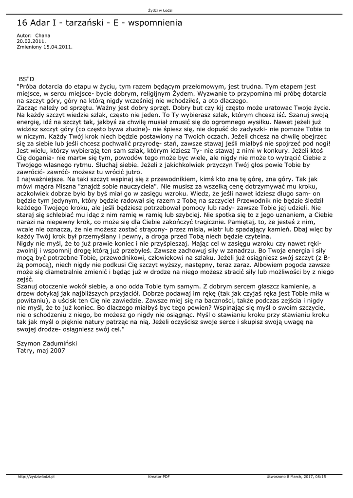 Żydzi w Łodzi 16 Adar I - tarzański - E - wspomnienia Autor: Chana 20.02.2011. Zmieniony 15.04.2011. BS"D "Próba dotarcia do etapu w życiu, tym razem będącym przełomowym, jest trudna. Tym etapem jest miejsce, w sercu miejsce- bycie dobrym, religijnym Żydem. Wyzwanie to przypomina mi próbę dotarcia na szczyt góry, góry na którą nigdy wcześniej nie wchodziłeś, a oto dlaczego. Zacząc należy od sprzętu. Ważny jest dobry sprzęt. Dobry but czy kij często może uratowac Twoje życie. Na każdy szczyt wiedzie szlak, często nie jeden. To Ty wybierasz szlak, którym chcesz iść. Szanuj swoją energię, idź na szczyt tak, jakbyś za chwilę musiał zmusić się do ogromnego wysiłku. Nawet jeżeli już widzisz szczyt góry (co często bywa złudne)- nie śpiesz się, nie dopuść do zadyszki- nie pomoże Tobie to w niczym. Każdy Twój krok niech będzie postawiony na Twoich oczach. Jeżeli chcesz na chwilę obejrzec się za siebie lub jeśli chcesz pochwalić przyrodę- stań, zawsze stawaj jeśli miałbyś nie spojrzeć pod nogi! Jest wielu, którzy wybierają ten sam szlak, którym idziesz Ty- nie stawaj z nimi w konkury. Jeżeli ktoś Cię dogania- nie martw się tym, powodów tego może byc wiele, ale nigdy nie może to wytrącić Ciebie z Twojego własnego rytmu. Słuchaj siebie. Jeżeli z jakichkolwiek przyczyn Twój głos powie Tobie by zawrócić- zawróć- możesz tu wrócić jutro. I najważniejsze. Na taki szczyt wspinaj się z przewodnikiem, kimś kto zna tę górę, zna góry. Tak jak mówi mądra Miszna "znajdź sobie nauczyciela". Nie musisz za wszelką cenę dotrzymywać mu kroku, aczkolwiek dobrze było by byś miał go w zasięgu wzroku. Wiedz, że jeśli nawet idziesz długo sam- on będzie tym jedynym, który będzie radował się razem z Tobą na szczycie! Przewodnik nie będzie śledził każdego Twojego kroku, ale jeśli będziesz potrzebował pomocy lub rady- zawsze Tobie jej udzieli. Nie staraj się schlebiać mu idąc z nim ramię w ramię lub szybciej. Nie spotka się to z jego uznaniem, a Ciebie narazi na niepewny krok, co może się dla Ciebie zakończyć tragicznie. Pamiętaj, to, że jesteś z nim, wcale nie oznacza, że nie możesz zostać strącony- przez misia, wiatr lub spadający kamień. Dbaj więc by każdy Twój krok był przemyślany i pewny, a droga przed Tobą niech będzie czytelna. Nigdy nie myśl, że to już prawie koniec i nie przyśpieszaj. Mając cel w zasięgu wzroku czy nawet rękizwolnij i wspomnij drogę którą już przebyłeś. Zawsze zachowuj siły w zanadrzu. Bo Twoja energia i siły mogą być potrzebne Tobie, przewodnikowi, człowiekowi na szlaku. Jeżeli już osiągniesz swój szczyt (z Bżą pomocą), niech nigdy nie podkusi Cię szczyt wyższy, następny, teraz zaraz. Albowiem pogoda zawsze może się diametralnie zmienić i będąc już w drodze na niego możesz stracić siły lub możliwości by z niego zejść. Szanuj otoczenie wokół siebie, a ono odda Tobie tym samym. Z dobrym sercem głaszcz kamienie, a drzew dotykaj jak najbliższych przyjaciół. Dobrze podawaj im rękę (tak jak czyjaś ręka jest Tobie miła w powitaniu), a uścisk ten Cię nie zawiedzie. Zawsze miej się na baczności, także podczas zejścia i nigdy nie myśl, że to już koniec. Bo dlaczego miałbyś byc tego pewien? Wspinając się myśl o swoim szczycie, nie o schodzeniu z niego, bo możesz go nigdy nie osiągnąc. Myśl o stawianiu kroku przy stawianiu kroku tak jak myśl o pięknie natury patrząc na nią. Jeżeli oczyścisz swoje serce i skupisz swoją uwagę na swojej drodze- osiągniesz swój cel." Szymon Zadumiński Tatry, maj 2007 http://zydziwlodzi.pl Kreator PDF Utworzono 8 March, 2017, 08:15