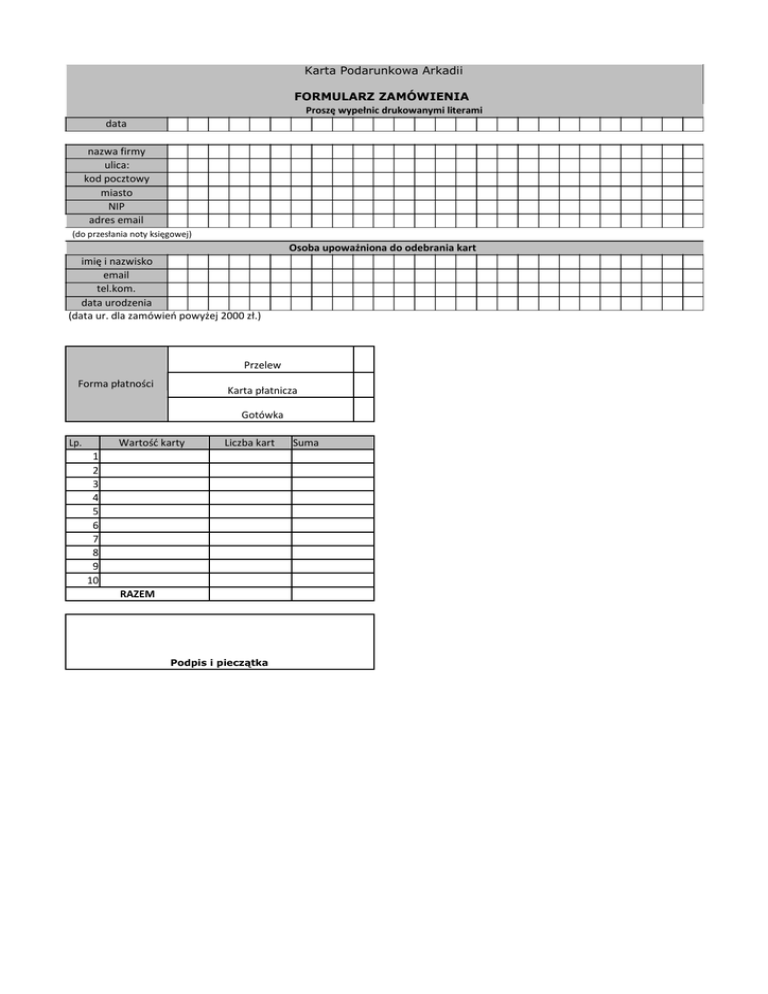Karta Podarunkowa Arkadii FORMULARZ ZAMÓWIENIA Proszę wypełnic drukowanymi literami data nazwa firmy ulica: kod pocztowy miasto NIP adres email (do przesłania noty księgowej) Osoba upoważniona do odebrania kart imię i nazwisko email tel.kom. data urodzenia (data ur. dla zamówień powyżej 2000 zł.) Przelew Forma płatności Karta płatnicza Gotówka Lp. Wartość karty Liczba kart 1 2 3 4 5 6 7 8 9 10 RAZEM Podpis i pieczątka Suma