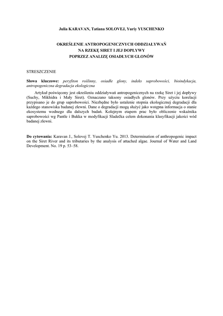 Julia KARAVAN, Tatiana SOLOVEJ, Yuriy YUSCHENKO OKREŚLENIE ANTROPOGENICZNYCH ODDZIAŁYWAŃ NA RZEKĘ SIRET I JEJ DOPŁYWY POPRZEZ ANALIZĘ OSIADŁYCH GLONÓW STRESZCZENIE Słowa kluczowe: peryfiton roślinny, antropogeniczna degradacja ekologiczna osiadłe glony, indeks saprobowości, bioindykacja, Artykuł poświęcony jest określeniu oddziaływań antropogenicznych na rzekę Siret i jej dopływy (Suchy, Mikhidra i Mały Siret). Oznaczano taksony osiadłych glonów. Przy użyciu korelacji przypisano je do grup saprobowości. Niezbędne było ustalenie stopnia ekologicznej degradacji dla każdego stanowiska badanej zlewni. Dane o degradacji mogą służyć jako wstępna informacja o stanie ekosystemu wodnego dla dalszych badań. Kolejnym etapem prac było obliczenie wskaźnika saprobowości wg Pantle i Bukka w modyfikacji Sladečka celem dokonania klasyfikacji jakości wód badanej zlewni. Do cytowania: Karavan J., Solovej T. Yuschenko Yu. 2013. Determination of anthropogenic impact on the Siret River and its tributaries by the analysis of attached algae. Journal of Water and Land Development. No. 19 p. 53–58.
